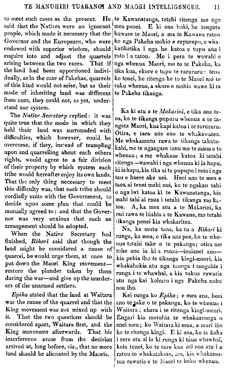 TE MANUHIRI TUARANGI AND MAORI INTELLIGENCER. 11 to meet such cases as the present. He said that the Natives were an ignorant people, which made it necessary that the Governor and the Europeans, who were endowed with superior wisdom, should enquire into and adjust the quarrels arising between the two races. That if the land had been apportioned indivi- dually, as in the case of Pakehas, quarrels of this kind would not arise, but as their mode of inheriting land was different from ours, they could not, as yet, under- stand our -system. The Native Secretary replied: it was quite true that the mode in which they held their land was surrounded with difficulties, which however, could be overcome, if they, instead of trampling upon and quarrelling about each others rights, would agree to a fair division of their property by which system each tribe would hereafter enjoy its own lands. That the only thing necessary to meet this difficulty was, that each tribe should cordially unite with the Government, to decide upon some plan that could be mutually agreed to: and that the Gover- nor was very anxious that such an arrangement should be adopted. When the Native Secretary had finished, Rihari said that though the land might be considered a cause of quarrel, he would urge them, at once to put down the Maori King movement— restore the plunder taken by them during the war—and give up the murder- ers of the unarmed settlers. Epiha stated that the land at Waitara was the cause of the quarrel and that the King movement was not mixed up with it. That the two questions should be considered apart, Waitara first, and the King movement afterwards. That his interference arose from the decision arrived at, long before, viz., that no more land should be alienated by the Maoris. te Kawanatanga, tetahi ritenga mo nga mea penei. E ki ana hoki, he tangata kuware te Maori, a ma te Kawana ratou ko nga Pakeha mohio e rapurapu, e wha- katikatika i nga he katoa e tupu ana i roto i a tatou. Me i pera te wawahi o nga whenua Maori, me to te Pakeha, ka tika koa, ekore e tupu te raruraru: tena ko tenei, he ritenga ke to te Maori mo te tuku whenua, a ekore e mohio wawe ki ta te Pakeha tikanga. Ka ki atu a te Makarini, e tika ana te- na, ko te tikanga pupuru whenua a te ta- ngata Maori, kua kapi katoa i te raruraru. Otira, e taea aria ano te whakawatea. Me whakamutu rawa te tikanga takata- kahi, me te ngangare tonu mo te mana o te whenua; a me whakaae katoa ki tetahi ritenga—wawahi i nga "whenua ki ia hapu, ki ia hapu, kia tika ai te pupuru i roto i nga tau e haere ake nei. Heoi ano te mea e taea. ai tenei mahi nui, ko te ngakau tahi o nga iwi katoa ki te Kawanatanga, kia mahi tahi ai raua i tetahi tikanga mo ka- toa. A, ka mea atu a te Makarini, ka nui rawa te hiahia a te Kawana, mo tetahi tikanga penei kia whakaritea. Na, ka mutu tana, ka tu a Rihari ki runga, ka mea, e tika ana pea, ko te whe- nua tetahi take o te pakanga; otira me tohe ano ia ki a ratou—inaianei ano— kia pehia iho te tikanga kingi-maori, kia whakahokia atu nga taonga i tangohia i runga i te whawhai, a kia tukua rawatia atu nga kai kohuru i nga Pakeha noho noa iho. Kei runga ko Epiha; e mea ana, heoi ano te take o te pakanga, ko te whenua i Waitara; ehara i te ritenga king-Maori, Engari kia motuhia te whakaaronga o enei mea; ko Waitara ki mua, a muri iho ko te ritenga kingi. E ki ana, ko te kaha i rere atu ai ia ki runga ki taua whawhai, koia tenei, ko te ture kua oti noa atu i a ratou te whakatakoto, ara, kia whakamu- tua rawatia e te Maori te hoko whenua.