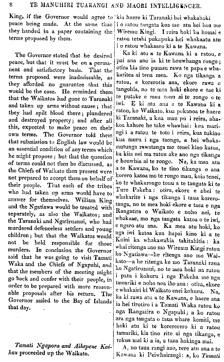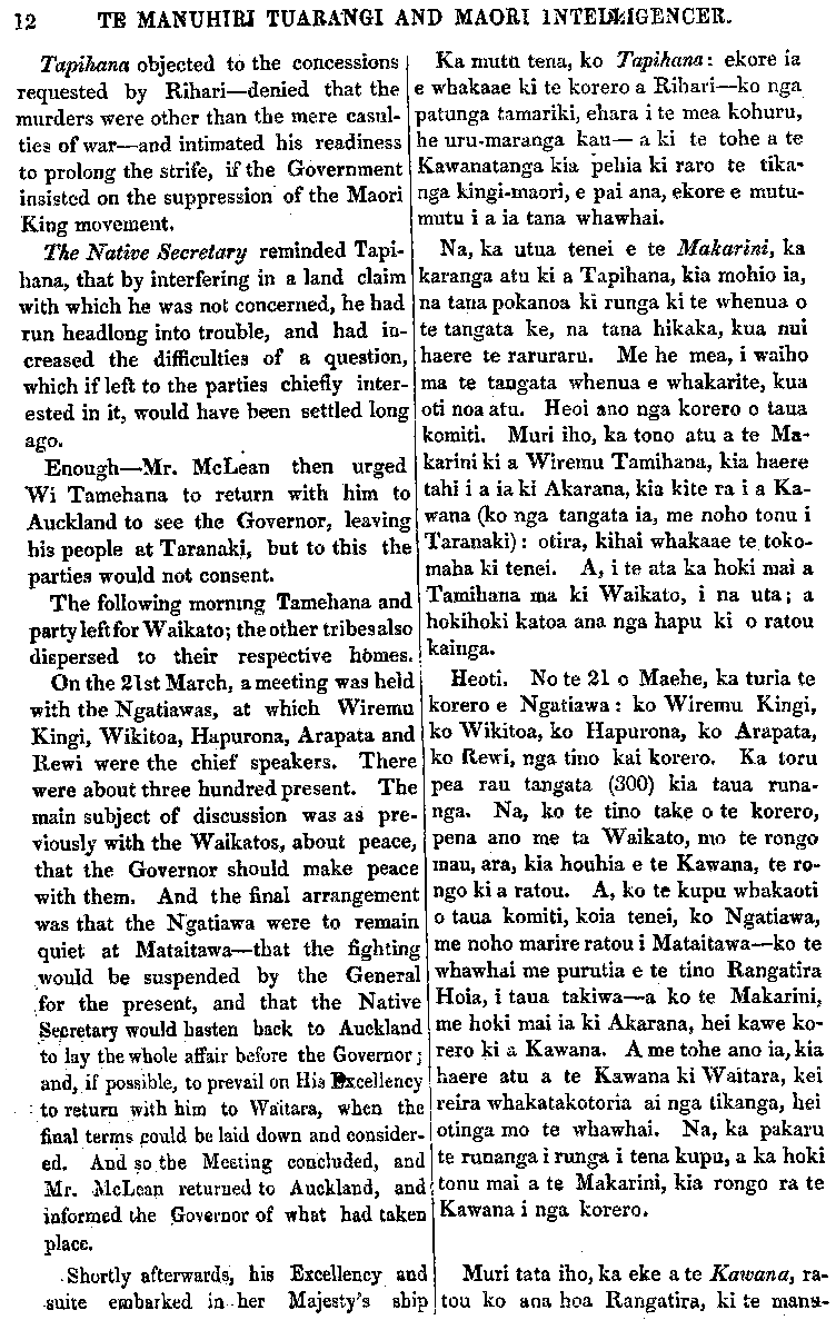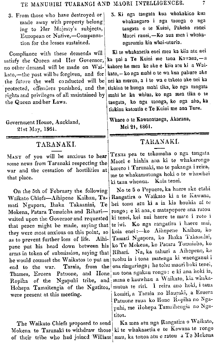 TE MANUHIRI TUARANGI AND MAORI INTELLIGENCER. 3. From those who have destroyed or made away with property belong ing to Her Majesty's subjects, European or Native,—Compensa- tion for the losses sustained. Compliance with these demends will satisfy the Queen and Her Governor, no other demand will be made on Wai- kato,—the past will be forgiven, and for the future the well conducted will be protected, offenders punished, and the rights and privileges of all maintained by the Queen and her Laws. Government House, Auckland, 21st May, 1861. TARANAKI. MANY of you will be anxious to hear some news from Taranaki respecting the war and the cessation of hostilities at that place. On the 5th of February the following Waikato Chiefs—Aihi pe ne Kaihau, Ta- mati Ngapora, Ihaka Takaanini, Te Mokena, Patara Tomaioha and Rihari— waited upon the Governor and requested that peace might be made, saying that they were most anxious on this point, so as to prevent further loss of life. Aihi- pene put his head down between his arms in token of submission, saying that he would counsel the Waikatos to put an end to the war. Taraia, from the Thames, Eruera Patuone, and Hone Ropiha of the Ngapuhi tribe, and Hohepa Tamaitengia of the Ngatitoa, were present at this meeting. The Waikato Chiefs proposed to send Mokena to Taranaki to withdraw those of their tribe who had joined William 5. Ki nga tangata kua whakakino kua whakangaro i nga taonga o nga tangata o te Kuini, Pakeha ranei Maori ranei,—Ko aua mea i whaka- ngaromia kia whai-uturia. Ki te whakaaetia enei mea ka kiia atu nei ka pai a Te Kuini me tana Kawana,—a kahore he mea ke ake e kiia atu ki a Wai- kato,—ko nga mahi o te wa kua pahure ake nei ka murua, a i to wa e takoto ake nei ka tiakina te hunga mahi tika, ko nga tangata mahi he ka whiua, ko nga mea tika o te tangata, ko nga taonga, ko nga aha, ka tiakina katoatia e Te Kuini me ana Ture. Whare o te Kawanatanga, Akarana, Mei 21, 1861. TARANAKI. TENEI pea te tokomaha o nga tangata Maori e hiahia ana ki te whakarongo korero i Taranaki, mo te pakanga i reira; me te whakamutunga hold o te whawhai ki taua whenua. Koia tenei. No te 5 o Pepuere, ka haere ake etahi Rangatira o Waikato ki a te Kawana, I hei tonu atu ki a ia kia houhia ai te rongo; e ki ana, e matapopore ana ratou ki tenei, kei nui haere te mate i roto i te iwi. Ko nga rangatira i haere mai, koia enei:—ko Aihepene Kaihau, ko Tamati Ng-apora, ko Ihaka Takaanini, ko Te Mokena, ko Patara Tomaioha ko Rihari. Na, ka tahuri a Aihepene, ka tuohu ia i tona matenga ki waenganui 1 ona ringaringa; he tohu maori hoki tenei, mo tona ngakau rongo: e ki ana hoki ia, mana e kauwhau a Waikato, kia whaka- mutua te riri. I reira ano hoki, i taua komiti, a Taraia no Hauraki, a Eruera 'Patuone raua ko Hone Ropiha no Nga- puhi, me Hohepa Tamaihengia RO Ngati toa. Ka mea atu nga Rangatira o Waikato, ki te whakaaetia e te Kawana te rongo mau, ka tonoa atu e ratou a Te Mokena