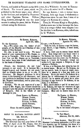 TE MANUHIRI TUARANGI AND MAORI INTELLIGENCER. 13 Victoria, and landed at Taranaki on the 27th of March. The term's of peace, which we published in the former paper,, were offered by the Governor, and accepted by Hapurona and other Ngatiawa Natives. William King, however, although he was the most earnest in asking for peace, left for Waikato without seeing the Governor. Te Kawao, Kaipara, April 50. 1861. To the Governor. SIR,—We salute you, the father of all people, of the Maories and Pakehas of this island of New Zealand. Sir, this is our word to you. We have heard of your instructions to Mr. Rogan, to go up to Taranaki. This is our message to you: Let not Mr. Rogan go to Taranaki, but rather leave him to the inhabitants and to the lands of Kaipara. Friend, the Governor, do not look wrongly at our word. It is because Mr. Rogan is good, and because we are good, that no trouble arises to us, or ro you, O Governor. Mr. Rogan's goodness to us is (seen) in bis listening to our discourse: and our goodness is (manifest) in our attention to Mr. Rogan's instructions, and to yours also, O Governor. Enough. We do not approve of a suc- cessor to Mr. Rogan, lest trouble should be brought upon the people, and upon the lands of Kaipara. This is the whole of our message to you. From PAIKEA TE HEKENA, WIREMU TIPENE, TAMATI REWETI, PAIRAMA TE RORU, ARAMA KARAKA, MATITIKUHA, From the entire people of Kaipara. REPLY TO KAIPARA NATIVES ABOUT MR. ROGAN. FRIENDS, TENA KOUTOU,—— The Governor has seen your letter of the 30th of April about Mr. Rogan, that he should not go away to Taranaki. The wao, ki a Wikitoria: ka rere ki Tarana- ki, a ka u ki reira i te 27 o Maehe. Ko nga korero, i taia e matou i tera Niupepa, koia nga kupu i whakaaetia e Hapurona ratou ko ana hoa, i mau ai te rongo a te Kawana ki a ratou Tena, ko Wiremu Kingi te Rangitake, ahakoa nana ano te tino karanga kia hou- hia ai te rongo—kihai tena tangata i no- ho kia kite i a te Kawana, otira, tahuti ana ia ki Waikato. Te Kawao. Kaipara, Aperira 30, 1861. E KARA, E TE KAWANA,— Tena ko koe, te matua o nga iwi katoa, o nga Maori, o nga Pakeha, o tenei motu, o Niu Tireni. E kapa, tenei ano ta matou kupu atu ki a koe. Kua rongo mai i tau kupu tono i a Te Rokena kia haere ki Taranaki Ko ta matou kupu tenei ki a koe—ko Te Rokena, kaua ia e haere ki Taranaki: erangi me waiho ia ki nga tangata o Kaipara, ki nga whenua o Kaipara. E hoa, e te Kawana, kei titiro he koe ki ta matou kupu. He pai no Te Rokena, he pai no matou, koia te tupu ai tetahi raru- raru ki a matou, ki a koe ano hoki, e te Kawana. Ko te pai tenei o Te Rokena ki a matou, ko te whakarongo ki a matou nei korero: ko to matou pai tenei, ko te wha- karongo ki nga korero a Te Rokena, ki au hoki, e te Kawana. Heoi, ekore matou e pai ki to muri atu i a Te Rokena, kei tupu he raruraru ki nga tangata o Kaipara, ki nga whenua hoki o Kaipara. Heoi ano ta matou kupu atu ki a koe. Na PAIKEA TE HEKENA, WIREMU TIPENE, TAMATI REWETI, PAIRAMA TE ROKU, ARAMA KARAKA, MATITIKUHA, Na Ie iwi katoa o Kaipara. Te Tari Maori, Akarana, Mei 23, 1861. E HOA MA,— Tena koutou. Kua kite a te Kawana i ta koutou pukapuka o te 50 o nga ra o Aperira, mo Te Rokena, kia kaua ia e haere atu ki Taranaki E koa ana a te