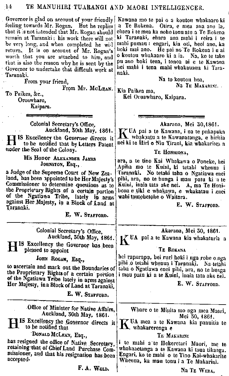 14 TE MANUHIRI TUARANGI AND MAORI INTELLIGENCER. Governor is glad on account of your friendly feeling towards Mr. Rogan. But he replies that it is not intended that Mr. Rogan should remain at Taranaki: his work there will not be very long, and when completed he will return. It is on account of Mr. Rogans worth that you are attached to him, and that. is also the reason why he is sent by the Governor to undertake that difficult work at Taranaki From your friend, From Mr. McLean To Paikea, &c., Oroawharo, Kaipara. Colonial Secretary's Office, Auckland, 30th May. 1861. HIS Excellency the Governor directs it to be notified that by Letters Patent under the Seal of the Colony. His Honor ALEXANDER JAMES JOHNSTON, Esq., a Judge of the Supreme Court of New Zea- land, has been appointed to be Her Majesty's Commissioner to determine questions as to the Proprietary Rights of a certain portion of the Ngatiawa Tribe, lately in arms against Her Majesty in a Block of Land at Taranaki E. W. STAFFORD. Colonial Secretary's Office, Auckland, 50th May, 1861. HIS Excellency the Governor has been pleased to appoint JOHN ROGAN, Esq,, to ascertain and mark out the Boundaries of the Proprietary Rights of a certain portion of the Ngatiawa Tribe lately in arms against Her Majesty, in a Block of Land at Taranaki, E. W. STAFFORD. Office of Minister for Native Affairs, Auckland, 50th May, 1861. HIS Excellency the Governor directs it to be notified, that DONALD MCLEAN, Esq., has resigned the office of Native Secretary, retaining that of Chief Land Purchase Com- missioner, and that his resignation has been accepted- - . F.A. WELD. Kawana mo te pai o a koutou whakaaro ki a Te Rokena. Otira, e mea ana ano ia, ehara i te mea ka noho tonu atu a Te Rokena ki Taranaki, ehara ana mahi i reira i te mahi pumau: engari, kia oti, heoi ano, ka hoki mai ano. He pai no Te Rokena i u ai o koutou whakaaro ki a ia. Na, ko te take pu ano hoki tena, i tonoa ai e te Kawana hei mahi i tena mahi whakauaua ki Tara- naki. Na to koutou hoa, Na TE MAKARINI Kia Paikea ma, Kei Oruawharo, Kaipara. Akarana, Mei 50, 1861. KUA pai a te Kawana, i na te pukapuka whakaatu a te Kawanatanga, e hiritia nei ki te Hiri o Niu Tireni, kia whakaritea a TE HONIHONA, ara, a te tino Kai Whakawa o Poneke, hei .Apiha mo te Kuini, ki tetahi whenua i Taranaki. No tetahi taha o Ngatiawa enei pihi, ara, no te hunga i mau patu ki a te Kuini, inaia tata ake ne!. A, ma Te Honi- hona e tiki e whakawa, e whakatau i enei wahi tautohetohe o Waitara. E. W. STAFFORD. Akarana, Mei 30, 1861. KUA pai a te Kawana kia whakaturia a TE ROKANA hei rapurapu, hei ruri hoki i nga rohe o nga pihi o tetahi whenua i Taranaki. Na tetahi taha o Ngatiawa enei pihi, ara, no te hunga i mau patu ki a te Kuini, inaia tata ake nei. E. W. STAFFORD. Whare o te Minita mo nga mea Maori, Mei 50, 1861 KUA mea a te Kawana kia panuitia te whakarerenga e TE MAKARINI i te mahi a te Hekeretari Maori, me te whakaaetanga a te Kawana ki taua tikanga. Engari, ko te mahi o te Tino Kaiwhakarite Whenua, ka mau tonu i a Te Makarini. Na TE WERA