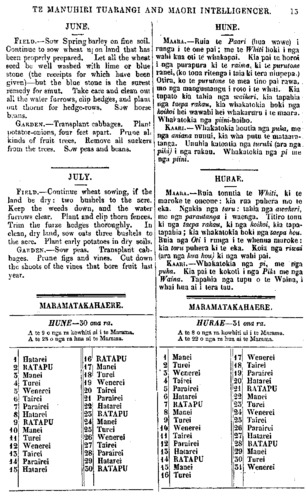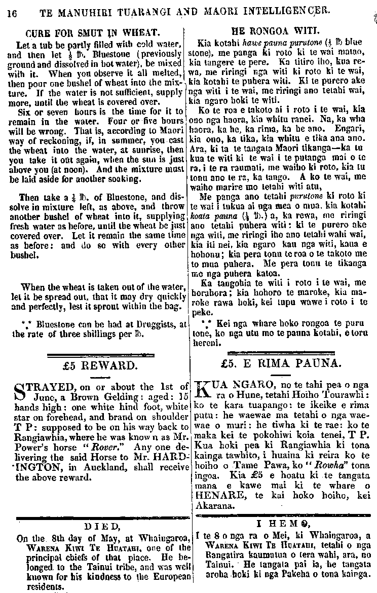 16 TE MANUHIRI TUARANGI AND MAORI INTELLIGENCER. CURE FOR SMUT IN WHEAT. Let a tub be partly filled with cold water, and then let 1/2 lb. Bluestone (previously ground and dissolved in hot water), be mixed with it. When you observe it all melted, then pour one bushel of wheat into the mix- ture. If the water is not sufficient, supply more, until the wheat is covered over. Six or seven hours is the lime for it to remain in the water. Four or five hours will be wrong. That is, according to Maori way of reckoning, if, in summer, you cast the wheat into the water, at sunrise, then you take it out again, vvhen the sun is just above you (at noon). And the mixture must be laid aside for another soaking. Then take a 1/4 lb. of Bluestone, and dis- solve in mixture left, as above, and throw another bushel of wheat into it, supplying fresh water as before, until the wheat be just covered over. Let it remain the same lime as before: and do so with every other bushel. When the wheat is taken out of the water, let it be spread out, that it may dry quickly and perfectly, lest it sprout within the bag. *.* Bluestone can be had at Druggists, at the rate of three shillings per Ib. £5 REWARD. STRAYED, on or about the 1st of June, a Brown Gelding: aged: 15 hands high: one white hind foot, white star on forehead, and brand on shoulder T P: supposed to be on his way back to Rangiawhia, where he was known as Mr. Power's horse " Rover" Any one de- livering the said Horse to Mr. HARD- INGTON, in Auckland, shall receive the above reward. D I E D, On the 8th day of May, at Whaingaroa, WARENA KIWI TE HUATAHI, one of the principal chiefs of that place. He be- longed. to the Tainui tribe, and was well known for his kindness to the European residents. HE RONGOA WITI. Kia kotahi hawe pauna purutone 1/2 lb blue stone), me panga ki roto ki te wai matao, kia tangere te pere. Ka titiro iho, kua re- wa, me riringi nga witi ki roto ki te wai, kia kotahi te puhera witi. Ki te purero ake nga witi i te wai, me riringi ano tetahi wai, kia ngaro hoki te witi. Ko te roa e takoto ai i roto i te wai, kia ono nga haora, kia whitu ranei. Na, ka wha haora, ka he, ka rima, ka he ano. Engari, kia ono, ka tika, kia whitu e tika ana ano. Ara, ki ta te tangata Maori tikanga—ka tu kua te witi ki te wai i te putanga mai o te ra, i te ra raumati, me waiho ki roto, kia tu tonu ano te ra, ka tango. A ko te wai, me waiho marire mo tetahi witi atu, Me panga ano tetahi purutone ki roto ki te wai i tukua ai nga mea o mua. kia kotahi koata pauna (1/4 Ib.) a, ka rewa, me riringi ano tetahi puhera witi: ki te purero ake nga witi, me riringi iho ano tetahi wahi wai, kia iti nei, kia ngaro kau nga witi, kaua e hohonu; kia pera tonu te roa o te takoto me to mua puhera. Me pera tonu te tikanga mo nga puhera katoa. Ka tangohia te witi i roto i te wai, me horahora; kia hohoro te maroke, kia ma- roke rawa hoki, kei tupu wawe i roto i te peke. *,* Kei nga whare hoko rongoa te puru tone, ko nga utu mo te pauna kotahi, e toru hereni. £5. E RIMA PAUNA. KUA NGARO, no te tahi pea o nga ra o Hune, tetahi Hoiho Tourawhi: ko te kara tuapango: te ikeike e runa putu: he waewae ma tetahi o nga wae- wae o muri: he tiwha ki te rae: ko te maka kei .te pokohiwi koia tenei, T P. Kua hoki pea ki Rangiaohia ki tona kainga tawhito, i huaina ki reira ko te hoiho o Tame Pawa, ko "Rowha" tona ingoa. Kia 5 pounds e hoatu ki te tangata mana e kawe mai ki te whare o HENARE, te kai hoko hoiho, kei Akarana. I H E M O, I te 8 o nga ra o Mei, ki Whaingaroa, a WARENA KIWI TE HUATAHI, tetahi o nga Rangatira kaumatua o tera wahi, ara, no Tainui. He tangata pai ia, he tangata aroha hoki ki nga Pakeha o tona kainga.