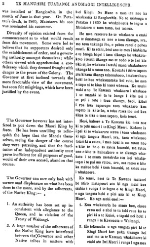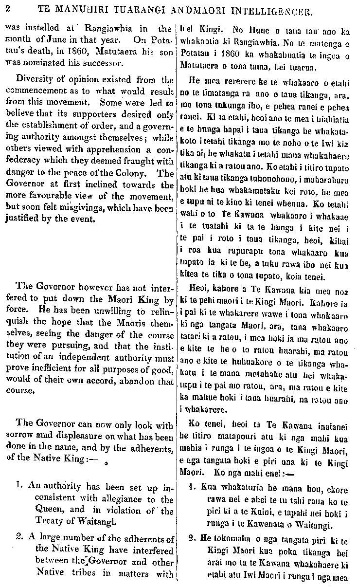 2 TE MANUHIRI TUARANGI AND MAORI INTELLIGENCER. was installed at Rangiawhia in the month of June in that year. On Pota tau's death, in 1860, Matutaera his son was nominated his successor. Diversity of opinion existed from the commencement as to what would result from this movement. Some were led to believe that its supporters desired only the establishment of order, and a govern- ing authority amongst themselves; while others viewed with apprehension a con- federacy which they deemed fraught with danger to the peace of the Colony. The Governor at first inclined towards the more favourable view of the movement, but soon felt misgivings, which have been justified by the event. The Governor however has not inter- fered to put down the Maori King by force. He has been unwilling to relin- quish the hope that the Maoris them- selves, seeing the danger of the course they were pursuing, and that the insti- tution of an independent authority must prove inefficient for all purposes of good, would of their own accord, abandon that course. The Governor can now only look with sorrow and displeasure on what has been done in the name, and by the adherents, of the Native King:— 1/2 1. An authority has been set up in- consistent with allegiance to the Queen, and in violation of the Treaty of Waitangi. 2. A large number of the adherents of the Native King have interfered between the Governor and other Native tribes in matters with hei Kingi. No Hune o taua tau ano ka whakaetia ki Rangiawhia. No te matenga o Potatau i 1860 ka whakahuatia te ingoa o Matutaera o tona tama, hei tuarua. He mea rererere ke te whakaaro o etahi no te timatanga ra ano o taua tikanga, ara, mo tona tukunga iho, e pehea ranei e pehea ranei. Ki ta etahi, heoi ano te mea i hiahiatia e te hunga hapai i taua tikanga he whakata- koto i tetahi tikanga mo te noho o te Iwi kia tika ai, he whakatu i tetahi mana whakahaere tikanga ki a ratou ano. Eo etahi i titiro tupato I atu ki taua tikanga tuhonohono, i maharuharu hoki he hua whakamataku kei roto, he mea e tupu ai te kino ki tenei whenua. Ko tetahi wahi o to re Kawana whakaaro i whakaae i te tuatahi ki ta te hunga i kite nei i te pai i roto i taua tikanga, heoi, kihai i roa kua rapurapu tona whakaaro kua tupato ia ki te he, a tuku rawa iho nei kua kitea te tika o tona tupato, koia tenei. Heoi, kahore a Te Kawana kia mea noa ki te pehi maori i te Kingi Maori. Kahore ia i pai ki te whakarere wawe i tona whakaaro ki nga tangata Maori, ara, tana whakaaro tatari ki a ratou, i mea hoki ia ma ratou ano e kite te he o te ratou huarahi, ma ratou ano e kite te huhuakore o te tikanga wha- katu i te mana motuhake atu hei whaka- tupu i te pai mo ratou, ara, ma ratou e kite ka mahue hoki i taua huarahi, na ratou ano i whakarere. Ko tenei, heoi ta Te Kawana inaianei be titiro matapouri atu ki nga mahi kua mahia i runga i te ingoa o te Kingi Maori, e nga tangata hoki e piri ana ki te Kingi Maori. Ko nga mahi enei:— 1. Kua whakaturia he mana hou, ekore rawa nei e ahei te tu tahi raua ko te piri ki a te Kuini, e tapahi nei hoki i runga i te Kawenata o Waitangi. 2. He tokomaha o nga tangata piri ki te Kingi Maori kua poka tikanga hei arai mo ta te Kawana whakahaere ki , etahi atu Iwi Maori i runga i nga mea