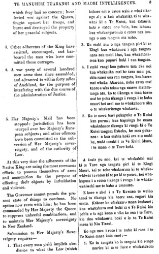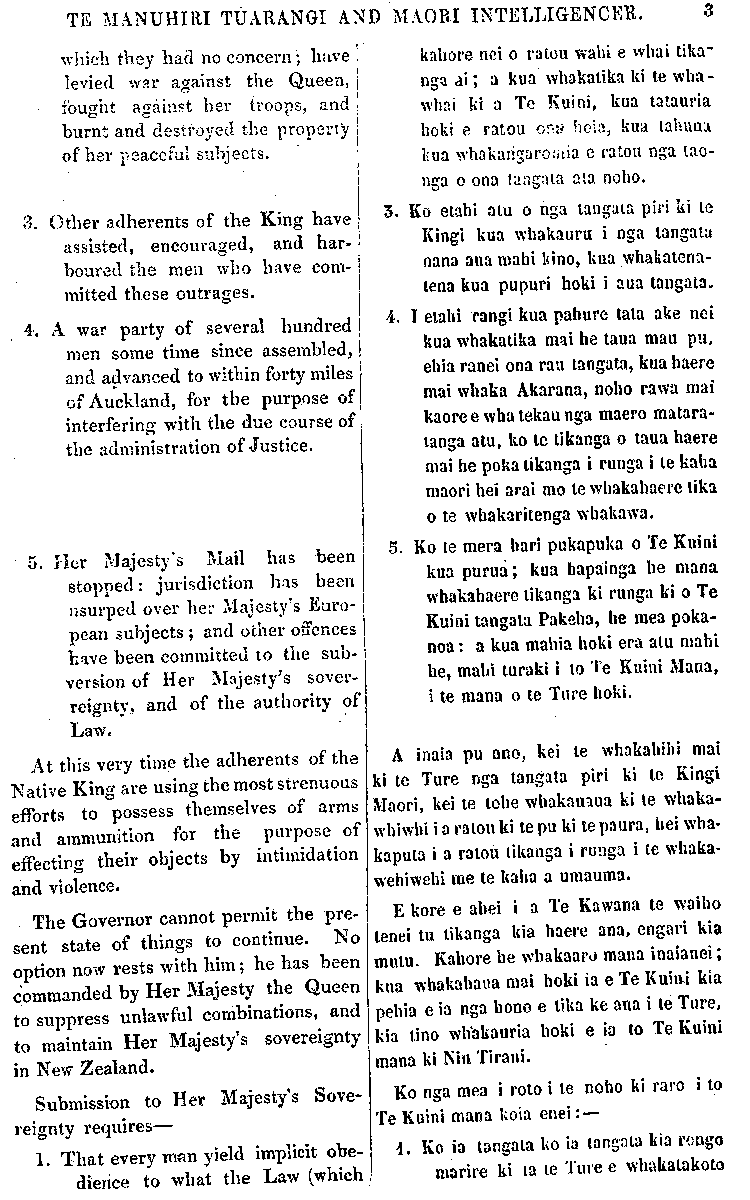 TE MANUHIRI TUARANGI AND MAORI INTELLIGENCER. 3 which they had no concern; have levied, war against the Queen, fought against her troops, and burnt and destroyed the property! of her peaceful subjects. 3. Other adherents of the King have assisted, encouraged, and har- boured the men who have com- mitted these outrages. 4. A war party of several hundred men some time since assembled, and advanced to within forty miles of Auckland, for the purpose of interfering with the due course of the administration of Justice. 5. Her Majesty's Mail has been stopped: jurisdiction has been usurped over her Majesty's Euro- pean subjects; and other offences have been committed to the sub version of Her Majesty's sover- reignty, and of the authority of Law. At this very time the adherents of the Native King are using the most strenuous efforts to possess themselves of arms and ammunition for the purpose of effecting their objects by intimidation and violence. The Governor cannot permit the pre- sent state of things to continue. "No option now rests with him; he has been commanded by Her Majesty the Queen to suppress unlawful combinations, and to maintain Her Majesty's sovereignty in New Zealand. Submission to Her Majesty's Sove- reignty requires— 1. That every man yield implicit obe- dience to what the Law (which kahore nei o ratou wahi e whai tika" nga ai; a kua whakatika ki te wha- whai ki a Te Kuini, kua tatauria hoki e ratou ona hoia, kua tahuna kua whakangaromia ratou nga tao- nga o ona tangata ata noho. 3. Ko etahi atu o nga tangata pin ki te Kingi kua whakauru i nga tangata nana aua mahi kino, kua whakatena- tena kua pupuri hoki i aua tangata. 4. I etahi rangi kua pahure tata ake nei kua whakatika mai he taua mau pu, ehia ranei ona rau tangata, kua haere mai whaka Akarana, noho rawa mai kaore e wha tekau nga maero matara- tanga atu, ko te tikanga o taua haere mai he poka tikanga i runga i te kaha maori hei arai ano te whakahaere tika o te whakaritenga whakawa. 5. Ko te mera hari pukapuka o Te Kuini kua puma; kua hapainga he mana whakahaere tikanga ki runga ki o Te Kuini tangata Pakeha, he mea poka- noa: a kua mahia hoki era atu mahi he, mahi turaki i te Te Kuini Mana, i te mana o te Tu re hoki. A inaia pu ano, kei te whakahihi mai ki te Ture nga tangata piri ki te Kingi Maori, kei te tohe whakauaua ki te whaka- whiwhi i a ratou ki te pu ki te paura, hei wha- kaputa i a ratou tikanga i runga i te whaka- wehiwehi me te kaha a umauma. E kore e ahei i a Te Kawana te waiho tenei tu tikanga kia haere ana, engari kia mutu. Kahore he whakaaro mana inaianei; kua whakahaua mai hoki ia e Te Kuini kia pehia e ia nga hono e tika ke ana i te Ture, kia tino whakauria hoki e ia to Te Kuini mana ki Niu Tireni. Ko nga mea i roto i te noho ki raro i to Te Kuini mana koia enei:—• 4. Ko ia tangata ko ia tangata kia rongo marire ki ta te Ture e whakatakoto