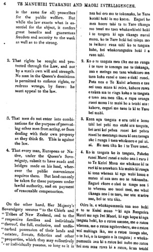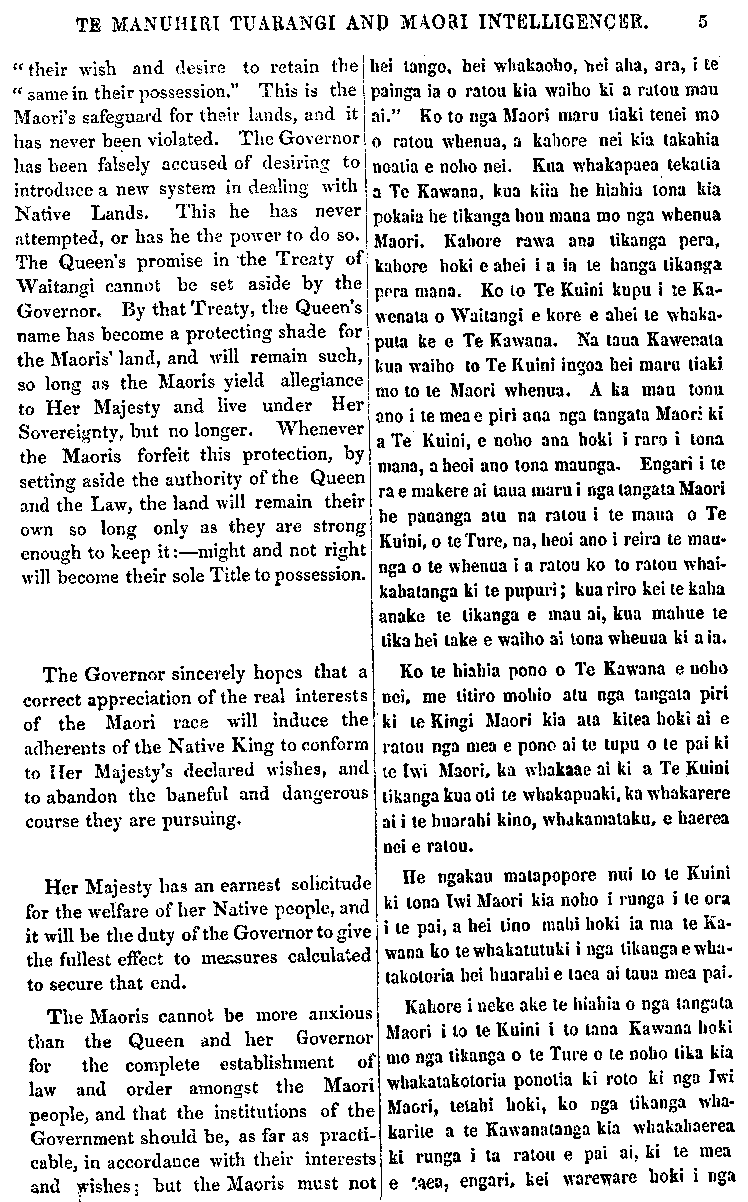 TE MANUHIRI TUARANGI ANO MAORI INTELLIGENCER. 5 " their wish and desire to retain the " same in their possession." This is the Maoris' safeguard for their lands, and it has never been violated. The Governor has been falsely accused of desiring to introduce a new system in dealing with Native Lands. This he has never attempted, or has he the power to do so. The Queen's promise in 'the Treaty of Waitangi cannot be set aside by the Governor. By that Treaty, the Queen's name has become a protecting shade for the Maoris' land, and will remain such, so long as the Maoris yield allegiance to Her Majesty and live under Her Sovereignty, but no longer. Whenever the Maoris forfeit this protection, by setting aside the authority of the Queen and the Law, the land will remain their own so long only as they are strong enough to keep it:—might and not right will become their sole Title to possession. The Governor sincerely hopes that a correct appreciation of the real interests of the Maori race will induce the adherents of the Native King to conform to Her Majesty's declared wishes, and to abandon the baneful and dangerous course they are pursuing. Her Majesty has an earnest solicitude for the welfare of her Native people, and it will be the duty of the Governor to give the fullest effect to measures calculated to secure that end. The Maoris cannot be more anxious than the Queen and her Governor for the complete establishment of law and order amongst the Maori people, and that the institutions of the Government should be, as far as practi- cable, in accordance with their interests and wishes; but the Maoris must not hei tango, hei whakaoho, hei aha, ara, i te painga ia o ratou kia waiho ki a ratou mau ai." Ko to nga Maori maru tiaki tenei mo o ratou whenua, a kahore nei kia takahia noatia e noho nei. Kua whakapaea tekatia a Te Kawana, kua kiia he hiahia tona kia pokaia he tikanga hou mana mo nga whenua Maori. Kahore rawa ana tikanga pera, kahore hoki e ahei i a ia te hanga tikanga pera mana. Ko to Te Kuini kupu i te Ka- wenata o Waitangi e kore e ahei te whaka- puta ke e Te Kawana. Na taua Kawenata kua waiho to Te Kuini ingoa hei maru tiaki mo to te Maori whenua. A ka mau tonu ano i te mea e piri ana nga tangata Maori; ki a Te Kuini, e noho ana hoki i raro i tona mana, a heoi ano tona maunga. Engari i te ra e makere ai taua maru i nga tangata Maori he pananga atu na ratou i te mana o Te Kuini, o te Ture, na, heoi ano i reira te mau- nga o te whenua i a ratou ko to ratou whai- kahatanga ki te pupuri; kua riro kei te kaha anake te tikanga e mau ai, kua mahue te tika hei take e waiho ai tona whenua ki a ia. Ko te hiahia pono o Te Kawana e noho nei. me titiro mohio atu nga tangata piri ki te Kingi Maori kia ata kitea hoki ai e ratou nga mea e pono ai te tupu o te pai ki te Iwi Maori, ka whakaae ai ki a Te Kuini tikanga kua oti te whakapuaki, ka whakarere ai i te huarahi kino, whakamataku, e haerea nei e ratou. He ngakau matapopore nui to te Kuini ki tona Iwi Maori kia noho i runga i te ora i te pai, a hei tino mahi hoki ia ma te Ka- wana ko te whakatutuki i nga tikanga e whaka- takotoria hei huarahi e taea ai taua mea pai. Kahore i neke ake te hiahia o nga tangata Maori i to te Kuini i to tana Kawana hoki mo nga tikanga o te Ture o te noho tika kia whakatakotoria ponotia ki roto ki nga Iwi Maori, tetahi hoki, ko nga tikanga whaka rite a te Kawanatanga kia whakahaerea ki runga i la ratou e pai ai, ki te mea e taea, engari, kei wareware hoki i nga