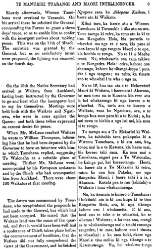 TE MANUHIRI TUARANGI AND MAORI INTELLIGENCER. 9 Shortly afterwards, Wiremu Tame- hana went overland to Taranaki. On his arrival there he solicited the General commanding the Forces to grant a three days' truce, so as to enable him to confer with the insurgent natives about making peace. This was on the 11th of March. The armistice was granted by the General, but as no satisfactory terms were proposed, the fighting was resumed on the fourth day. On the 18th the Native Secretary had arrived at Waitara from Auckland, having been instructed by the Governor to go and hear what the insurgents had to say for themselves. Meetings were held both with the Waikato and Ngati- awa, who were in arms against the Queen: and both these tribes expressed an earnest desire for peace. When Mr. McLean reached Waitara he wrote to William Thompson, inform- ing him that he had been deputed by the Governor to have an interview with him; to which Tamehana replied, suggesting Te Waionaha as a suitable place of meeting. Thither Mr. McLean went, accompanied by his European assistants and by the Chiefs who had accompanied him from Auckland. There were about 100 Waikatos at that meeting. The korero was commenced by Tame- hana, who recapitulated the proposals he had made to the General, but which had not been accepted. He stated that the Waitara land was the cause of the quar rel, and that it would have been well had a conference of Chiefs taken place before the commencement of hostilities, that the Natives did not fully comprehend the views of the Government, and he finished Ngapora raua ko Aihepene Kaihau, i haere atu ki Waikato. Kihai taro, ka haere atu a Wiremu Tamehana ki Taranaki: i tika atu na uta. Tona taenga ki reira, ka tono atu ia ki te tino Rangatira Hoia, kia purutia te whawhai mo nga ra e toru, kia puta ai tana kupu ki nga tangata Maori o te ope, kia houhia te rongo. No te 11 o Maehe tenei, Na, whakaaetia ana taua takiwa e te Rangatira Hoia: otira, kahore ona ahatanga, kahore he tikanga-kupu i puta ake i nga tangata; na reira, ka timata ano te whawhai i te wha o nga ra. No te I8, kua tae atu a te Hekeretari Maori ki Waitara, i haere atu i Akarana, he mea tono na te Kawana kia rere atu ia hei whakarongo ki nga korero o te whawhai. Na, turia ana te korero e Waikato, raua ko Ngatiawa, ara, o te hunga kua mau patu ki a te Kuini; a, ka nui rawa te hiahia a nga iwi nei, kia mau ai te rongo. Te taenga atu a Te Makarini ki Wai tara, ka tuhituhia tana pukapuka ki a Wiremu Tamehana, e ki atu ana, kua tonoa mai ia e te Kawana, kia haere mai, kia korero tahi raua. Ka mea mai a Tamehana, engari pea a Te Waionaha, he kainga pai, hei korerotanga. Heoti, ka haere atu a Te Makarini ki reira, ratou ko ona hoa Pakeha, me nga Rangatira Maori, i haere tahi i a ia, i Akarana. Kotahi pea te rau (takitahi) o Waikato i taua whakaminenga. Na, ka timataia te korero e Tamehana: i hokihoki atu ia ki ana kupu ki te tino Rangatira Hoia, ara, ki nga tikanga kahore ano i whakaaetia. E ki ana, heoi ano te take o te whawhai, ko te whenua i Waitara; a ka mea ano, erangi ra te whakaminenga mai o tetahi runanga rangatira, i te mea, kahore ano i timata te whawhai: a ka mea hoki, ekore nga Maori e tino mohio ki nga tikanga a te Kawanatanga. Na, hei whakamutunga