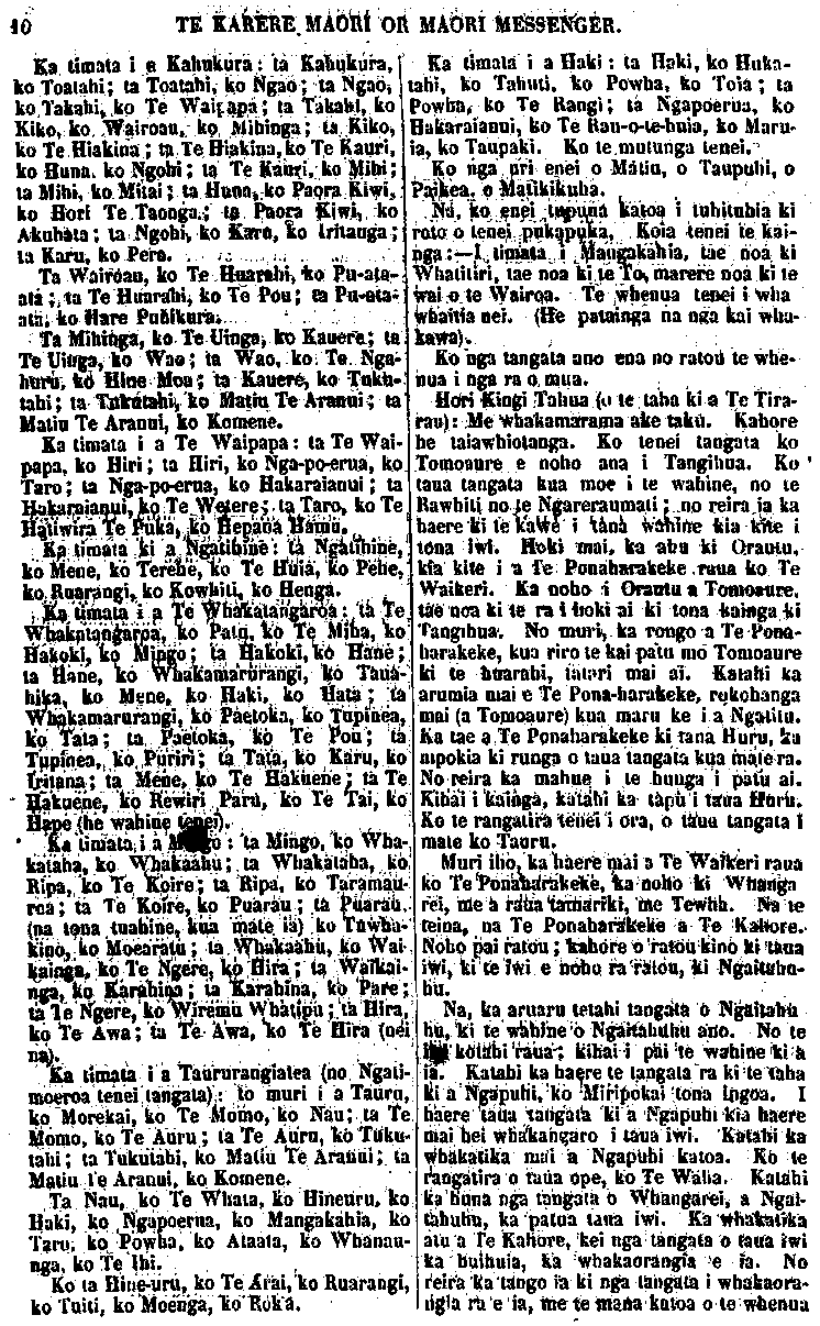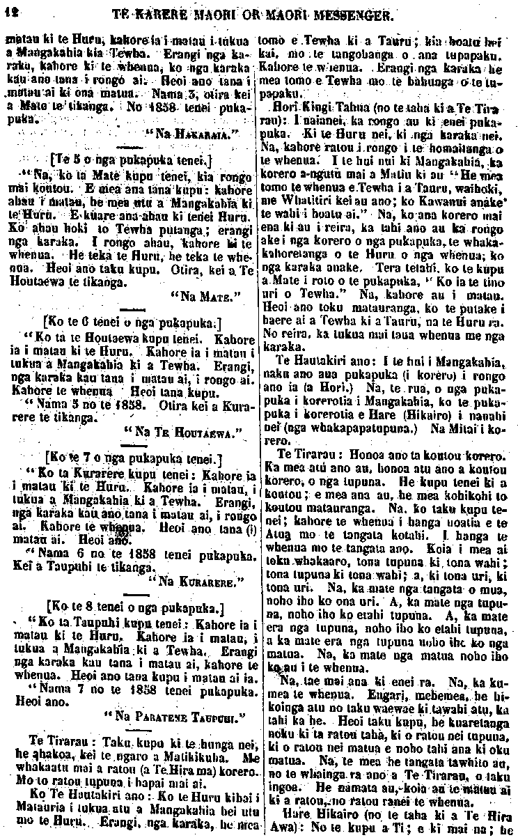 TE KARERE MAORI OR MAORI MESSENGER. Tewha Tauru Matiu Whatitiri Kawanui Hautakere Mangakahia George King Mitai Te Tirarau Hare Hikairo Tipeni Hari Ngaitahuhu Tahuhupeka Tahuhupotiki Te Ao Matangi Rongomate Tuangiangi Te Ngaio Ruarangi Te Hutu Waiehurangi Waimirirangi Whitiao Tuwhakatere Kairuru Toapaheke Rangihere Te Uho Ngarokiteuru Tupohouri Rangi Te Iwitahi Te Manihua Wai Mirirangi Kaka Tangitiua Kaka Maraia Te Hoia Te Ao-matangi Papa Te Waite Kawa Te Hutu Rangi-korero Mohi te Peke Te Hoetotara Te Hutu Hone Tekahanga Maru Hinewai Te Huru Ngahura Paeke Ngahuru Haimona Mihiao Ngarokiteuru