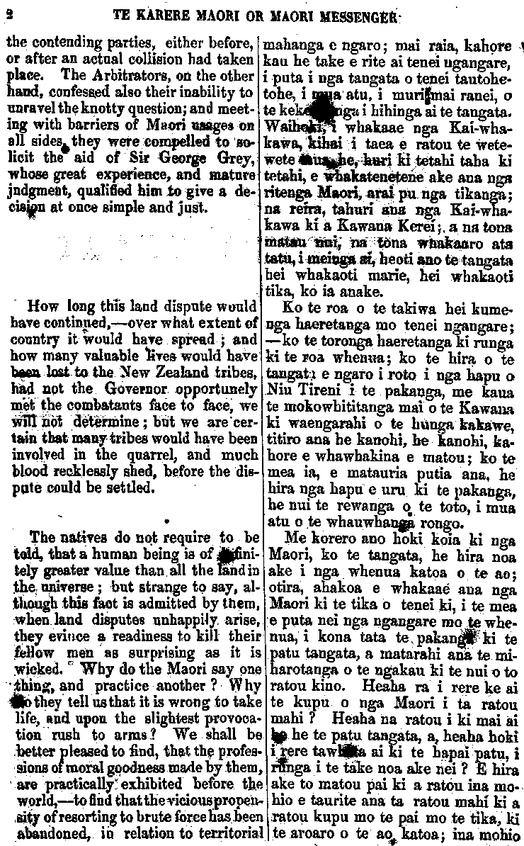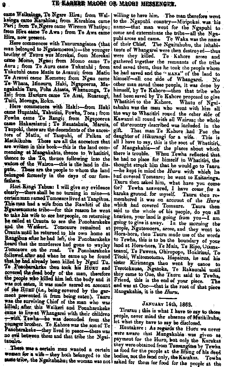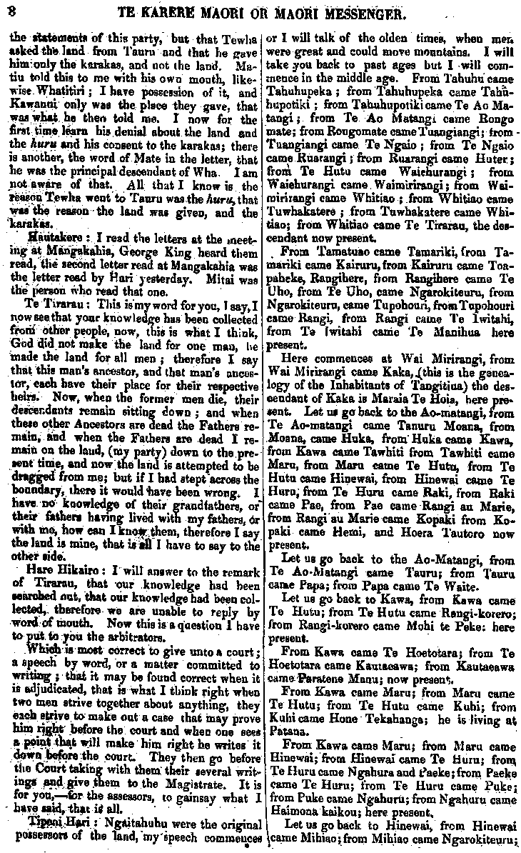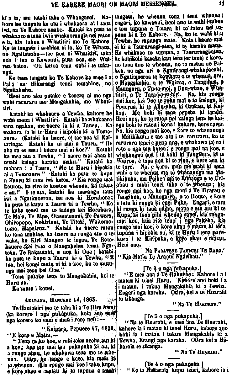 TE KARERE MAORI OR MAORI MESSENGER VOL. III.] AUCKLAND, MARCH 3O, 1863.—AKARANA, MAEHE 3O, 1863. [No. 2. " Good books are like true friends , they will } never fail us; never cease to instruct— never cloy." OUR last issue contained the decision of the Governor on the dispute be-tween the Chiefs Matiu Te Aranui, and Te Tirarau, with a few remarks thereon. We insert in the present number the evidence taken before the arbitrators, on the first and second day of examination. The care and patience manifested throughout this protracted investigation, will be long remembered by the Kaipara and Nga-puhi Chiefs. And, certainly the whole of the proceedings will contrast most favourably with the proceedings and course of action, excited and un-certain, pursued by the natives in similar circumstances. the task allotted to his Excellency as umpire in this case, has been al-ready glanced at, and is seen from many points of view, to he onerous, particularly so from the fact, that no basis of agreement could be fixed by" Ko nga pukapuka papai, e penei ana me nga hoa pono; te whakarere i a tatou— te mutu te ako — te whakatina." Ko to matou whakaputanga kupu i mua mai o tenei, i whakaaturia te whakaotinga o te Kawana i runga i te tautohetohe o nga rangatira, a Matiu Te Aranui, a Te Tirarau ;a, i puta ano he kupu mo runga i taua mahi. Ko tenei, ka taia iho nga korero o te ra tuatahi, o te ra tua-rua, i whakapuakina ki te aroaro o nga Kai-whakawa. Ko te ata mahi me te manawanui o runga o tenei whakawakanga mutu noa, ina wha-karitea ki to te Maori tikanga oho-oho, kahakahaki haere, i runga i nga mahi penei, tera e kitea ko te pai kei tenei tu whakawakanga. Ko te mahi i karangatia, ko te Kawana hei Tumuaki mo tenei whakawa, hei whakapuaki i te kupu whakaotinga, kua oti ano te whaka-atu; a, ina tirohia i runga i nga pitopito o te korero, ekore tona tai.