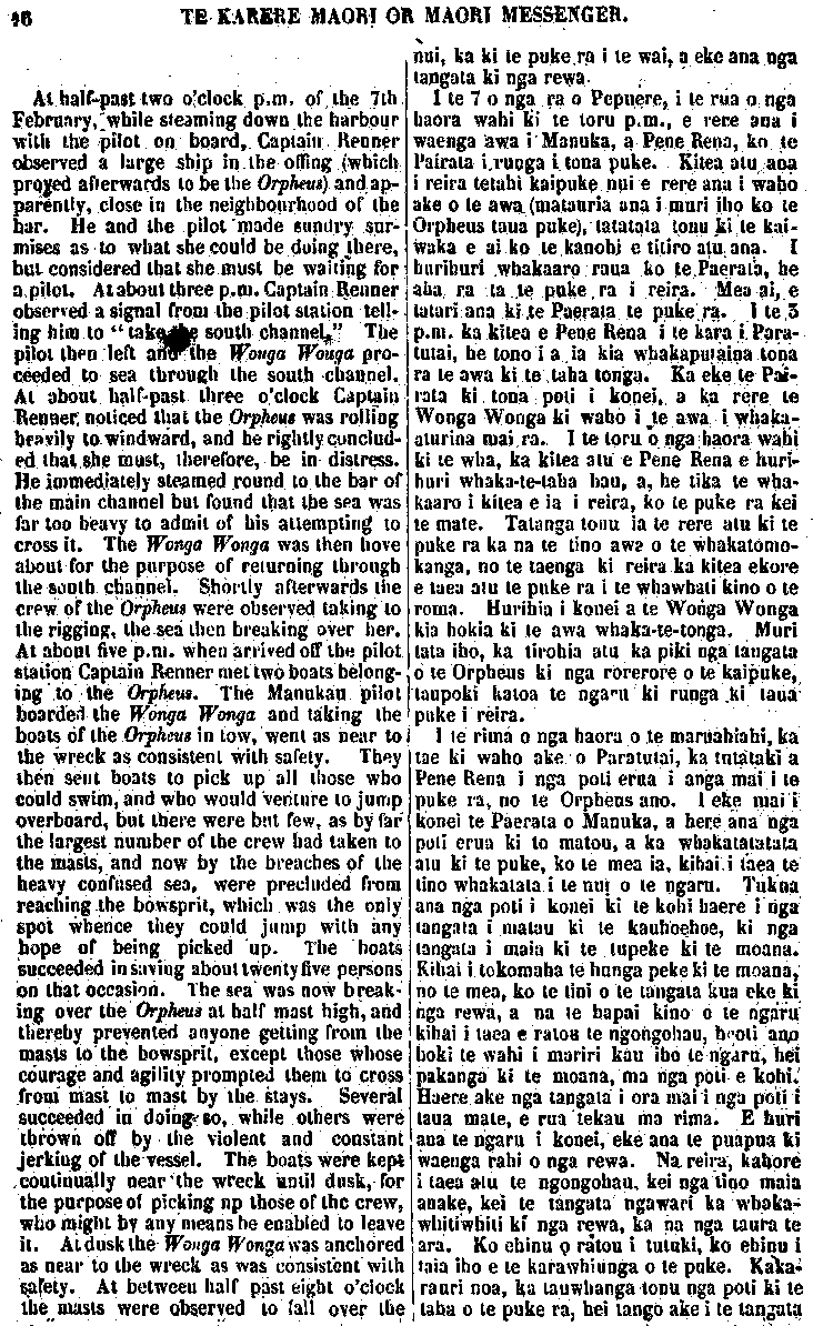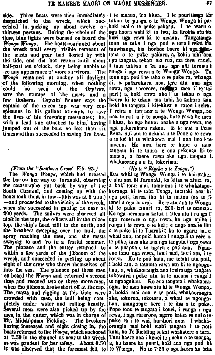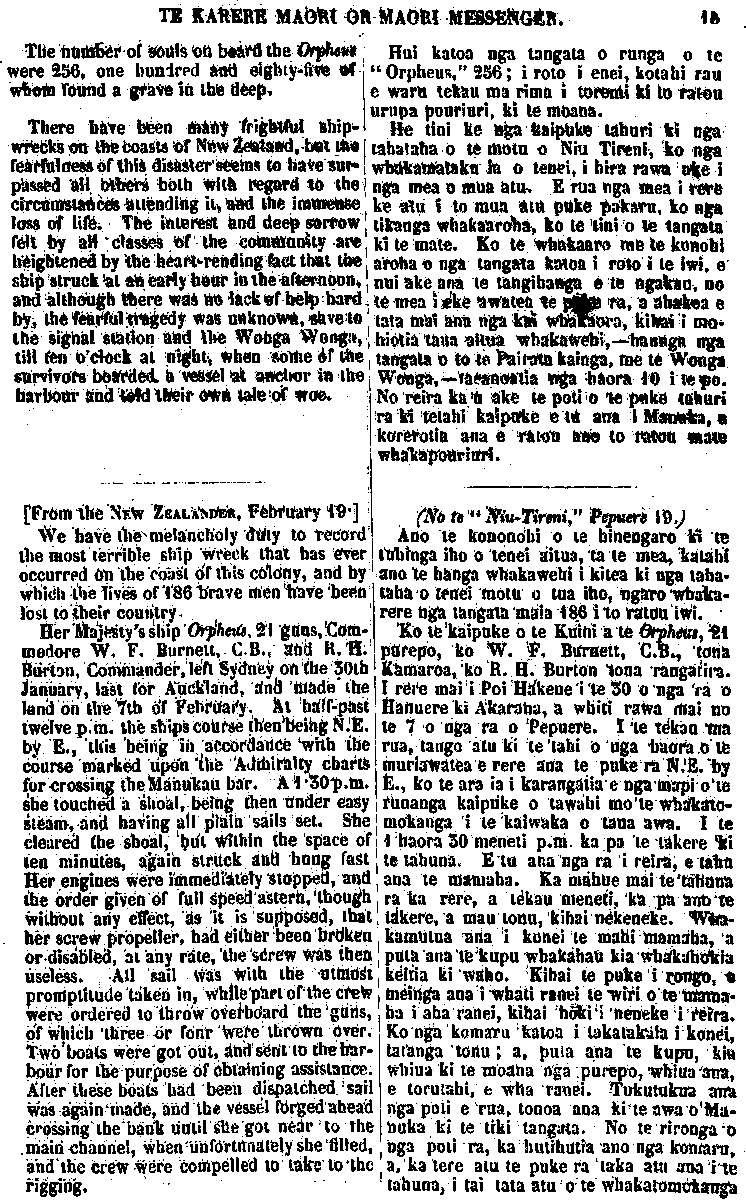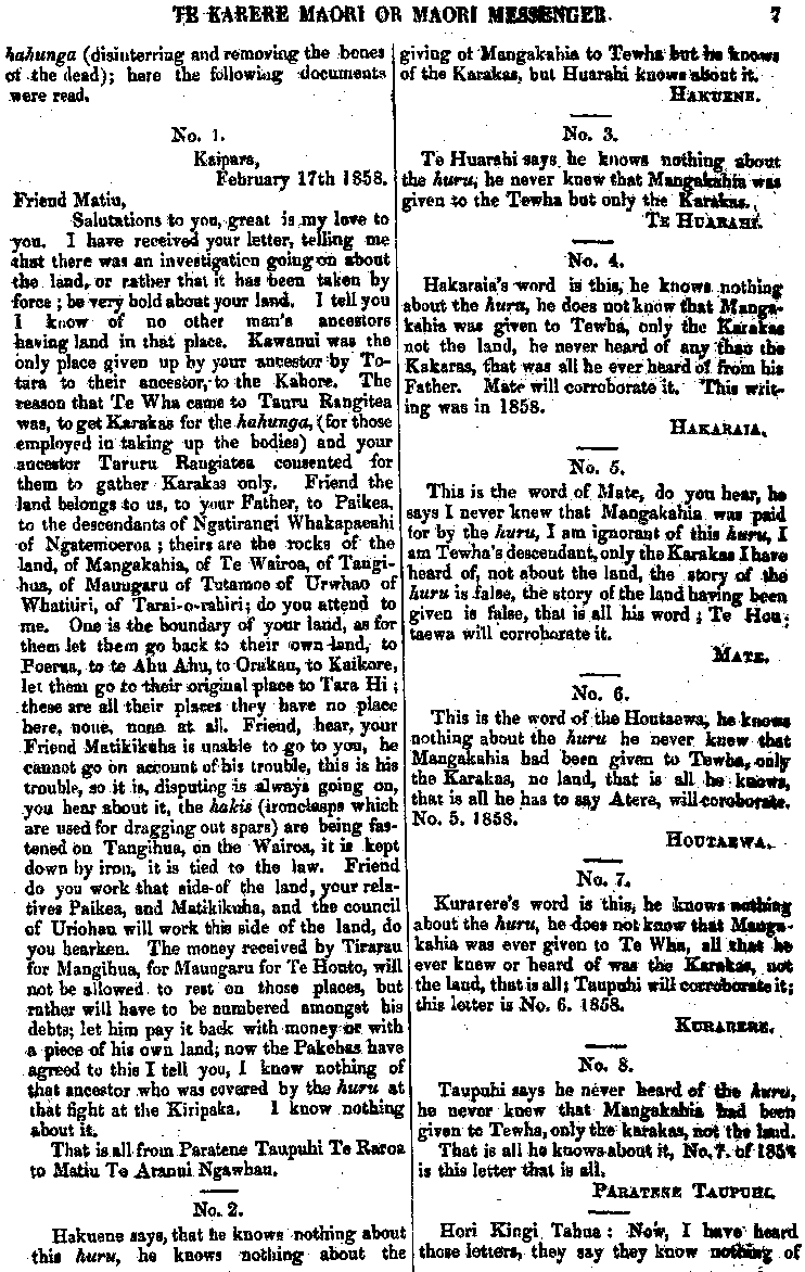 TE KARERE MAORI OR MAORI MESSENGER VOL. III.] AUCKLAND, MARCH 3O, 1863.—AKARANA, MAEHE 3O, 1863. [No. 2. " Good books are like true friends , they will } never fail us; never cease to instruct— never cloy." OUR last issue contained the decision of the Governor on the dispute be-tween the Chiefs Matiu Te Aranui, and Te Tirarau, with a few remarks thereon. We insert in the present number the evidence taken before the arbitrators, on the first and second day of examination. The care and patience manifested throughout this protracted investigation, will be long remembered by the Kaipara and Nga-puhi Chiefs. And, certainly the whole of the proceedings will contrast most favourably with the proceedings and course of action, excited and un-certain, pursued by the natives in similar circumstances. the task allotted to his Excellency as umpire in this case, has been al-ready glanced at, and is seen from many points of view, to he onerous, particularly so from the fact, that no basis of agreement could be fixed by" Ko nga pukapuka papai, e penei ana me nga hoa pono; te whakarere i a tatou— te mutu te ako — te whakatina." Ko to matou whakaputanga kupu i mua mai o tenei, i whakaaturia te whakaotinga o te Kawana i runga i te tautohetohe o nga rangatira, a Matiu Te Aranui, a Te Tirarau ;a, i puta ano he kupu mo runga i taua mahi. Ko tenei, ka taia iho nga korero o te ra tuatahi, o te ra tua-rua, i whakapuakina ki te aroaro o nga Kai-whakawa. Ko te ata mahi me te manawanui o runga o tenei whakawakanga mutu noa, ina wha-karitea ki to te Maori tikanga oho-oho, kahakahaki haere, i runga i nga mahi penei, tera e kitea ko te pai kei tenei tu whakawakanga. Ko te mahi i karangatia, ko te Kawana hei Tumuaki mo tenei whakawa, hei whakapuaki i te kupu whakaotinga, kua oti ano te whaka-atu; a, ina tirohia i runga i nga pitopito o te korero, ekore tona tai.