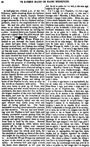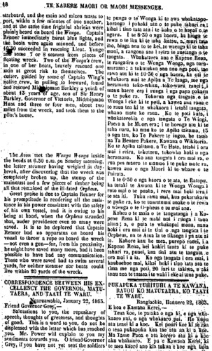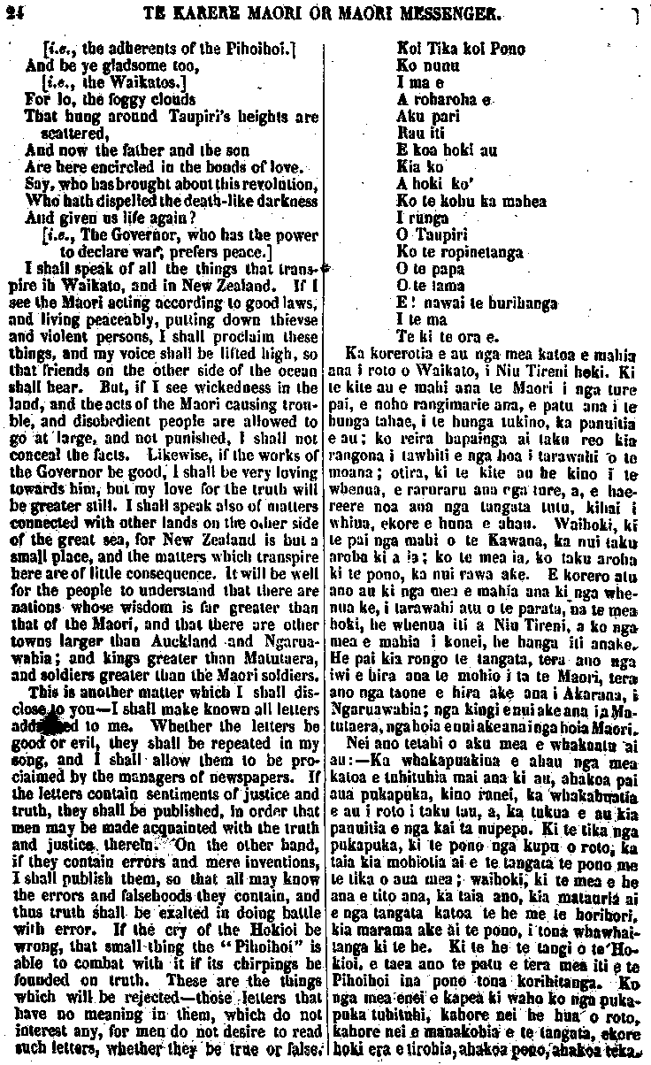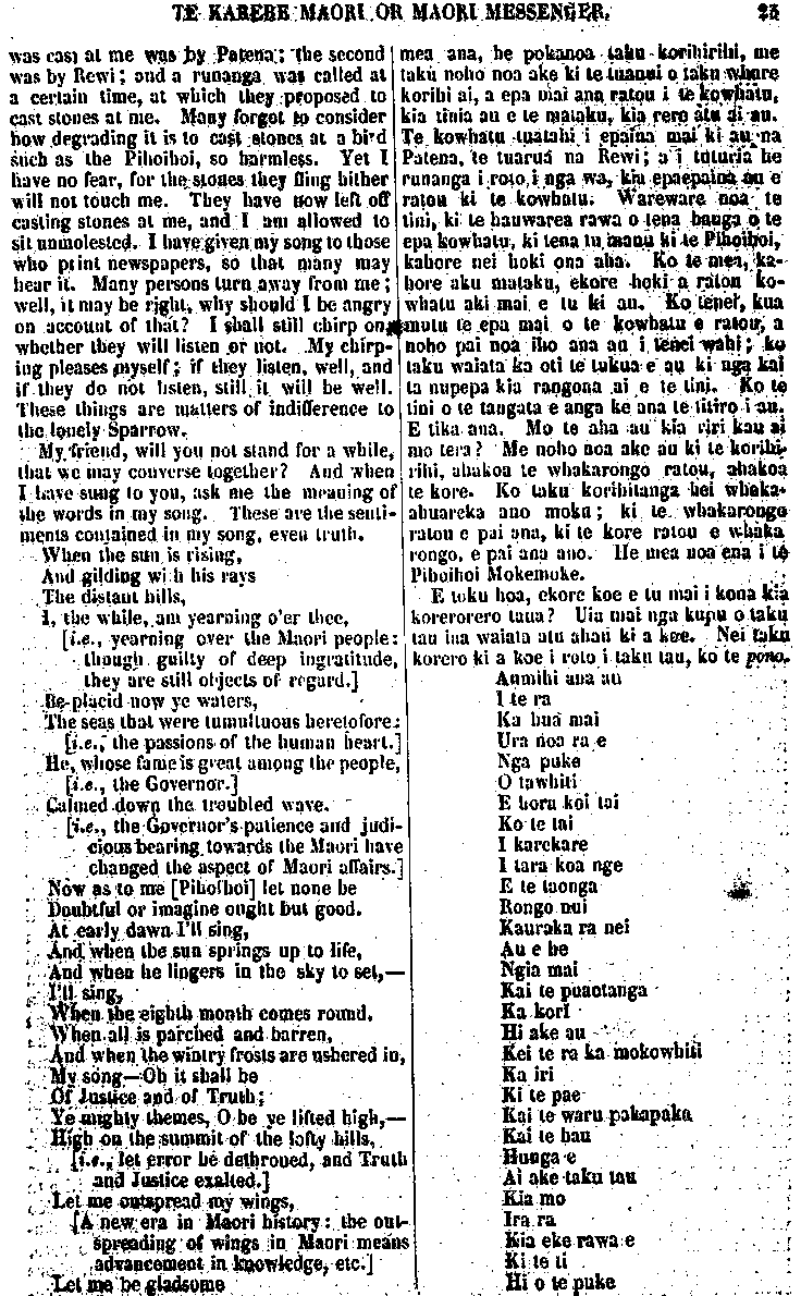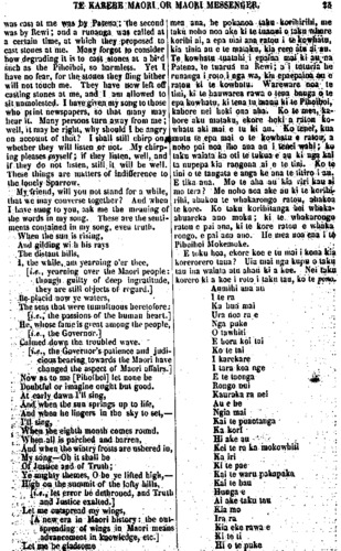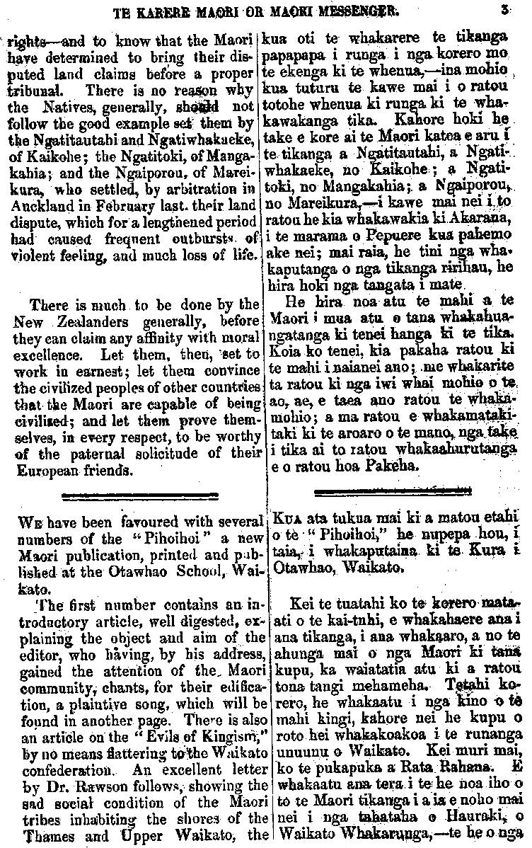 TE KARERE MAORI OR MAORI MESSENGER. 3 rights — and to know that the Maori have determined to bring their dis-puted land claims before a proper tribunal. There is no reason why the Natives, generally, should not follow the good example set them by the Ngatitautahi and Ngatiwhakaeke, of Kaikohe ; the Ngatitoki, of Manga-kahia; and the Ngaiporou, of Marei-kura, who settled, by arbitration in Auckland in February last, their land dispute, which for a lengthened period had caused frequent outbursts, of violent feeling; and much loss of life. There is much to be done by the New Zealanders generally, before they can claim any affinity with moral excellence. Let them, then, set to work in earnest; let them convince the civilized peoples of other countries that the Maori are capable of being civilized; and let them prove them-selves, in every respect, to be worthy of the paternal solicitude of their European friends. WE have been favoured with several numbers of the "Pihoihoi" a new Maori publication, printed and pub-lished at the Otawhao School, Wai-kato. The first number contains an in-troductory article, well digested, ex-plaining the object and aim of the editor, who having, by his address, gained the attention of the Maori community, chants, for their edifica-tion, a plaintive song, which will be found in another page. There is also au article on the "Evils of Kingism," by no means flattering to the Waikato confederation. An excellent letter by Dr. Rawson follows, showing the sad social condition of the Maori tribes inhabiting the shores of the Thames and Upper Waikato, thekua oti te whakarere te tikanga papapapa i runga i nga, korero mo te ekenga ki te whenua,— ina mohio kua tuturu te kawe mai i o ratou totohe whenua ki runga ki te wha-kawakanga tika. Kahore hoki he take e kore ai te Maori katea e aru i te tikanga a Ngatitautahi, a Ngati-. whakaeke, no Kaikohe ; a Ngati-toki, no Mangakahia; a Ngaiporou no Mareikura, i kawe mai nei i to. ratou he kia whakawakia ki Akarana, i te marama o Pepuere kua pakemo ake nei; mai raia, be tini nga wha-kaputanga o nga tikanga ririhau, be hira hoki nga tangata i mate, He hira noa atu te mahi a te Maori i mua atu o tana whakahua-ngatanga ki tenei hanga ki te tika» Koia ko tenei, kia pakaha ratou ki te mahi i naianei ano ; me whakarite ta ratou ki nga iwi whai mohio o te ao, ae, e taea ano ratou te whaka-mohio ; a ma ratou e whakamataki-taki ki te aroaro o te mano, nga take i tika ai to tatou whakaahurutanga e o ratou hoa Pakeha, KUA ata tukua mai ki a matou etahi o te " Pihoihoi/' he nupepa hou, i taia, i whakaputaina ki te Kura I Otawhao, Waikato, Kei te tuatahi ko te korero mata-ati o te kai-tuhi, e whakahaere ana i ana tikanga, i ana whakaaro, a no te ahunga mai o nga Maori ki tana kupu, ka waiatatia atu ki a ratou tona tangi mehameha. Tetehi ko- rero, he whakaatu i nga Kino o te mahi kingi, kahore nei he kupu o roto hei whakakoakoa i te runanga unuunu o Waikato. Kei muri mai, • ko te pukapuka a Rata Rahana. E whakaatu ana tera, i tei be noa iho o to te Maori tikanga i a ia e noko mai nei i nga tahataha o Hauraki o 5 Waikato Whakarunga,— te he o nga