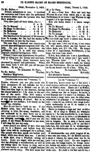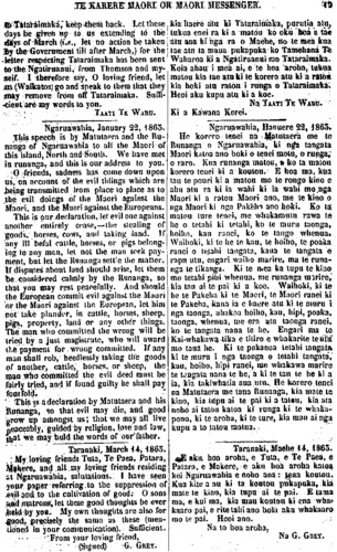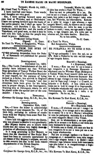 20 TE KARERE MAORI OR MAORl MESSENGER. Taranaki Taati Te Waru G. GREY Rangiawhia Waipa DESPATCHES FROM THE DUKE OF NEWCASTLE William Repa Tamati Waka Nene England Cossack Devonport Sir George Grey New Zealand HE PUKAPUKA NO TE RUKI O NUI KAHIO Ingarangi Tewanapoata Ta Hori Kerei Niu Tireni Waireka Okurukuru