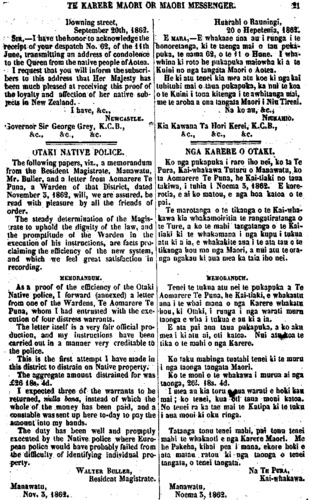 TE KARERE MAORl OR MAORI MESSENGER 21 Downing street, September 20th, 1862. SIR,— I have the honor to acknowledge the receipt of your despatch No. 62, of the 11th June, transmitting an address of condolence to the Queen from the native people of Aotea. I request that you will inform the subscri-bers to this address that Her Majesty has been much pleased at receiving this proof of the loyalty and affection of her native sub-jects in New Zealand. • • I have, &c., NEWCASTLE. Governor Sir George Grey, K.C.B., * &c., &c. &c. OTAKI NATIVE POLICE. The following papers, viz., a memorandum from the Resident Magistrate, Manawatu, Mr. Buller, and a letter from Aomarere Te Puna, a Warden of that District, dated November o, 1862, will, we are assured, be read with pleasure by all the friends of order. The steady determination of the Magis-trate to uphold the dignity of ihe law, and the promptitude of the Warden in the execution of bis instructions, are fads pro-claiming the efficiency of the new system, and which we feel great satisfaction in recording. MEMORANDUM. . As a proof of the efficiency of the Otaki Native police, I forward (annexed) a letter from one of the Wardens, Te Aomarere Te Puna, whom I had entrusted with the exe-cution of four distress warrants. The letter itself is a very fair official pro-duction, and my instructions have been carried out in a manner very creditable to the police. • This is the first attempt I have made in this district to distrain on Native property. The aggregate amount distrained for was £2618s.4d. I expected three of the warrants to be returned, nulla bona, instead of which the whole of ihe money has been paid, and a constable was sent up here to-day to pay the amount into my hands. The duly has been well and promptly executed by the Native police .where Euro-pean police would have probably failed from the difficulty of identifying individual pro-perty. - • . . WALTER BULLER, Resident Magistrate. Manawatu, Nov. 3,1862.Huarahi o Rauningi, 20 o Hepetema, 1862. E MARA,— E whakaae ana au i ronga i te honoretanga, ki te taenga mai o tau puka-puka, te nama 62, o le 11 o Hune. I wha-whina ki roto he pukapuka maiowha ki a te Kuini no nga tangata Maori o Aotea. He ki atu tenei kia mea ato koe ki nga kai tuhituhi mai o taua pukapuka, ka nui te koa o te Kuini i tona kitenga i le awhitanga mai, me le aroha a ona tangata Maori i Niu Tireni. Na ko au, &c. NIUKAHIO. Kia Kawana Ta Hori Kerei, K.C.B., & c., & c., & c. NGA KARERE 0 OTAKI. Ko nga pukapuka i raro iho nei, ko ta Te Pura, Kai-whakawa Tuturu o Manawatu, ko ta Aomarere Te Puna» he Kai-tiaki no taua takiwa, i tuhia i Noema 3, 1862. £ kore-rotia, e ai ko matou, e nga hoa katoa o te pai. Te marotanga o te tikanga o le Kai-wha-kawa kia whakamoiritia te rangatiratanga o le Ture, a ko le mahi tangatanga o te Kai-tiaki ki te whakamana i nga kupu i tukua . atu ki a ia, e whakakite ana i le ata iau o te Ukanga hou mo nga Maori, a nui atu te ora-nga ngakau ki aua mea ka taia iho nei. MEMORANDUM. Tenei te tukua atu nei le pukapuka a Te Aomarere Te Puna, be Kai-tiaki, e whakaatu ana i te whai mana o nga Karere whakatu hou, ki Otaki, i runga i nga warati mura taonga e wha i tukua e au ki a ia. . £ ata pai ana taua pukapuka, a ko aku mea i ki atu ui, oti katoa. Nui atu koa te Uka o te mahi o nga Karere. Ko taku mahinga matahi Ienei ki te muru i nga taonga tangata Maori. Ko te moni o te whakawa i murua ai nga taonga, 261. 18s. 4d. Na TE PURA, Kai-whakawa. Manawatu, Noema 3, 1862, ' - »