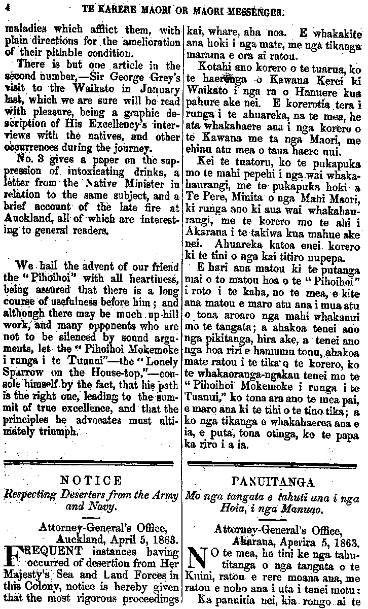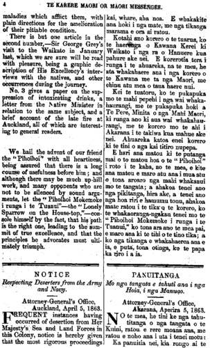 4 TE KARERE MAORI OR MAORI MESSENGER. maladies which afflict them, with plain directions for the amelioration of their pitiable condition. ' There is but one article in the second number, — Sir George Grey's visit to the Waikato in January last, which we are sure will be read with pleasure, being a graphic de-scription of His Excellency s inter-views with the natives, and other occurrences during the journey. No. 3 gives a paper on the sup-pression of intoxicating drinks, a letter from the Native Minister in relation to the same subject, and a brief account of the late fire at Auckland, all of which are interest-ing to general readers. "We hail the advent of our friend the "Pihoihoi" with all heartiness, being assured that there is a long course of usefulness before him; and although there may be much up-hill work, and many opponents who are not to be silenced by sound argu-ments, let the " Pihoihoi Mokemoke i runga i te Tuanui" — the " Lonely Sparrow on the House-top," — con-sole himself by the fact, that his path is the right one, leading to the sum-mit of true excellence, and that the principles he advocates must ulti-mately triumph. NOTICE Respecting Deserters from the Army and Navy. Attorney-General's Office, Auckland, April 5, 1868. FREQUENT instances having occurred of desertion from Her Majesty's Sea and Land Forces in this Colony, notice is hereby given that the most rigorous proceedingskai, whare, aha noa. E whakakite ana hoki i nga mate, me nga tikanga marama e ora ai ratou. Kotahi ano korero o te tuarua, ka te haerenga o Kawana Kerei ki Waikato i nga ra o Hanuere kua pahure ake nei. E korerotia tera i runga i te ahuareka, na te mea, he ata whakahaere ana i nga korero o te Kawana me ta nga Maori, me ehinu atu mea o taua haere nui. Kei te tuatoru, ko te pukapuka mo te mahi pepehi i nga wai whaka-haurangi, me te pukapuka hoki a Te Pere, Minita o nga Mahi Maori, ki runga ano ki aua wai whakahau-rangi, me te korero mo te ahi i Akarana i te takiwa kua mahue ake nei. Ahuareka katoa enei korera ki te tini o nga kai titiro nupepa. Ehari ana matou ki te putanga mai o to matou hoa o te " Pihoihoi" i roto i te kaha, no te mea, e kite ana matou e maro atu ana i mua atu o tona aroaro nga mahi whakanui mo te tangata; a ahakoa tenei ano nga pikitanga, hira ake, a tenei ano nga noa riri e hamumu tonu, ahakoa mate ratou i te tika o te korero, ko te whakaoranga-ngakau tenei mo te " Pihoihoi Mokemoke i runga i te Tuanui," ko tona ara ano te mea pai, e maro ana ki te tihi o te tino tika ; a ko nga tikanga e whakahaerea ana e ia, e puta, tona otinga, ko te papa ka riro i a ia. PANUITANGA Mo nga tangata e tahuti ana i nga Hoia, i nga Manuao. Attorney-General's Office, Akarana, Aperira 5, 1863. No te mea, he tini ke nga tahu- titanga o nga tangata o te Kuini, ratou e rere moana ana, me ratou e noho ana i uta i tenei motu: 5 Ka panuitia nei, kia rongo ai te