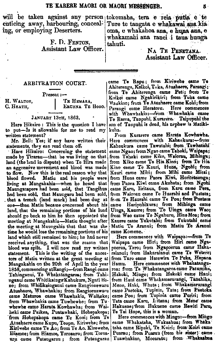 TE KARERE MAORI OR MAORI MESSENGER. 8 will be taken against any person 1 enticing away, harbouring, conceal-' ing, or employing Deserters. F. D. FENTON, Assistant Law Officer. • ARBITRATION COURT. Present :— H.WALTON, J TE HEMARA, C. HEATH, | ERUENA TE HORO. JANUARY 13TH, 1863. Hare Hikairo : This is the question I have to put — Is it allowable for me to read my written statement? Mr. Bell: Yes; if any have written their statements, they ea n read them off. Hare Hikairo: Concerning the statement made by Tirarau — that he was living on that land (the land in dispute) when Te Hira made an aggressive movement and blood was made to flow. Now this is the real reason why that blood flowed. Matiu and his people were living at Mangakahia — when he heard that Maunga tapere had been sold, that Tangihua had been sold, that Maungaro had been sold, .that a trench (land mark) had been dug at one — then Matiu became concerned about his land, that the remaining portions of his land should go back to him he then appointed the meeting at Mangakahia— Matiu thought after the meeting at Maungahia that that was the time he would lose the remaining portions of his land which still remained to him; he had never received anything, that was the reason that blood was spilt. I will now read my written statement. This is the writing of the ances-tors of Matiu written at the great meeting at Mangakahia on the 20th of April in the year 1858, commencing at Rangi; — from Rangi came Tahinganui, Te Whakatangaroa; from Tahi-nganui came Whitikainga Kahukura, Ngati Hi-ne; from Whitikainganui came Rangionewaru Atuahaere, Whawhakia; from Rangioruawaru came Mataroa came Whawhakia, Waiheke from Whawhakia came Tuwhewhe; from Tu whewhe came Harata Kowhawha; from Wai-heki came Paikea, Puatawhaki, Hohepakopa from Hohepakopa came Te Koui; from Te Atuahaere came Kupu, Teopu, Kiriwehe; from Kiriwehe came Te Ao; from Te Ao, Kirewehe Hiamoe; from Hiamoe, Toroauru; from Toroa-uru came Putangarau ; from Putangarautokomaha, tera e reia putia : e te' Ture te tangata e whakawai ana kia oma, e whakahoa ana, e huna ana, e whakamahi ana ranei i taua hunga tahuti. NA TE PENETANA. Assistant Law Officer. came Te Rapu ; from Kiriwehe came Te Ahiterenga, Koikoi, Toka, Atuahaere, Parangi; from Te Ahiterenga came Peti; from Te Koikoi came Ngakirikiri; from Toka came Maukino; from Te Atuahaere came Koki; from Parangi came Heratoru. Here commences with Whawhakia :-from Whawhakia came Te Raroa, Taupuhi; Kurarere. Taipupuhi the son of Taupuhi is dead, his nephew is Matiki-kuha. From Kurarere came Harata Kowhawha. Here commences with Kahaukura:— from Kahaukura came Tawatahi; from .Tawhatahi ~ came Ngao; from Ngao came Tahoki; Waipapa; from Tahaki came Kiko, Waiorau, Mihinga ; from Kiko came Te Hia Kino; from Te Hia Kino came Te Kauri, Huna, Ngohi; from Kauri came Mihi; from Mihi came Mitai; from Huna came Paora Kiwi, Horitetaunga; from Paora Kiwi came Akuhata; from Ngohi came Karu, liritaua, from Karu came Pera, from Wai r nau came Te Huarahi arid Puatata;. from Te Haurahi came Te Pou; from Puatata came Haripuhikura; from Mihinga came Uinga, Kauere; from Te Uinga came Wao; from Wao came Te Ngahuru, Hine Moa; from Kauere came Tukutahi; from Tukutahi came Matiu Te Aranui; 'from Matiu Te Aranui came Komene. Here commences with Waipapa: — from Te Waipapa came Hiri; from Hiri came Nga-poerua, Taro; from Ngapoerua came Haka-raianui; from Hakaraianui came Te Wetere; from Taro came H at e wira Te Puka, Hepana H amu. Here commences with Whakatanga-roa: from Te Whakatangaroa came Patumiha, Hakoki, Mingo; from Hakoki came Hani; from Hani came Whakamarurangi, Tauahika, Mene, Haki, Whata; from Whakamarurangi came Paetoka, Tupinia, Tata; from Paetoka ; came Pou; from Tupinia came Puriri; from Tata came Karu, It itana; from Mene came Hakuene; from Hakuene came Rewiti Paru, ; Te Tai Hope, this is a woman. Here commences with Mingo: — from Mingo came Whakataha, Wakaahua from Whaka" , taha came Ripaki, Te. Koiri; from Koiri came • Puarau , from Puarau (from his sister) came ,- Tuawhakino, Moearatu; from Whakaahua