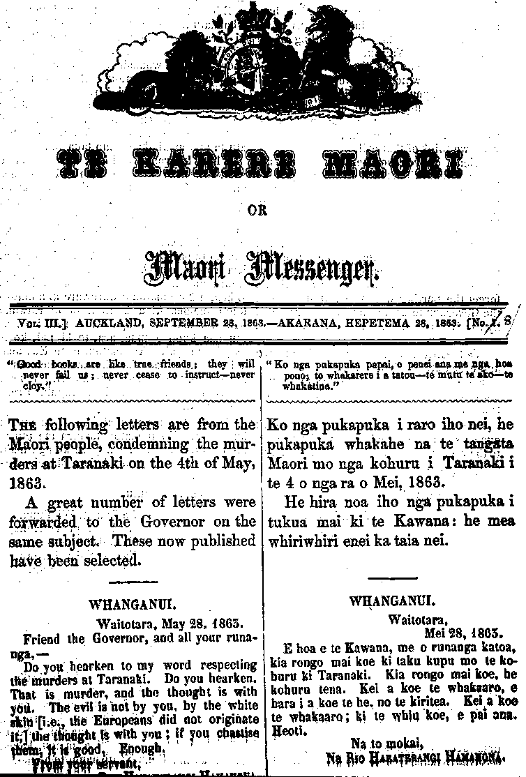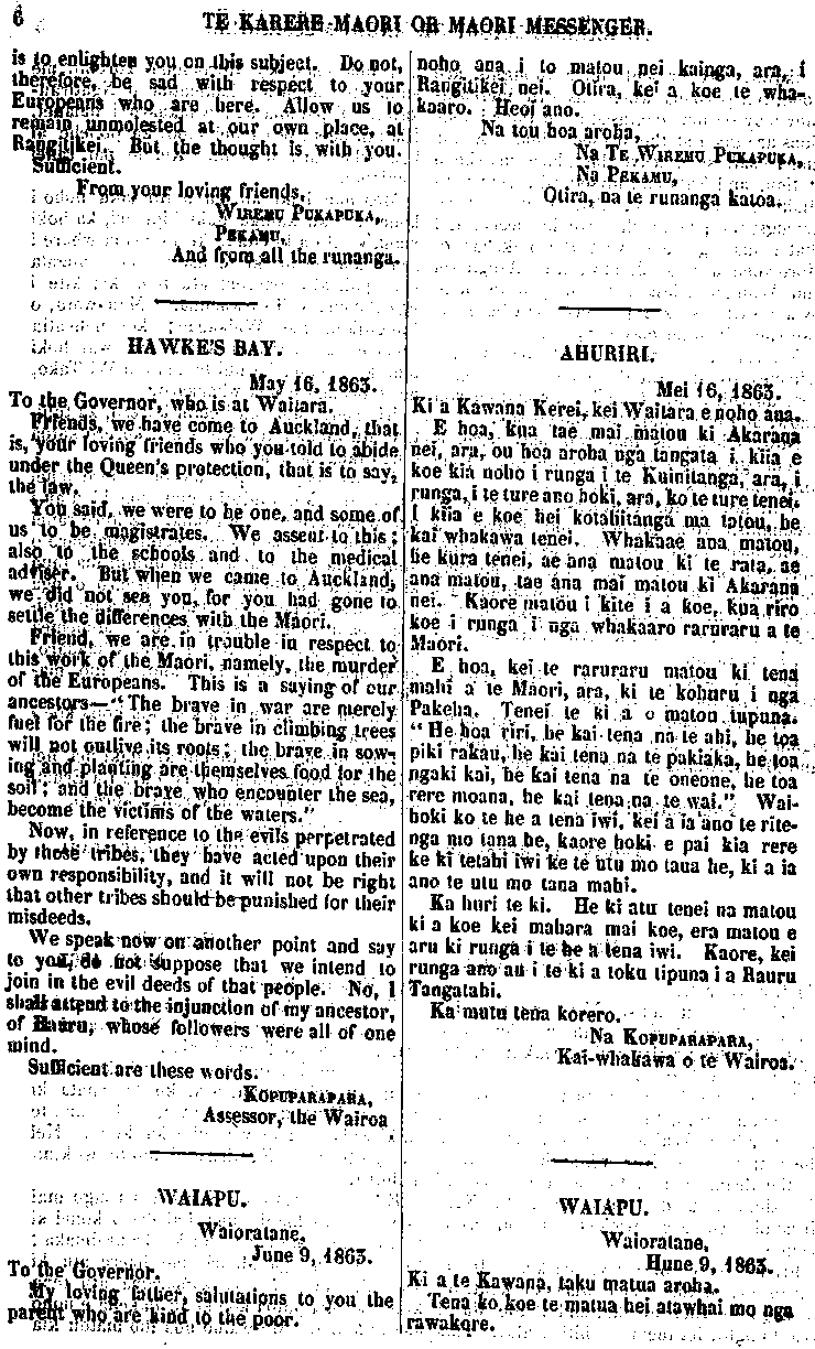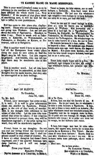 TE KARERE MAORI OR MAORI MESSENGER WIREMU PUKAPUKA PEKAMU HAWKE'S BAY Auckland Waitara KOPUPARAPARA Wairoa WAIAPU Waioratane AHURIRI Akarana