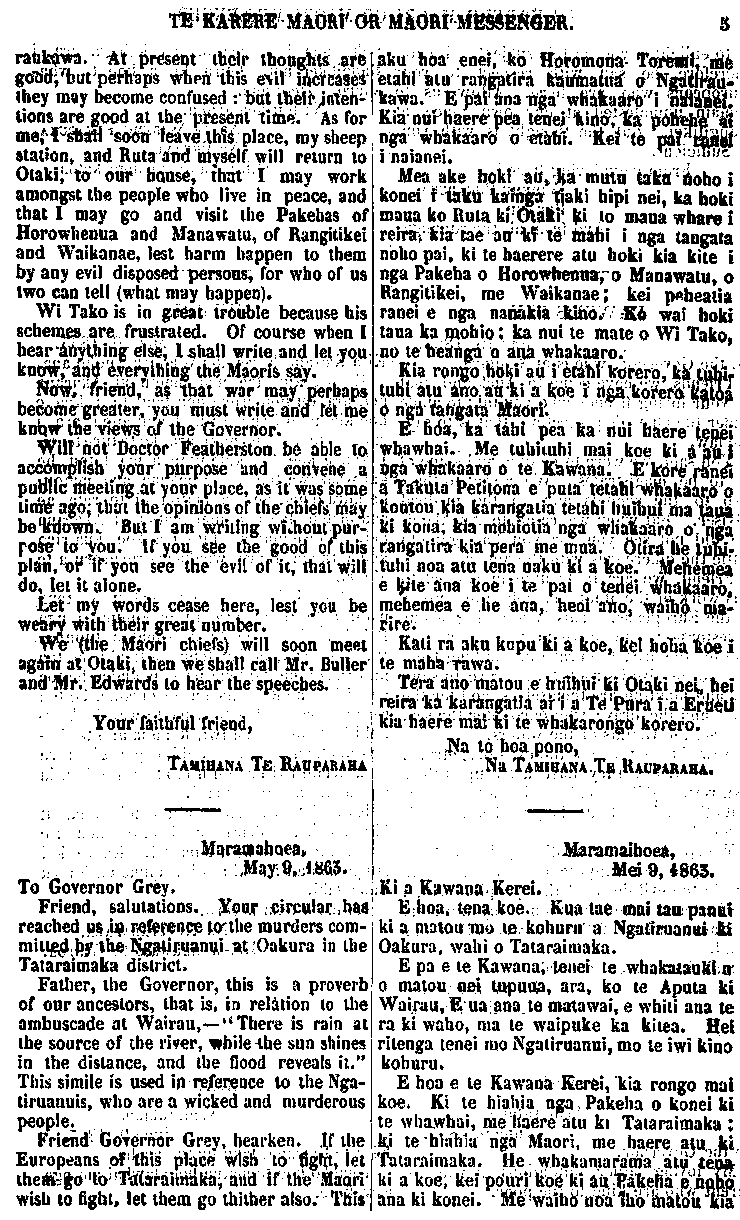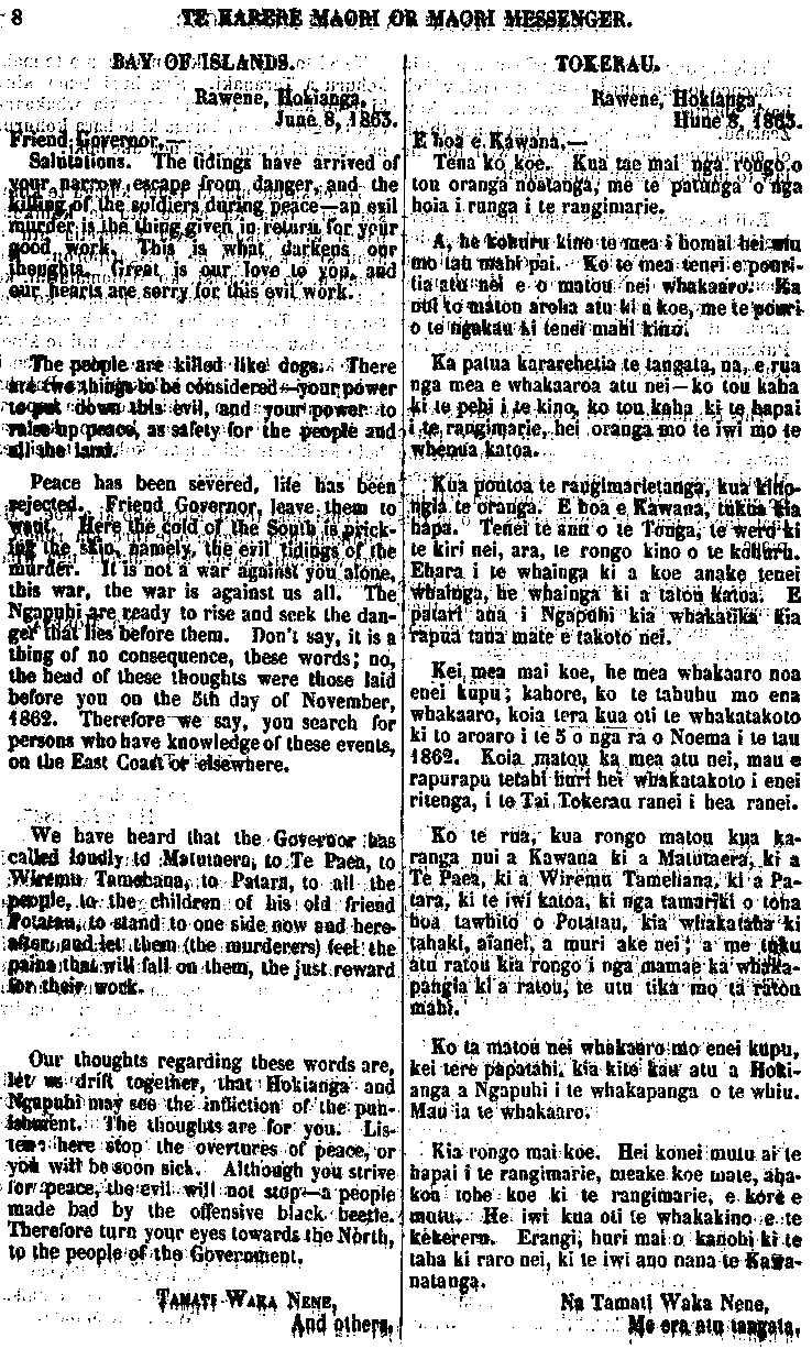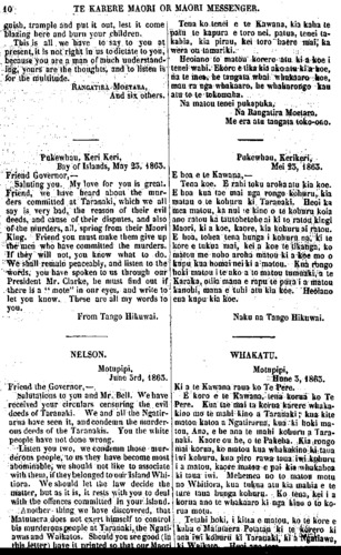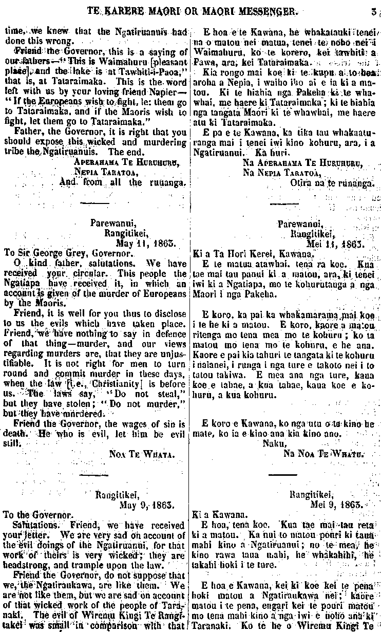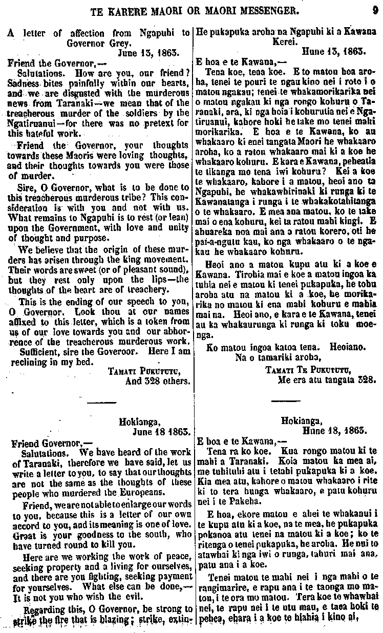 TE KARERE MAORI OR MAORI MESSENGER. 9 A letter of affection from Ngapuhi to Governor Grey. June 13, 1863. Friend the Governor,— Salutations. How are you, our friend ? Sadness bites painfully within our hearts, and we are disgusted with the murderous news from Taranaki— we mean that of the treacherous murder of the soldiers by the Ngatiruanui— for there was no pretext for this hateful work. Friend the Governor, your thoughts towards these Maoris were loving thoughts, and their thoughts towards you were those of murder. Sire, 0 Governor, what is to be done to this treacherous murderous tribe? This con-sideration is with you and not with us. What remains to Ngapuhi is to rest (or lean) upon the Government, with love and unity of thought and purpose. We believe that the origin of these mur-ders has arisen through the king movement. Their words are sweet (or of pleasant sound), but they rest only upon the lips— the thoughts of the heart are of treachery. This is the ending of our speech to you, O Governor. Look thou at our names affixed to this letter, which is a token from us of our love towards you and our abhor-rence of the treacherous murderous work. Sufficient, sire the Goveroor. Here I am reclining in my bed. TAMATI PUKUTUTU, And 328 others. Hokianga, June 18 1863. Friend Governor,— Salutations. We have heard of the work of Taranaki, therefore we have said, let us write a letter to you, to say that our thoughts are not the same as the thoughts of these people who murdered the Europeans. Friend, we are not able to enlarge our words to you, because this is a letter of our own accord to you, and its meaning is one of love. Great is your goodness to the south, who have turned round to kill you. Here are we working the work of peace, seeking property and a living for ourselves, and there are you fighting, seeking payment for yourselves. What else can be done, — It is not you who wish the evil. Regarding this, 0 Governor, be strong to strike the fire that is blazing; strike, extin-He pukapuka aroha na Ngapuhi ki a Kawana Kerei. Hune 13, 1863. E hoa e te Kawana,— Tena koe, tena koe. E to matou boa aro-ha, tenei te pouri te ngau kino nei i roto i o matou ngakau; tenei te whakamorikarika Dei o matou ngakau ki nga rongo kohuru o Ta-ranaki, ara, ki nga hoia i kohurutia nei e Nga-tiruanui, kahore hoki he lake mo ienei mahi morikarika. E hoa e le Kawana, ko aa whakaaro ki enei tangata Maori he whakaaro aroha, ko a ratou whakaaro mai ki a koe he whakaaro kohuru. £ kara e Kawana, peheatia te Ukanga mo tena iwi kohuru? Kei a koe le whakaaro, kahore i a matou, heoi ano ta Ngapuhi, be whakawhirinaki ki runga ki te Kawanatanga i runga i te whakakotahitanga o le whakaaro. £ mea ana matou, ko te lake mai o ena kohuru, kei ta ratou mahi kingi. E ahuareka noa mai ana a ratou korero, oti he pai-a-ngutu kau, ko nga whakaaro o te nga-kau be whakaaro kohuru. Heoi ano a matou kupu atu ki a koe e Kawana. Tirohia mai e koe a matou ingoa ka tuhia nei e matou ki ienei pukapuka, be tohu aroha am na matou ki a koe, he morika-rika no matou ki ena mahi kohuru e mahia mai na. Heoi ano, e kara e le Kawana, tenei au ka whakaurunga ki runga ki toku moe-nga. Ko matou ingoa katoa tena. Heoiano. Na o tamariki aroha, TAMATI TE PUKUTUTU, Me era atu tangata 328. Hokianga, Hune 18, 1863. E hoa e te Kawana,— Tena ra ko koe. Kua rongo matou ki te mahi a Taranaki. Koia matou ka mea ai, me tuhituhi atu i tetahi pukapuka ki a koe. Kia mea atu, kahore o matou whakaaro i rile ki to tera hunga whakaaro, e patu kohuru nei i le Pakeha. E boa, ekore matou e ahei le whakanui i te kupu atu ki a koe, na le mea, he pukapuka pokanoa atu ienei na matou ki a koe ; ko te ritenga o ienei pukapuka, he aroha. He nui to atawhai ki nga iwi o runga, tahuri mai ana, paiti ana i a koe. Tenei matou le mahi nei i nga mahi o le rangimarire, e rapu ana i te taonga mo ma-tou, i te ora mo matou. Tera koe le whawhai nei, te rapu nei i te utu mau, e taea hoki te pehea, ehara i a koe te Wahia i kino ai,