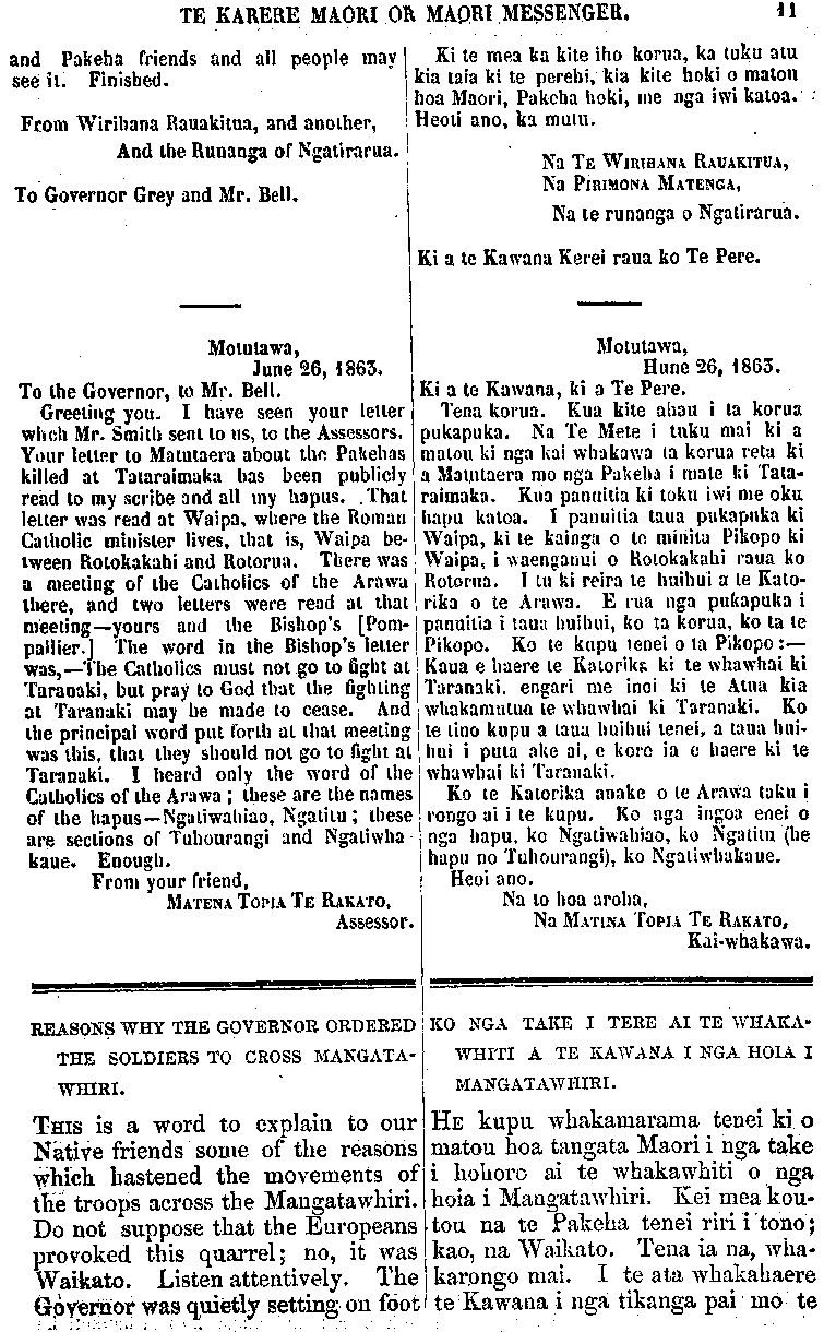 TE KARERE MAORI OR MAORI MESSENGER. 11 and Pakeha friends and all people may see it. Finished. From Wirihana Rauakitua, and another, And the Runanga of Ngatirarua. To Governor Grey and Mr. Bell. Motutawa, June 26, 1863. To the Governor, to Mr. Bell. Greeting you. I have seen your letter whch Mr. Smith sent to us, to the Assessors. Your letter to Matutaera about the Pakehas killed al Tataraimaka has been publicly read to my scribe and all my hapus. That letter was read at Waipa, where the Roman Catholic minister lives, that is, Waipa be-tween Rotokakahi and Rotorua. There was a meeting of the Catholics of the Arawa there, and two letters were read al that meeting— yours and the Bishop's [Pom-pallier.j The word in the Bishop's letter was,— The Catholics must not go to fight al Taranaki, but pray to God that the fighting al Taranaki may be made to cease. And the principal word put forth at that meeting was this, that they should not go to fight al Taranaki. I heard only the word of the Catholics of the Arawa ; these are the names of the hapus— Ngatiwahiao, Ngatitu ; these are sections of Tuhourangi and Ngatiwha kaue. Enough. From your friend, MATENA TOPIA TE RAKATO, Assessor. REASONS WHY THE GOVERNOR ORDERED THE SOLDIERS TO CROSS MANGATA-WHIRI. THIS is a word to explain to our Native friends some of the reasons which hastened the movements of the troops across the Mangatawhiri. Do not suppose that the Europeans provoked this quarrel; no, it was Waikato. Listen attentively. The Governor was quietly setting on footKi le mea ka kite iho korua, ka tuku atu kia taia ki te perehi, kia kite hoki o matou hoa Maori, Pakeha hoki, me nga iwi katoa. Heoti ano, ka mutu. Na TE WIRIHANA RAUAKITUA, Na PIRIMONA MATENGA, Na te runanga o Ngatirarua. Ki a te Kawana Kerei raua ko Te Pere. Motutawa, Hune 26, 1863. Ki a le Kawana, ki a Te Pere. Tena korua. Kua kite ahau i ta korua pukapuka. Na Te Mete i tuku mai ki a matou ki nga kai whakawa ta korua reta ki a Matutaera mo nga Pakeha i mate ki Tata-raimaka. Kua panuitia ki toku iwi me oku hapu katoa. I panuitia taua pukapuka ki Waipa, ki le kainga o te minita Pikopo ki Waipa, i waenganui o Rotokakahi raua ko Rotorua. I lu ki reira le huihui a te Kato-rika o le Arawa. £ rua nga pukapuka i panuitia i taua huihui, ko ta korua, ko ta te Pikopo. Ko le kupu tenei o ta Pikopo : — Kaua e haere le Katorika; ki le whawhai ki Taranaki, engari me inoi ki le Atua kia whakamutua te whawhai ki Taranaki. Ko le tino kupu a taua huihui ienei, a taua hui-hui i puta ake ai, e kore ia e haere ki te whawhai ki Taranaki. Ko te Katorika anake o le Arawa taku i rongo ai i te kupu. Ko nga ingoa enei o nga hapu, ko Ngatiwahiao, ko Ngatitu (he hapu no Tuhourangi), ko Ngatiwhakaue. Heoi ano. Na to hoa aroha, Na MATINA TOPIA TE RAKATO, Kai-whakawa. ! KO NGA TAKE I TERE AI TE WHAKA-WHITI A TE KAWANA I NGA HOIA I MANGATAWHIRI. HE kupu whakamarama tenei ki o matou hoa tangata Maori i nga take i hohoro ai te whakawhiti o nga hoia i Mangatawhiri. Kei mea kou-tou na te Pakeha tenei riri i tono ; kao, na Waikato. Tena ia na, wha-karongo mai. I te ata whakahaere te Kawana i nga tikanga pai mo te