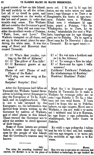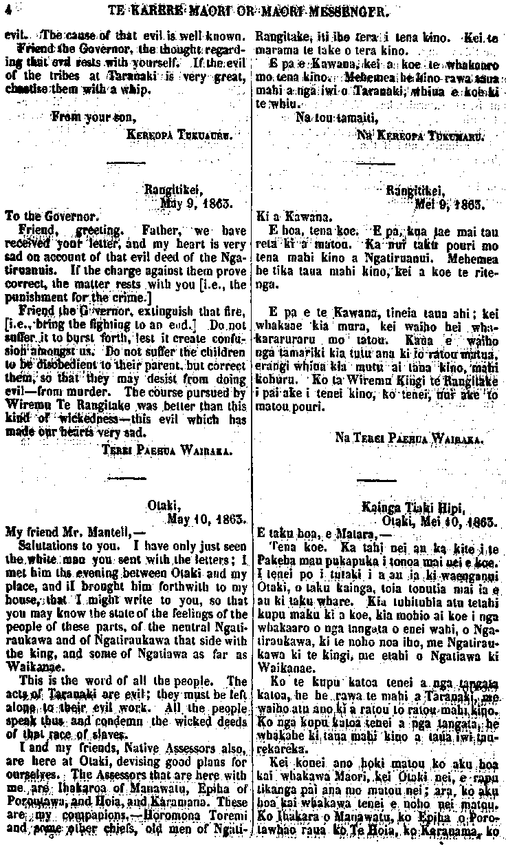 TE KARERE MAORI OR MAORI MESSENGER. 13 assembly, The intercepting parlies (haukoti) are lying (or are to lie) between Otahuhu ! and Drury, that is at Rape, Papakura, num-bering....... Let the Governor be on his guard. Wi Tamehana did not agree to that plan ; he did not give his consent, as it was without a cause. The plans of Waikato are their own, and those of Ngatitamaoho. Paora Kina and Aporo came to Rangiaohia. Father, be on your guard. Taati and the Ngatiapakura have started. It was he who consented to it, also the Ngatihinetu and the Urukopi. Not a man is left at Rangiaohia. The Ngatimaniapoto are on their way to the Ta. Father, war has commenced, the world is made evil. I cannot get to Auckland ; the Waikato is stopped; no man's talk is to be listened to how. This is the information which I have to give you; if nothing happens, it will be well. All these plans have been decided upon by all the tribes. Enough. From your friend, From ......... July 3, 1863. Listen to what I have to say. I have just heard evil news. I will not hide the evil from you my parents. Hearken. The tribes of this Island intend making an attack upon Auckland. This has been decided upon all over the Island ; all the chiefs of the Island have given their consent. An attack will be made. Be on your guard as to Auckland every day this month, keep on your guard during July and August. Let all Auckland be on the alert, throughout all its bounda-ries. The cause is, sympathy for Taranaki. Tell this to the Governor, that all Auck-and may be warned, and request him also .0 keep my name concealed. Keep me quite secret. From ......... July 4, 1863. . To Te...... friend, salutations. 0 ....... listen to what I have to say. Paora Kina and Aporo Tumua have come to Tamehana Tarapipipi to gel his consent, and he has consented to an attack upon the Ia, and even to include the town of Auckland [or, he has consented to the people of the Ia being killed, thetakoto ki le huarahi i te takiwa ki Otahuhu ki Turure, ara, ki le Rape i Papakura, : E ....... kia tupato le Kawana. Ko Wi Tame-hana kaore i pai ki taua ritenga, kaore ia i whakaae, he take kore. Na Waikato taua tikanga, na Ngatitamaoho. Ko Paora Kina raua ko Aporo i tae mai ki Rangiaohia. E pa, kia tupato. Kua riro atu a Ngatiapa kura me Taati, nana i whakaae, me Ngati-hinetu, me te Urukopi, kaore i mahue tetahi tangata kotahi o Rangiaohia, ko Ngatima-niapoto kei te haere atu ki Te Ia. E pa, kua huaki kua kino le ao. Ekore au e puta ki Akarana na, kua purua Wai-kato, kaore e whakarongo ki le korero o le tangata inaianei. Ko taku korero tena ki a koutou, e pai ana le kore, kua rite katoa tenei korero i nga iwi katoa. Heoi. Na tou hoa, Na ......... Hurae 3, 1863. E Kia rongo mai koe i taku korero. Ka-tahi ano ahau ka rongo i le korero kino. E kore au e huna i le kino ki a koutou ki oku matua. Kia rongo mai koe. Ka huaki nga iwi o le motu hei ki kona ki Akarana. Kua rile katoa ienei korero, puta noa i nga taha o te motu nei, kua whakaae nga rangatira katoa o te motu nei, e ! ka huaki, kia tupato Akarana i nga ra o ienei marama, kia tupato i nga ra o Hurae o Akuhata, kia mataara Akarana katoa puta noa i ona rohe katoa. Ko le take, be aroha ki Taranaki. Korerotia atu ki a Kawana ienei korero, kia whakatupatoria a Akarana katoa. Me ki atu e koe ki a ia, ko toku ingoa me huna kia ngaro te huna i au. Na . ........ Hurae 4, 1863. Ki a Te ...... £ hoa, tena koe. Whakarongo mai ki taku korero. Kua tae mai a Paora Kina raua ko Aporo Tumua ki a Tamehana Tara-pipipi, kia whakaaetia, kua whakaae a Tamehana kia patua a Te Ia, a taea atu ki le taone i Akarana. Ko nga pukapuka patu