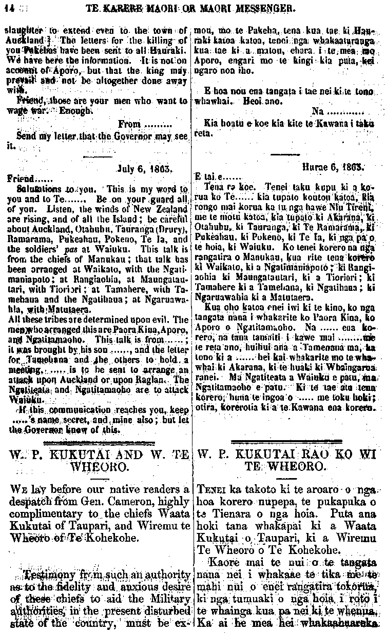 14 TE KARERE MAORl OR MAORl MESSENGER. Auckland Hauraki New Zealand Otahuhu Tauranga Drury Ramarama Pukeahau Pokeno Te Ia Waiuku Manukau Waikato Ngatimaniapoto Rangiaohia Maungatautari Tioriori Tamahere Tamehana Ngatihaua Ngaruawahia Matutaera Paora Kina Aporo Ngatitamaoho Raglan Ngatiteata W. P. KUKUTAI AND W. TE WHEORO Gen. Cameron Waata Kukutai Taupari Wiremu te Wheoro Te Kohekohe Niu Tireni Akarana Tauranga Te Ramarama W. P. KUKUTAI RAO KO WI TE WHEORO