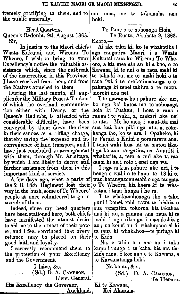 TE KARERE MAORI OR MAORI MESSENGER. tremely gratifying to them, and to the public generally. Head Quarters, Queen's Redoubt, 9th August 1863. Sir, Injustice to the Maori chiefs Waata Kukutai, and Wiremu Te Wheoro, I wish to bring to your Excellency's notice the valuable as-sistance which, since the outbreak of the insurrection in this Province, I have received from them, and from the Natives attached to them During the last month, all sup-plies for the Military Post at Tuakau of which the overland communica-tion either with Drury, or the Queen's Redoubt, is attended with considerable difficulty, have been conveyed by them down the river in their canoes, at a trifling charge, thereby saving the expense and in-convenience of land transport, and I have just concluded an arrangement with them, through Mr. Armitage, by which I am likely to derive still further assistance from them in this important kind of service. A few days ago, when a party of the 2 B. 18th Regiment lost their way in the bush, some of Te Wheoro' people at once volunteered to go in search of them. Indeed, since my head quarters have been stationed here, both chiefs have manifested the utmost desire to aid me to the utmost of their pow-er, and I feel convinced .that every reliance may be placed on their good faith and loyalty. I earnestly recommend them to the protection of your Excellency and the Government. I have, &c., (Sd.) D A. CAMERON, Lieut. General His Excellency the Governor, Aucklandmo raua, me te tokomaha ano hoki. Te Pane o te nohoanga Hoia, Te Ruato, Akuhata 9, 1863. Ekoro,— Ai ake taku ki, ko te whakatika i nga rangatira Maori, i a Waata Kukutai raua ko Wiremu Te Whe-oro, a kia mea atu au ki a koe, e te kawana, ki te nui o ta raua mahi ki te taha ki au, me te mahi hoki o to raua iwi, i te orokotimatanga o te pakanga ki tenei takiwa o te motu, moroki noa nei. I te marama kua pahure ake nei, ko nga kai katoa mo te nohoanga hoia ki Tuakau, i hoea e raua i runga i te waka, a, makari ake nei te utu. Me he mea, i mautatia mai aua kai, kua piki nga utu, a, roko-hanga iho, ko te ara i Opaheke, ki ;e Paraki o Ruini e poraruraru ana. [ tenei, wahi kua oti ta matou tika-nga ko aua rangatira, na Amutiti i whakarite, a, tera e nui ake ta rao mahi ki au i roto i enei nga wa. I nga ra kua pahure ake nei. i te tienga o etahi o te hapu te 18 ki te wao, karanga tonu etahi o nga tangata o Te Wheoro, kia haere ki te wha-katau i taua hunga i he ra. I te whakanohoanga iho o taku puni i konei, rahi rawa te hiahia o aua rangatira tokorua kia takahoa mai ki an, a pauaua ana raua ki te mahi i nga tikanga i manakohia e au ; na konei au i whakapono ai ki ta raua ki whakahoa — te piringa ki te Kuini. Na, e whiu atu aua au i taku kupu i runga i te kaha, kia ata tia-kina raua, e koe ano e te Kawana, e te Kawanatanga hoki. Na ko au, &c., (Sd.) D. A. CAMERON, Te Tienara. Ki te Kawana, Kei Akarana