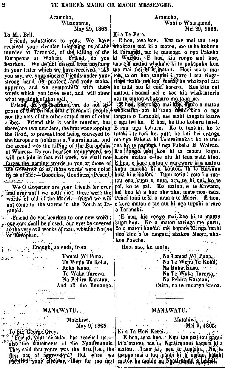 2 TE KARERE MAORI OR MAORI MESSENGER. Aramoho Whanganui Mr. Bell Taranaki Wairau Tataraimaka Tamati Wi Puna Te Wepu Te Koha Ruka Kuao Te Waka Tarewa Pehira Karatau MANAWATU Matahiwi Sir George Grey