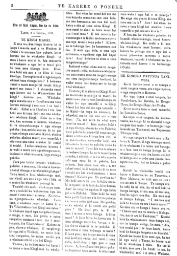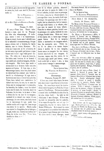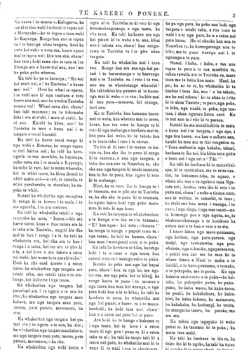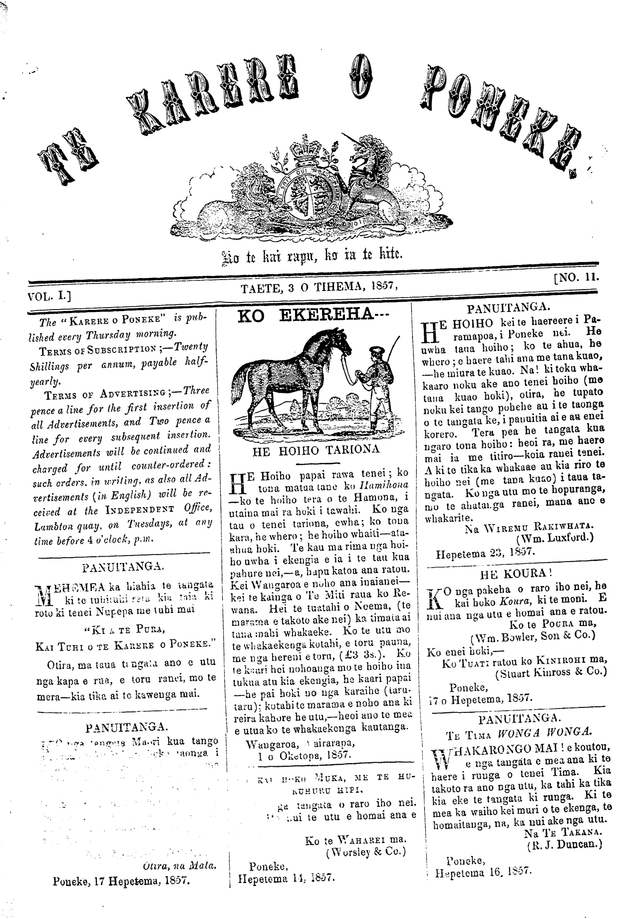 TE KARERE O PONEKE. Ko te kai rapu, ko ia te kite Vol 1.] TAETE, 3 O TIHEMA, 1857, [NO. 11. The "KARERE o PONEKE" is pub- lished every Thursday morning. TERMS OF SUBSCRIPTION; Twenty Shillings per annum, payable half- yearly. TERMS OF ADVERTISING; Three pence a line for the first insertion of all Advertisements, and Two pence a line for every subsequent insertion. Advertisements will be continued and charged for until counter-orderd: such orders, in writing, as also all Ad- vertisements ( in English ) will be re- ceived at the INDEPENDENT office, Lambton quay, on Tuesdays, at any time before 4 o'clock, p.m. PANUITANGA. MEHEMEA ka hiahia te tangata ki te tuhituhi reta kia taia ki roto ki tenei Nupepa me tuhi mai "KI A TE PURA, KAI TUHI O TE KARERE O PONEKE.' Otira, ma taua tangata ano e utu nga kapa e rua, e toru ranei mo te mera—kia tika ai te kawenga mai. PANUITANGA. Ko nga tangata Maori kua tango mea i toku Whare hoko taonga i Poneke, na kahore ano i utu, me hohoro ratou te whakarite i aua utu; kei tahuri atu au ki te Kai Whakawa. No te mea, ko nga Pakeha no ratou nga taonga i au, kua pa mai ki nga utu;—heoi ra, ma te homaitanga i era moni ka kaha ai au te utu i era pakeha NA WIREMU TONIKI. Otira, na Mata. Poneke, 17 Hepetema, 1857. KO EKEREHA HE HOIHO TARIONA HE Hoiho papai rawa tenei; ko tona matua tane ko Hamihona —ko te hoiho tera o te Hamona, i utaina mai ra hoki i tawahi. Ko nga tau o tenei tariona, ewha; ko tona kara, he whero; he hoiho whaiti—ata- ahua hoki. Te kau ma rima nga hoi- ho uwha i ekengia e ia i te tau kua pahure nei,—a, hapu katoa ana ratou. Kei Wangaroa e noho ana inaianei— kei te kainga o Te Miti raua ko Re- wana. Hei te tuatahi o Noema, (to marama e takoto ake nei) ka timata ai tana mahi whakaeke. Ko te utu mo te whakaekenga kotahi, e toru pauna, me nga hereni e toru, (Ł3 3s.). Ko te kaari hei nohoanga mo te hoiho ina tukua atu kia ekengia, he kaari papai —he pai hoki no nga karaihe (taru- taru); kotahi te marama e noho ana ki reira kahore he utu,—heoi ano te mea e utua ko te whakaekenga kautanga. Wangaroa, Wairarapa, 1 o Oketopa, 1857. HE KAI HOKO MUKA, ME TE HU- RUHURU HIPI. KO nga tangata o raro iho nei. He nui te utu e homai ana e ratou. Ko te WAHAREI ma. (Worsley & Co.) Poneke, Hepetema 14, 1857. PANUITANGA. HE HOIHO kei te haereere i Pa- ramapoa, i Poneke nei. He uwha taua hoiho; ko te ahua, he whero; e haere tahi ana me tana kuao, —he miura te kuao. Na! ki toku wha- kaaro noku ake ano tenei hoiho (me tana kuao hoki), otira, he tupato noku kei tango pohehe au i te taonga o te tangata ke, i panutia ai e au enei korero. Tera pea he tangata kua ngaro tona hoiho: heoi ra, me haere mai ia me titiro—koia ranei tenei. A ki te tika ka whakaae au kia riro te hoiho nei (me tana kuao) i taua ta- ngata. Ko nga utu mo te hopuranga, mo te ahatanga ranei, mana ano e whakarite. Na WIREMU RAKIWHATA. (Wm. Luxford.) Hepetema 23, 1857. HE KOURA! KO nga pakeha o raro iho nei, he kai hoko Koura, ki te moni. E nui ana nga utu e homai ana e ratou. Ko te POURA ma, (Wm. Bowler, Son & Co.) Ko enei hoki,— Ko TUATI ratou ko KINIROHI ma, (Stuart Kinross & Co.) Poneke, 17 o Hepetema, 1857. PANUITANGA. TE TIMA WONG WONGA. WHAKARONGO MAI! e koutou, e nga tangata e mea aua ki te haere i runga o tenei Tima. Kia takoto ra ano nga utu, ka tahi ka tika kia eke te tangata ki runga. Ki te mea ka waiho kei muri o te ekenga, te homaitanga, na, ka nui ake nga utu. Na TE TAKANA. (R. J. Duncan.) Poneke, Hepetema 16, 1857.
