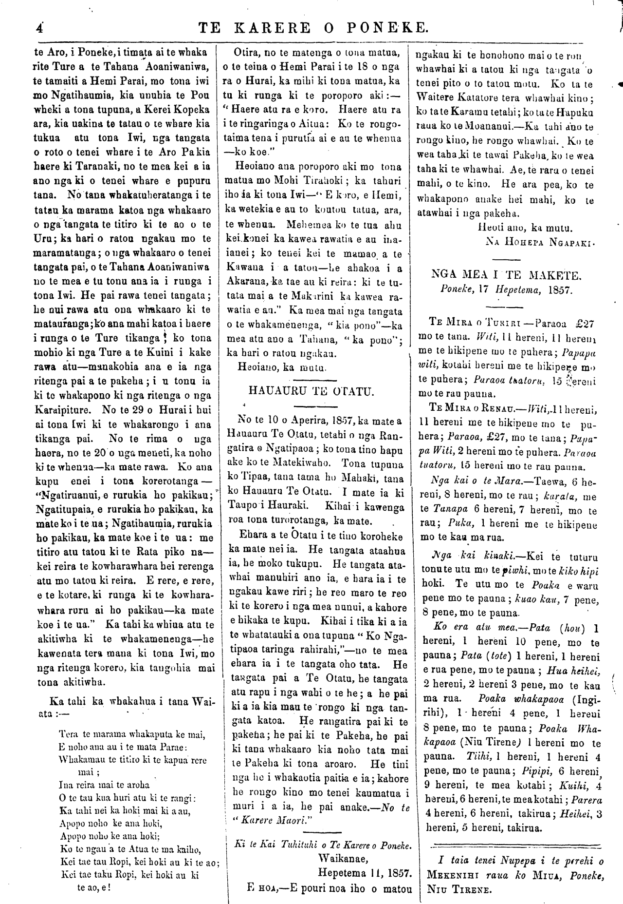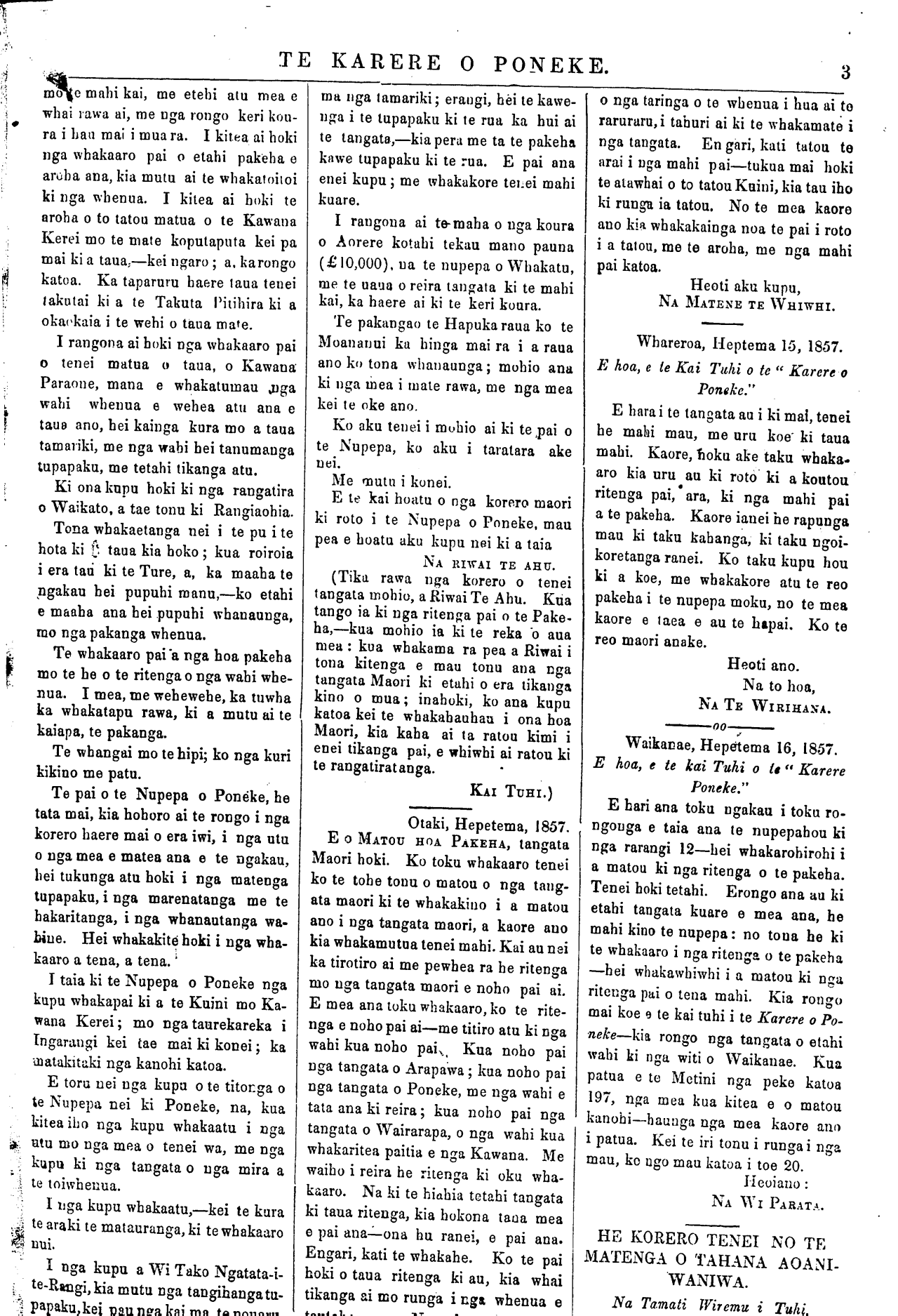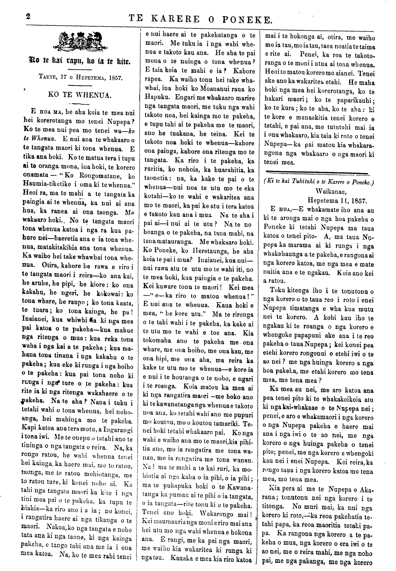 2 TE KARERE O PONEKE. Ko te kai rapu, ko ia te kite. TAETE, 17 o HEPETEMA, 1857. KO TE WHENUA. E HOA MA, he aha koia te mea nui hei korerotanga mo tenei Nupepa? Ko te mea nui pea mo tenei wa—ko te Whenua. E nui ana te whakaaro o te tangata maori ki tona whenua. E tika ana hoki. Ko te matua tera i tupu ai te oranga mona, ina hoki, te korero onamata — " Ko Rongomatane,, ko Haumia-tiketike i omaki te whenua." Heoi ra, ma te mahi a te tangata ka paingia ai te whenua, ka nui ai ana hua, ka ranea ai ona taonga. Me whakaaro hoki. No te tangata maori tona whenua katoa i nga ra kua pa- hure nei—haeretia ana e ia tona whe- nua, matakitakihia ana tona whenua. Ka waiho hei take whawhai tona whe- nua. Otira, kahore he rawa e tiro i te tangata maori i reira—ko ana kai, he aruhe, he pipi, he kiore: ko ona kakahu, he ngeri, he kokowai: ko tona wharo, he raupo; ko tona kaata, te tuara; ko tona kainga, he pa! Inaianei, kua whiwhi ia ki nga mea pai katoa o te pakeha—kua mahue nga ritenga o mua: kua reka tona waha i nga kai a te pakeha; kua ma- hana tonu tinana i nga kakahu o te pakeha; kua eke ki runga i nga hoiho o te pakeha: kua pai tona noho ki runga i nga? ture o te pakeha: kua rite ia ki nga ritenga wakahaere o te pakeha. Na te aha? Nana i tuku i tetahi wahi o tona whenua, hei noho- anga, hei mahinga mo te pakeha. Kapi katoa ana tera motu, a Ingarangi i tona iwi. Me te onepu o tatahi ano te tininga o nga tangata o reira. Na, ka rongo matou, he wahi whenua tenei hei kainga, ka haere mai, me to ratou, taonga, me to ratou mohiotanga, me to ratou ture, ki konei noho ai. Ka tahi nga tangata maori ka kite i ngu tini mea pai o te pakeha, ka tupu te hiahia—ka riro ano i a ia; no konei, i rangatira haere ai nga tikanga o te maori. Nakoa, ko nga tangata e noho tata ana ki nga taone, ki nga kainga pakeha, e tango tahi aua me ia i ona mea katoa. Na, ko te mea rahi tenei e nui haere ai te pakehatanga o te maori Me tuku ia i nga wahi whe- nua e takoto kau aua. He aha te pai mona o te nuinga o tona whenua? E taia koia te mahi e ia? Kahore rapea. Ka waiho tonu hei take wha- whai, ina hoki ko Moananui raua ko Hapuku. Engari me whakaaro marire nga tangata maori, me tuku nga wahi takoto noa, hei kainga mo te pakeha, e tupu tahi ai te pakeha me te maori, ano he tuakana, he teina. Kei te takoto noa hoki te whenua—kahore ona painga, kahore ona ritenga mo te tangata. Ka riro i te pakeha, ka ruritia, ko nohoia, ka huarahitia,, ka taonetia: ua, ka kake te pai o te whenua—nui noa te utu mo te eka kotahi—ko te wahi e wakaritea ana mo te maori, kapai ke atu i tera katoa e takoto kau ana i mua. Na te aha i pai ai—i nui ai te utu? Na te no hoanga o te pakeha, na tana mahi, na tana matauranga. Me whakaaro hoki. Ko Poneke, ko Heretaunga, he aha koia te pai i mua? Inaianei, kua nui— nui rawa atu te utu mo te wahi iti, no te mea hoki, kua paingia e te pakeha. Kei kuware tonu te mauri! Kei mea —" e—ka riro to matou whenua! " E nui ana te whenua. Kaua hoki e mea, " he kore utu." Ma te rironga o te tahi wahi i te pakeha, ka kake ai te utu mo te wahi e toe ana. Kia tokomaha ano te pakeha me ona whare, me ona hoiho, me ona kau, me ona hipi, me ona aha, ma reira ka kake te utu mo te whenua—e kore ia e nui i te houtanga o te noho, e ngari i te roanga. Koia matou ka mea ai ki nga rangatira maori —me hoko ano ki te kawanatanga nga whenua e takoto noa ana. ko tetahi wahi ano me pupuri mo koumu, mo o koutou tamariki. Te- nei hoki tetahi whakaaro pai. Ko nga wahi e waiho ana mo te maori, kia pihi- tia ano, mo ia rangatira me tona wa- nau, mo ia rangatira me tona wanau. Na! ma te mahi a te kai ruri, ka mo- hiotia ai nga kaha o ia pihi, o ia pihi; ma te pukapuka hoki o te Kawana- tanga ka pumau ai te pihi o ia tangata, o ia tangata—rite tonu ki o te pakeha. Tenei ano hoki. Wakarongo mai! Kei maumauria nga moni e riro mai ana hei utu mo nga wahi whenua e hokona ana. E rangi, me ka pai nga maori, me waiho kia wakaritea ki runga ki ngatau. Kauaka e mea kia riro katoa mai i te hokonga ai, otira, me waiho mo ia tau, mo ia tau, taea noatia te taima e rite ai. Penei, ka roa te takoto- ranga o te moni i utua ai tona whenua. Heoi to matou korero mo aianei. Tenei ake ano ka wakaritea etahi. He maha hoki nga mea hei korerotanga, ko te hakari maori; ko te paparikauhi; ko te kura; ko te aha, ko te aha: ki te kore e manaakitia tenei korero e tetahi, e pai ana, me tututuhi mai ia i ona whakaaro, kia taia ki rato o tenei Nupepa—ka pai ratou kia whakara- ngona nga whakaaro o nga maori ki tenei mea. (Ki te kai Tuhituhi o te Karere o Poneke.) Waikanae, Hepetema 11, 1857. E HOA,—E whakamate iho ana au ki te aronga mai o nga hoa pakeha o Poneke ki tetahi Nupepa ma taua katoa o tenei pito- A, ma taua Nu- pepa ka marama ai ki runga i nga whakahaunga ate pakeha, e rangona ai nga korero katoa, me nga mea e mate nuitia aua e te ngakau. Koia ano kei a ratou. Tuku kitenga iho i te tonutonu o nga korero o to taua reo i roto i enei Nupepa timatanga e wha kua mutu nei te korero. A kohi kau iho te ngakau ki te roanga o nga korero e whengoke papapuni ake ana i te reo pakeha o taua Nupepa; kei konei pea etehi korero rongonui o etehi iwi o te ao nei? me nga huinga korero a nga hoa pakeha, me etahi korero mo tena mea, mo tena mea? Ka mea au nei, me aro katoa ana pea tenei pito ki te whakakoikoia atu ki nga kai-whakaae o te Nupepa nei; penei, e aro e whakamaori i nga korero o nga Nupepa pakeha e haere mai ana i nga iwi o te ao nei, me nga korero o nga huinga pakeha o tenei pito; penei, me nga korero e whengoki kau nei i enei Nupepa, Kei reira, ka rongo taua i nga korero katoa mo tena mea, mo tena mea. Kia pera ai me te Nupepa o Aka- rana; tonutonu nei nga korero i te titonga. No muri mai, ka nui nga I korero ki roto,—ka reoa pakehatia te- tahi papa, ka reoa maoritia tetahi pa- pa. Ka rangona nga korero a te pa- keha o mua, nga korero o era iwi o te ao nei, me o reira mahi, me nga noho pai, me nga pakanga, me nga korero
