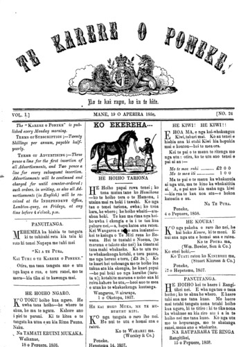 TE KARERE O PONEKE Ko te kai rapu, ko ia te kite. [VOL I, MANE, 19 o APERIRA 1858, NO. 24] The "KARERE O PONEKE" is pub- lished every Thursday morning. TERMS OF SUBSCRIPTION;- Twenty Shillings per annum, payable half- yearly. TERMS OF ADVERTISING;- Three pence a line for the first insertion of all advertisements, and Two pence a line for every subsequent insertion. Advertisments wil be continued and charged for until counter-ordered: such orders in writing, as also all Ad- vertisements (in English) will be re- ceived at the INDEPENDENT Office, Lambton-quay, on Tuesdays, at any time before 4 o'clock, p.m. PANUITANGA. MEHEMEA ka hiahia te tangata ki te tuhituhi reta kia taia ki roto ki tenei Nupepa mo tuhi mai "KI A TE PURA, KAI TUHI o TE KAREKE o PONEKE." Otira, ma taua tangata ano e utu nga kapa e rua, e toru ranei, mo te mera—kia tika ai te kawenga mai. HE HOIHO NGARO. KO TOKU hoiho kua ngaro. He uwha taua hoiho—he whero te ahua, he ma te ngutu. Kahore ano i piri te parani. Ki te kitea e te tangata ka utua e au kia Rima Pauna. Naku. Na TAMATI ERUINI MUKAKA. Waikanae, 18 o Pepuere 1858. KO EKEREHA HE HOIHO TARIONA HE Hoiho papai rawa tenei; ko tona matua tane ko Hamihona —ko te hoiho tera o te Hamona, i utaina mai ra hoki i tawahi. Ko nga tau o tenei tariona, ewha; ko tona kara, he whero; he hoiho whaiti—ata- ahua hoki. Te kau ma rima nga hoi- ho uwha i ekengia a e ia i te tau kua pahure nei,—a, hapu katoa ana ratou. Kei Wangaroa e noho ana inaianei— kei te kainga o Te Miti raua ko Re- wana. Hei te tuatahi o Noema, (te marama e takoto ake nei) ka timata ai tana mahi whakaeke. Ko te utu mo te whakaekenga kotahi, e toru pauna, me nga hereni e toru, (Ł3 35s.) Ko te kaari hei nohoanga mo te hoiho ina tukua atu kia ekengia, he kaari papai —he pai hoki no nga karaihe (taru- taru); kotahi te marama e noho ana ki reira kahore he utu,—heoi ano te mea e utua ko" te whakaekenga kautanga. Wangaroa, Wairarapa, 1 o Oketopa, 1807. HE KAI HOKO MUKA, ME TE HU- RUHURU HIPI. KO nga tangata o raro iho nei. He nui te utu e homai ana e ratou. Ko te WAHAREI ma. (Worsely & Co.) Poneke. HE KIWI! HE KIWI! EHOA MA, e nga kaiwhakangau Kiwi, tahuri mai. Ko au tenei hiahia ana ki etahi Kiwi kia hopukia mai e koutou—hei te mea ora. Kei te pai o te manu te ritenga mo nga utu: otira, ko te utu ano tenei pai ai au:— Mo te mea rahi ......... Ł200 Mo te mea iti ............ 100 Ma te pai o te manu ka whakanuia ai nga utu, ma te kino ka whakaititia ai. A, e pai ano kia maha nga kiwi —kia rua te kau noa atu—e hokoa katoatia e au. NA TE PURA. Poneke, 4 o Pepuere, 1858. HE KOURA! KO nga pakeha o raro iho nei, he kai hoko Koura, ki te moni. E nui ana nga utu e homai ana e ratou. Ko te POURA ma, (Wm. Bowler, Son & Co.) Ko enei hoki,— Ko TUATI ratou ko KINIROHI ma, (Stuart Kinross & Co.) Poneke, 17 o Hepetema, 1857. PANUITANGA. He Hoiho kei te haere i Rangi- tikei nei. E wha nga tau o taua hoiho; ko te ahua he whero. Ehaere tahi ana me tana kuao. Me haere mai tetahi tangata nona tetahi hoiho kua ngaro, ki te titiro: ki te tika nona ka whakaae au kia riro atu i a ia te hoiho nei me tana kuao. Ko nga utu mo te hopuranga, mo te ahatanga ranei, mana ano e whakarite. NA RAUPARAHA TE RINGA Rangitikei, 15 o Pepuere, 1858
