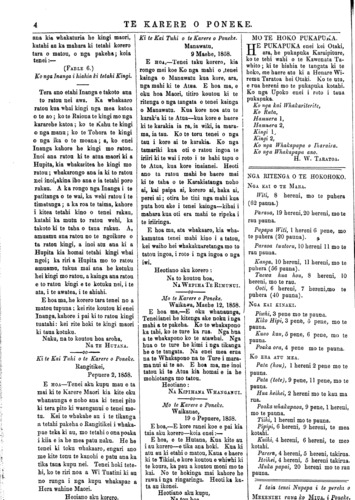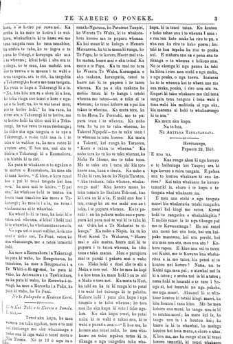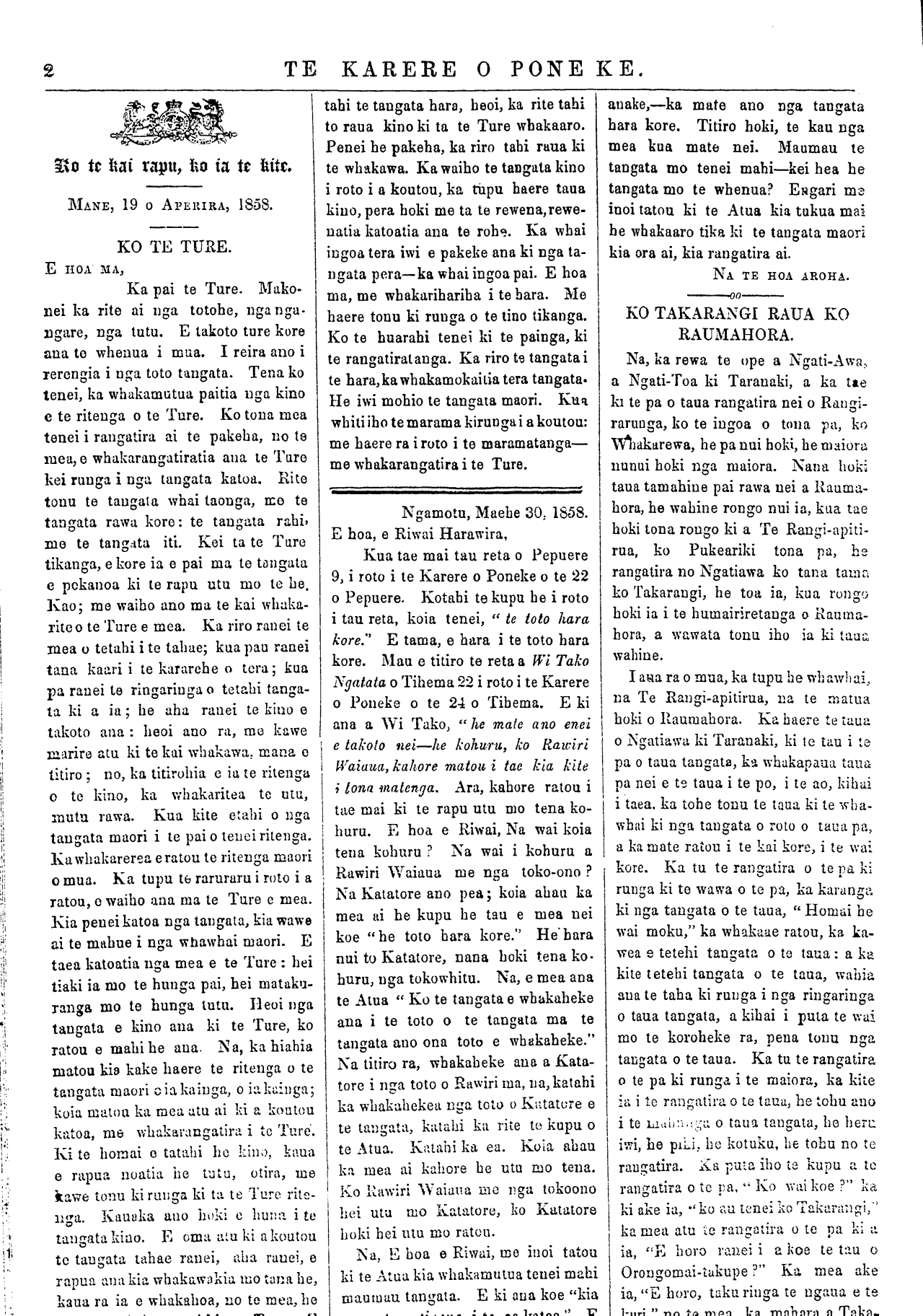 TE KARERE O PONE KE. Ko te kai rapu, ko ia te kite. MANE, 19 o APERIRA, 1858. KO TE TURE. E HOA MA, Ka pai te Ture. Mako- nei ka rite ai nga totohe, nga nga- ngare, nga tutu. E takoto ture kore ana te whenua i mua. I reira ano i rerengia i nga toto tangata. Tena ko tenei, ka whakamutua pakia nga kino e te ritenga o te Ture. Ko toua mea tenei i rangatira ai te pakeha, no te mea, e whakarangatiratia ana te Ture kei runga i nga tangata katua. Rite tonu te tangata whai taonga, me te tangata rawa kore: te tangata rahi me te tangata iti. Kei ta te Tare tikanga, e kore ia o pai ma te tangata e pokanoa ki te rapu utu mo te he. Kao; me waiho ano ma te kai whaka- ritea te Ture e mea. Ka riro ranei te mea o tetahi i te tahae; kua pau ranei tana kaari i te kararehe o tera; kua pa ranei te ringaringa o tetahi tanga- ta ki a ia; he aha ranei te kino e takoto ana: heoi ano ra, mo kawe marire atu ki te kai whakawa, mana o titiro; no, ka titirohia e ia te ritenga o te kino, ka whakaritea te utu, mutu rawa. Kua kite etahi o nga tangata maori i te pai o tenei ritenga. Ka whakarerea e ratou te ritenga maori o mua. Ka tupu te raruraru i roto i a ratou, o waiho ana ma te Ture e mea. Kia penei katoa nga tangata, kia wawe ai te mahue i nga whawhai maori. E taea katoatia nga mea e te Ture: hei tiaki ia mo te hunga pai, hei mataku- ranga mo te hunga tutu. Heoi nga tangata e kino ana ki te Ture, ko ratou e mahi he aua. Na, ka hiahia matou kia kake haere te ritenga o te tangata maori o ia kainga, o ia kainga; koia matou ka mea utu ai ki a koutou katoa, me whakarangatira i te Ture. Ki te homai o tatahi he kino, kaua e rapua noatia he tutu, otira, me kawe tonu ki runga ki ta te Ture rite- nga. Kauaka ano hoki e huna i te tangata kino. E oma atu ki a koutou te tangata tahae ranei, aha ranei, e rapua ana kia whakawakia mo tana he, kaua ra ia e whakahoa, no te mea, he tahi te tangata hara, heoi, ka rite tahi to raua kino ki ta te Ture whakaaro. Penei he pakeha, ka riro tahi raua ki te whakawa. Ka waiho te tangata kino i roto i a koutou, ka tupu haere taua kino, pera hoki me ta te rewena, rewe- natia katoatia ana te rohe. Ka whai ingoa tera iwi e pakeke ana ki nga ta- ngata pera—ka whai ingoa pai. E hoa ma, me whakarihariha i te hara. Me haere tonu ki runga o te tino tikanga. Ko te huarahi tenei ki te painga, ki te rangatiratanga. Ka riro te tangata i te hara, ka whakamakaitia tera tangata He iwi mohio te tangata maori Kua whiti iho te marama kirunga i a koutou: me haere ra i roto i te maramatanga— me whakarangatira i te Ture. Ngamotu, Maehe 30, 1858. E hoa, e Riwai Harawira, Kua tae mai tau reta o Pepuere 9, i roto i te Karere o Poneke o te 22 o Pepuere. Kotahi te kupu hei roto i tau roto, koia tenei, " te toto hara kore." E tama, e hara i te toto hara kore. Mau e titiro te reta a Wi Tako Ngatata o Tihema 22 i roto i te Karere o Poneke o te 24 o Tihema. E ki ana a Wi Tako, "he mate ano enei e takoto nei—he kohuru, ko Rawiri Waiaua, kahore matou i tae kia kite i tona matenga. Ara, kahore ratou i tae mai ki te rapu utu mo tena ko- huru. E hoa e Riwai, Na wai koia tena kohuru? Na wai i kohuru a Rawiri Waiaua me nga toko-ono? Na Katatore ano pea; koia ahau ka mea ai he kupu he tau e mea nei koe "he toto hara kore." He hara nui to Katatore, nana hoki tena ko- huru, nga tokowhitu. Na, e mea ana te Atua " Ko te tangata e whakaheke ana i te toto o te tangata ma te tangata ano ona toto e whakaheke." Na titiro ra, whakaheke ana a Kata- tore i nga toto o Rawiri ma, na, katahi ka whakahekea nga toto o Katatore e te tangata, katahi ka rite te kupu o te Atua. Katahi ka ea. Koia ahau ka mea ai kahore he utu mo tena. Ko Rawiri Waiaua me nga tokoono hei utu mo Katatore, ko Katatore hoki hei utu mo ratou. Na, E hoa e Riwai, mo inoi tatou ka te Atua kia whakamutua tenei mahi maumau tangata. E ki aua koe "kia anake,—ka mate ano nga tangata hara kore. Titiro hoki, te kau nga mea kua mate nei. Maumau te tangata mo tenei mahi—kei hea he tangata mo te whenua? Engari me inoi tatou ki te Atua kia tukua mai he whakaaro tika ki te tangata maori kia ora ai, kia rangatira ai. NA TE HOA AROHA. KO TAKARANGI RAUA KO RAUMAHORA. Na, ka rewa te ope a Ngatiawa, a Ngati-Toa ki Taranaki, a ka tae ka te pa o taua rangatira nei o Rangi- rarunga, ko te ingoa o tona pu, ko Whakarewa, he pa nui hoki, he maiora nunui hoki nga maiora. Nana hoki taua tamahine pai rawa nei a Rauma- hora, he wahine rongo nui ia, kua tae hoki tona rongo ki a Te Rangi-apiti- rua, ko Pukeariki tona pa, he rangatira no Ngatiawa ko tana tama ko Takarangi, he toa ia, kua rongo hoki ia i te humairiretanga o Rauma- hora, a wawata toua iho ia ki taua wahine. I aua ra o mua, ka tupu he whawhai, na Te Rangi-apitirua, na te matua hoki o Raumahora. Ka haere te taua o Ngatiawa ki Taranaki, ki te tau i te pa o taua tangata, ka whakapaua taua pa nei e te taua i te po, i te ao, kihai i taea. ka tohe tonu te taua ki te wha- whai ki nga tangata o roto o taua pa, a ka mate ratou i te kai kore, i te wai kore. Ka tu te rangatira o te pa ki runga ki te wawa o te pauna, ka karanga ki nga tangata o te taua, " Homai he wai moku," ka whakaae ratou, ka ka- wea e tetehi tangata o to taua: a ka kite tetehi tangata o te taua, wahia aua te taha ki runga i nga ringaringa o taua tangata, a kihai i puia te wai mo te koroheke ra, pena tonu nga tangata o te taua. Ka tu te rangatira o te pa ki runga i te maiora, ka kite ia i te rangatira o te taua, he tohu ano i te mahinga o taua tangata, he heru iwi, he pihi, he kotuku, he tohu no te rangatira. Ka puta iho ta kupu a te rangatira o te pa, " Ko wai koe?" ka ki ake ia, "ko atu tenei ko Takarangi," ka mea atu te rangatira o te pa ki a ia, "E horo ranei i a koe te tau o Orongomai-takupe?" Ka mea ake ia, "E horo, taku ringa te ngaua e te kuri" no te mea ka mahara a Taka-