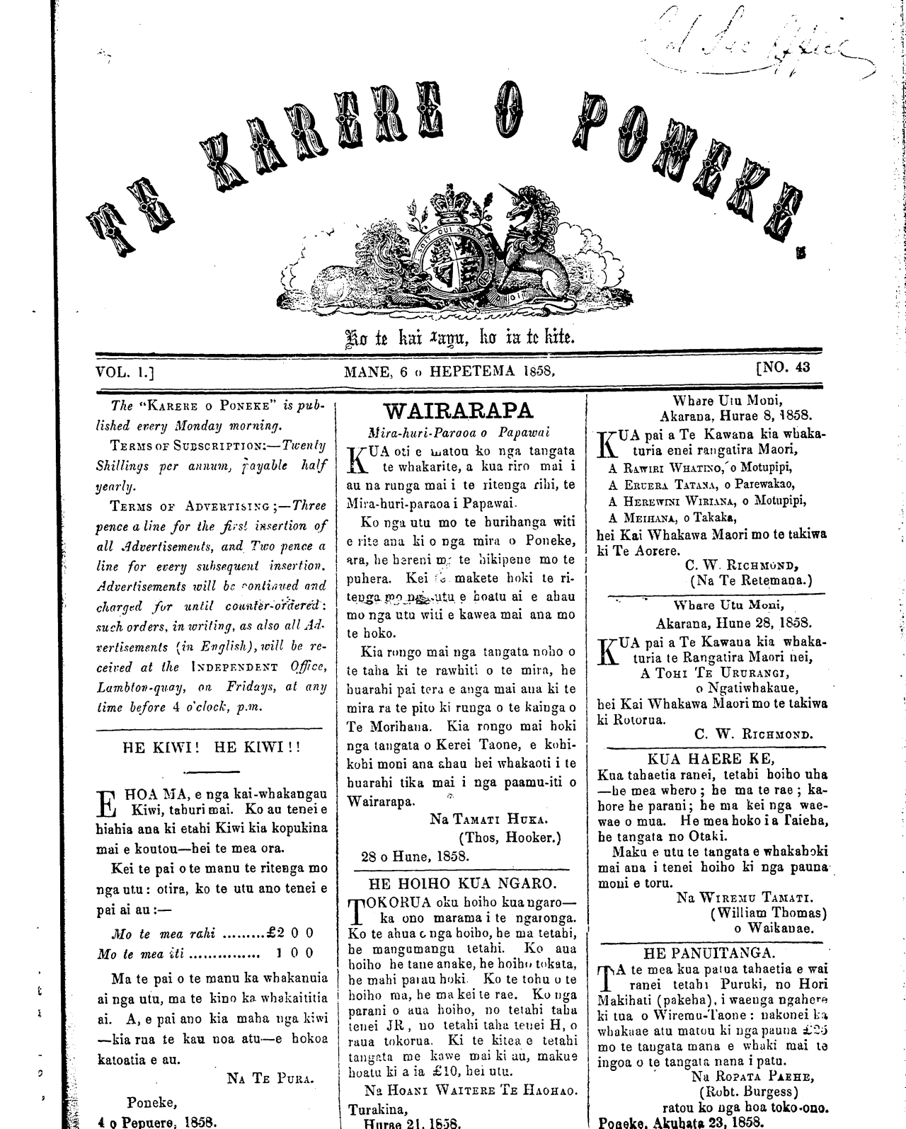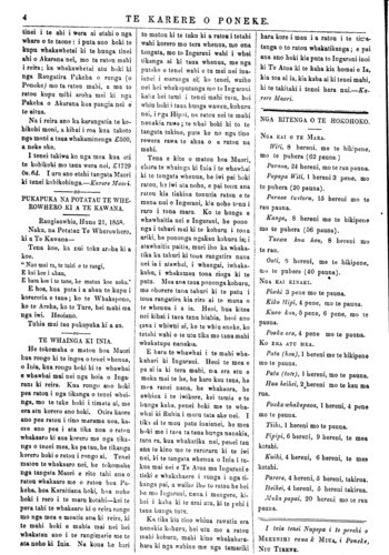 TE KARERE O PONEKE Ko te kai rapu, ko ia te kite. [VOL I, MANE, 6 o HEPETEMA 1858, NO. 43] The "KARERE O PONEKE" is pub- lished every Thursday morning. TERMS OF SUBSCRIPTION;- Twenty Shillings per annum, payable half- yearly. TERMS OF ADVERTISING;- Three pence a line for the first insertion of all advertisements, and Two pence a line for every subsequent insertion. Advertisments wil be continued and charged for until counter-ordered: such orders in writing, as also all Ad- vertisements (in English) will be re- ceived at the INDEPENDENT Office, Lambton-quay, on Tuesdays, at any time before 4 o'clock, p.m. HE KIWI! HE KIWI! EHOA MA, e nga kaiwhakangau Kiwi, tahuri mai. Ko au tenei hiahia ana ki etahi Kiwi kia hopukia mai e koutou—hei te mea ora. Kei te pai o te manu te ritenga mo nga utu: otira, ko te utu ano tenei pai ai au:— Mo te mea rahi ......... £200 Mo te mea iti ............ 100 Ma te pai o te manu ka whakanuia ai nga utu, ma te kino ka whakaititia ai. A, e pai ano kia maha nga kiwi —kia rua te kau noa atu—e hokoa katoatia e au. NA TE PURA. Poneke, 4 o Pepuere, 1858. WAIRARAPA Mira-huri-paraoa o Papawai. Kua oti e matou ko nga tangata te whakarite, a kua riro mai i au na runga mai i te ritenga rihi, te Mira-huri-paraoa i Papawai. Ko nga utu mo te hurihanga witi e rite ana ki o nga mira o Poneke, ara, he hereni me te hikipene mo te puhera. Kei te makete hoki te ri- tenga mo nga utu e hoatu ai e ahaua mo nga utu witi o kawea mai aua mo te hoko. Kia rongo mai nga tangata noho o te taha ki te rawhiti o te mira, he huarahi pai tera o anga: mai ana ki to mira ra te pito ki runga o te kainga o Te Merihana. Kia rongo mai hoki nga tangata o Kerei Taone, e kohi- kohi moni ana ahau hei whakaoti i te huarahi tika mai i nga paamu-iti o Wairarapa. Na TAMATI HUKA. (Thos, Hooker.) 28 o Hune, 1858 HE HOIHO KUA NGARO Tokorua oku hoiho kua ngaro- ka ono marama i te ngaronga. Ko te ahua e nga hoiho, he ma tetahi, he mangumangu tetahi. Ko aua hoiho he tane anake, he hoiho tokata, he mahi parau hoki. Ko te tohu o te hoiho, ma, he ma kei te rae. Ko nga parani o aua hoiho, no tetahi taha tenei JR, no tetahi tahi tenei H, o raua tokorua. Ki te kitea e tetahi tangata me kawe mai ki au, maku hoatu ki a ia 10 pounds, hei utu. NA HOANI WAITERE TE HAOHAO. Turakina, Hurae 21, 1858. Whare Utu Moni, Akarana, Hurae 8, 1858. KUA pai a Te Kawana kia whaka- turia enei rangatira Maori, A RAWIRI WHATINO, o Motupipi, A ERUERA TATANA, o Parewakao, A HEREWINI WIRIANA, o Motupipi, A MEIHANA o Takaka, hei Kai Whakawa Maori mo te takiwa ki Te Aorere. C.W.RICHMOND (Na Te Retemana.) Whare Utu Moni, Akarana, Hune 28, 1858. Kua pai a Te Kawana kia whaka- turia te Rangatira Maori nei, A TOHI TE URURANGI, o Ngatiwhakaue, hei Kai Whakawa Maori mo te takiwa ki Rotorua. C.W.RICHMOND KUA HAERE KE, Kua tahaetia ranei, tetahi hoiho uha —he mea whero; he ma te rae; ka- hore he parani; he ma kei nga. wae- wae o mua. He mea hoko i a Taieha, he tangata no Otaki. Maku e utu te tangata e whakahoki mai ana i tenei hoiho ki nga pauna moni e toru. Na WIREMU TAMATI. (William Thomas) o Waikanae. HE PANUITANGA. TA te mea kua patua tahaetia e wai ranei tetahi Puruki, no Hori Makihati (pakeha), i waenga ngahere ki tua o Wiremu-Taone: nakonei ka whakaae atu matou ki nga pauna £25 mo te tangata mana e whaki mai te ingoa o te tangata nana i patu Na ROPATA PARAHE, (Robert Burgess) ratou ko nga hoa toko-ono. Poneke, Akuhata 23, 1858.