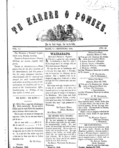 Te Karere o Poneke 1857-1858: Volume 1, Number 43. 06 September 1858 |