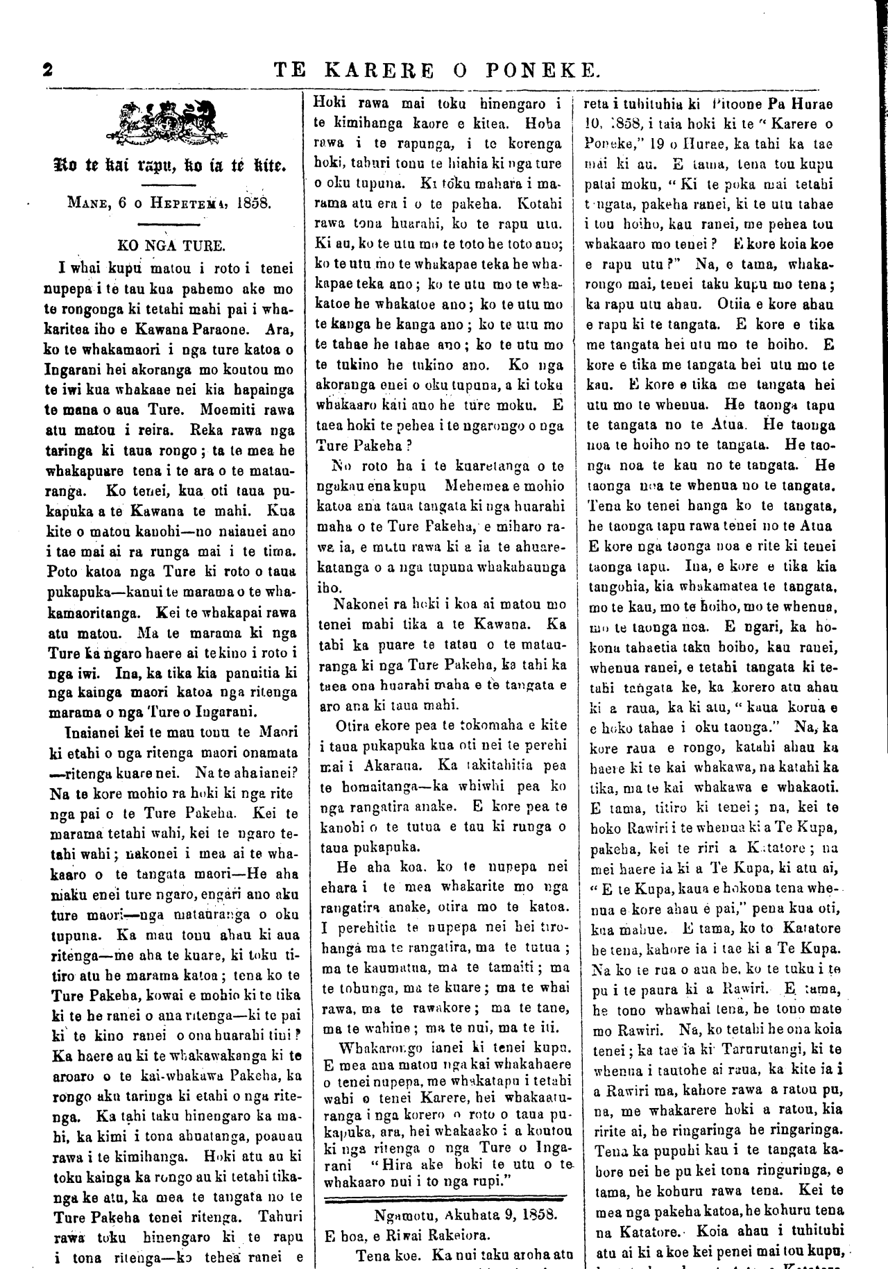 2 TE KARERE O PONEKE. Ko te kai rapu, ko ia te kite. MANE, 6 o HEPETEMA 1858. KO NGA TURE. I whai kupu matou i roto i tenei nupepa i te tau kua pahemo ake mo te rongonga ki tetahi mahi pai i wha- karitea iho e Kawana Paraone. Ara, ko te whakamaori i nga ture katoa o Ingarani hei akoranga mo koutou mo te iwi kua whakaae nei kia hapainga te mana o aua Ture. Moemiti rawa atu matou i reira. Reka rawa nga taringa ki taua rongo; ta te mea he whakapuare tena i te ara o te matau- ranga. Ko tenei, kua oti taua pu- kapuka a te Kawana te mahi. Kua kite o matou kanohi—no naianei ano i tae mai ai ra runga mai i te tima. Poto katoa nga Ture ki roto o taua pukapuka—kanui te marama o te wha- kamaoritanga. Kei te whakapai rawa atu matou. Ma te marama ki nga Ture ka ngaro haere ai te kino i roto i nga iwi. Ina, ka tika kia panuitia ki nga kainga maori katoa nga ritenga marama o nga Ture o Ingarani. Inaianei kei te mau tonu te Maori ki etahi o nga ritenga maori onamata —ritenga kuare nei. Na te anaianei? Na te kore mohio ra hoki ki nga rite nga pai o te Ture Pakeha. Kei te marama tetahi wahi, kei te ngaro te- tahi wahi; nakonei i mea ai te wha- kaaro o te tangata maori—He aha maku enei ture ngaro, engari ano aku ture maori-—nga matauranga o oku tupuna. Ka mau tonu ahau ki aua ritenga—me aha te kuare, ki toku ti- tiro atu he marama katoa; tena ko te Ture Pakeha, kowai e mohio ki te tika ki te he ranei o aua ritenga—ki te pai ki te kino ranei o ona huarahi tini? Ka haere au ki te whakawakanga ki te aroaro o te kai-whakawa Pakeha, ka rongo aku taringa ki etahi o nga rite- nga. Ka tahi taku hinengaro ka ma- hi, ka kimi i tona ahuatanga, poauau rawa i te kimihanga. Hoki atu au ki toku kainga ka rongo au ki tetahi tika- nga ke atu, ka mea te tangata no te Ture Pakeha tenei ritenga. Tahuri rawa tuku hinengaro ki te rapu i tona ritenga—ko tehea ranei e Hoki rawa mai toku hinengaro i te kimihanga kaore e kitea. Hoha rawa i te rapunga, i to korenga hoki, tahuri tonu te hiahia ki nga ture o oku tupuna. Ki toku mahara i ma- rama atu era i o te pakeha. Kotahi rawa tona huarahi, ko te rapu mu. Ki au, ko te utu rau te toto he toto ano; ko te utu mo te whakapae teka he wha- kapae teka ano; ko te utu mo te wha- katoe he whakatoe ano; ko te utu mo te kanga he kanga ano; ko te mu mo te tahae he tahae ano; ko te utu mo te tukino he tukino ano. Ko nga akoranga enei o oku tupuna, a ki toku whakaaro kati ano he ture moku. E taea hoki te pehea i te ngarongo o nga Ture Pakeha? No roto ha i te kuaretanga o te ngakau ena ku pu Mehemea e mohio katoa aua taua tangata ki nga huarahi maha o te Ture Pakeha, e miharo ra- wa ia, e mutu rawa ki a ia te ahuare- katanga o a nga tupuna whakahaunga iho. Nakonei ra hoki i koa ai matou mo tenei wahi tika a te Kawana. Ka tahi ka puare te tatau o te matau- ranga ki nga Ture Pakeha, ka tahi ka taea ona huarahi maha e te tangata e aro ana ki taua mahi. Otira ekore pea te tokomaha e kite i taua pukapuka kua oti nei te perehi mai i Akarana. Ka takitahitia pea te homaitanga—ka whiwhi pea ko nga rangatira anake. E kore pea te kanohi o te tutua e tau ki runga o taua pukapuka. He aha koa. ko te nupepa nei ehara i te mea whakarite mo nga rangatira anake, otira mo te katoa. I perehitia te nupepa nei hei tiro- hanga ma te rangatira , ma te tutua; roa te kaumatua, ma te tamaiti; ma te tohunga, ma te kuare; ma te whai rawa, ma te rawakore; ma te tane, ma te wahine; ma te nui, ma te iti. Whakarongo ianei ki tenei kupu. E mea aua matou nga kai whakahaere o tenei nupepa, me whakatapu i tetahi wahi o tenei Karere, hei whakaatu- ranga i nga korero o roto o taua pu- kapuka, ara, hei whakaako i a koutou ki nga ritenga o nga Ture o Inga- rani " Hira ake hoki te utu o te whakaaro nui i to nga rupi." Ngamotu, Akuhata 9, 1858. E hoa, e Riwai Rakeiora. Tena koe. Ka nui taku aroha atu reta i tuhituhia ki Pitoone Pa Hurae ! O, 1858, i taia hoki ki te " Karere o Poneke," 19 o Hurae, ka tahi ka tae mai ki au. E tama, tena tou kupu patai moku, " Ki te poka mai tetahi tangata, pakeha ranei, ki te utu tahae i tou hoiho, kau ranei, me pehea tou whakaaro mo tenei? E kure koia koe e rapu utu?" Na, e tama, whaka- rongo mai, tenei taku kupu mo tena; ka rapu utu ahau. Otiia e kore ahau e rapu ki te tangata. E kore e tika me tangata hei utu mo te hoiho. E kore e tika me tangata hei utu mo te kau. E kore e tika me tangata hei utu mo te whenua. He taonga tapu te tangata no te Atua. He taonga noa te hoiho no te tangata. He tao- nga noa te kau no te tangata. He taonga noa te whenua no te tangata. Tena ko tenei hanga ko te tangata, he taonga tapu rawa tenei no te Atua E kore nga taonga noa e rite ki tenei taonga tapu. Ina, e kore e tika kia tangohia, kia whakamatea te tangata. mo te kau, mo te hoiho, mo te whenua, mo te taonga noa. E ngari, ka ho- kona tahaetia taka hoiho, kau ranei, whenua ranei, e tetahi tangata ki te- tahi tangata ke, ka korero atu ahau ki a raua, ka ki atu, " kaua korua e e hoko tahae i oku taonga." Na, ka kure raua e rongo, katahi ahau ka haere ki te kai whakawa, na katahi ka tika, ma te kai whakawa e whakaoti. E tama, titiro ki tenei; na, kei te hoko Rawiri i te whenua ki a Te Kupa, pakeha, kei te riri a Katatore; na mei haere ia ki a Te Kupa, ki atu ai, " E te Kupa, kaua e hokona tena whe- nua e kore ahau e pai," pena kua oti, kua mahue. E tama, ko to Katatore he tena, kahore ia i tae ki a Te Kupa. Na ko te rua o aua he, ko te tuku i te pu i te paura ki a Rawiri. E. tama, he tono whawhai tena, he tono mate mo Rawiri. Na, ko tetahi he ona koia tenei; ka tae ia ki Tarurutangi, ki te whenua i tautohe ai raua, ka kite ia i a Rawiri ma, kahore rawa a ratou pu, na, me whakarere hoki a ratou, kia ririte ai, he ringaringa he ringaringa. Tena ka pupuhi kau i te tangata ka- hore nei he pu kei tona ringaringa, e tama, he kohuru rawa tena. Kei te mea nga pakeha katoa, he kohuru tena na Katatore. Koia ahau i tuhituhi atu ai ki a koe kei penei mai tou kupu,