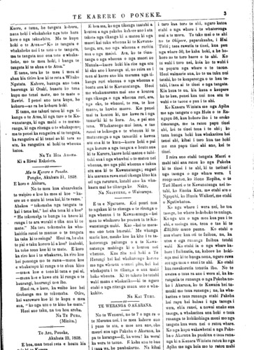 TE KARERE O PONEKE. 3 Kaore, e tama, he tangata kohuru, nana hoki i whakaheke nga toto hara kore o nga tokowhitu. Me te kupu hoki o te Atua—"Ko te tangata e whakaheke nei i te toto o te tangata, ma te tangata ano ona toto e whaka- heke, mo te mea hoki, i hanga te tangata ki te ahua o te Atua." E tama, tera ke te mea i mea ai ahau kia titiro koe ki te reta a Witako Ngatata. Kahore, haunga ano tona haerenga ki Otaki, huaatu ko tona kupu mo tenei mate, mo te mate o Rawiri. I penei ano tana kupa, he kohuru—ae ra he kohuru hoki. E tama, me tahuri tatou ki nga ti- kanga o te Atua, ki nga ture o te Ka- wanatanga, ki nga mahi o te matau- ranga, ki nga ritenga o ta whakapono; ma te penei ka rangatira ai te tangata, ka rangatira ai ki tenei ao ki tera ao atu, ka rangatira ai hoki te whenua katoa. Na TE HOA AROHA. Ki a Riwai Rakeiora. Mo te Karere o Poneke. Poneke, Akuhata 31, 1858. E koro e Ahitara, No te mea kua ahuarekatia te waipiro e koe ka mea ai koe " ka- ore au e mutu ki tena kai, ki te rama.' Ahakoa " tokomaha nga tangata te kai i tena kai," hei aha tena ki a koe? "He tokomaha te hunga ka haere ki runga i te ara warahi e tika ana ki te mate." Ma tera tokomaha ka wha- kanuia ranei te mamae o te tangata ka taka ki te reinga? Heoi ra, he uha te pai o taku korero ki a koe? inahoki, ka tohe tonu koe ki te mate. E koro ka riro koe i te whakarau, ka riro koe hei pononga mo te rama—mana koe e whakatupu ki runga o te ahua kino —mana koe e tono ki tana e pai ai, —maua koe e kawe atu ki runga o te haurangi, haurangi noa iho. Heoi ra, e koro, ka waiho koe hei arohanga ma te tokomaha. Otira, kei wareware koe ki te kupu e mea aua, " ko nga utu o te kino he mate." Heoi ano taku, na tou hoa aroha, NA TE PURA, (Minita.) Te Aro, Poneke, Akuhata 23, 1858. E hoa, mau tenei reta e hoatu kia E hoa ma, ku nga tikanga tuatahi a koutou a nga pakeha kahore ano i ata takoto nga tikanga ki a matou ki nga maori kai tuku whenua ki te Kawana- tanga, ara, mo nga whenua e ruritia ana u nga maori. Ara, ko te tima- tanga o nga whenua o nga maori ko Manaia—kaore hoki kia rite nga utu ki aku ano i karanga ai, no reira au i mea ai kaore ano kia marama nga ti- kanga ruri whenua o nga whenua e hoatu ana ki te Kawanatanga. Heoi me whakamarama mai ano e koutou nga tikanga o nga whenua ruri, ara, nga eka, te whanui, te roa, te koe maero, te hawhe maero. Kei penei mai ta koutou ki, me kawe ra i nga tamariki ki te kura. Ae, e pai aua tena. Whakarongo mai iaua, e tae ranei te hokonga o te whenua ki te matauranga o nga tamariki e kawea atu ana ki te kura—kaore hoki e pai nga korero a nga tangata e hoatu aua ki te Karere, kaore hoki matou e tuhi- tuhi ana i nga whawhai o to matou nei whenua, mo nga pihi whenua e tukua atu ana ki te Kawanatanga; engari kia marama rawa enei tikanga kino kia oti nga raruraru, kaiahi ano ka wha- kaatu mai he tikanga ke. Naku, Na NGATUERE, o Wairarapa. E ta e Ngatuere. Kei pouri noa to ngakau ki te ritenga o te rironga o nga whenua i te Kawanatanga—kei mea to whakaaro he poaunu ta te Ka- wanatanga mahi. Kao —kei te mara- ma ano tona huarahi. Me whanga mane koe, meake koe ka kite i te ta- kotoranga pananga o a te Kawa- natanga mahinga ki o koutou nei whenua. Kua rite nei hoki a Te Herangi hei kai whakarongo korero mo nga whenua o tenei pito, hei kai whakaputa i te tikanga o aua mahi hoko whenua. Ki te takoto he tetahi wahi mana e whakatika—ki te ngaro etahi o nga ritenga mana ano e wha- kakite. Na KAI TUHI. TE WERANGA O AKARANA. No te Wenerei, no te 7 o nga ra o te Marama nei. i te mea kahore ano i puao te ata, e moe ana ano, oho mauri aua nga Pakeha o Akarana, ka pate karanga—E, ka wera! ka wera! ka wera te taone, E kaha ana te hau i taua wa. he pawhakarua. Na kihai i taro kua toru te ahi, ngaro katoa etahi o nga whare i te whateronga mai a te mura. Te take mai o te ahi no te Ohipere, paparakauhe, i Hai Tiriti; taea rawatia te tinei, kua pau nga whare 50, he kaha hoki, a he ho- horo no te toro haere o te ahi. Ko te wahi i toro nei, koia ko te wahi i tu puputu nga whare o te taone. Heoi waimarie aua, ko te ua tuku nui tetahi, ko te kauparenga o te hau te- tahi, i taua ai te tinei e nga tangata. Kia kaua te ua, kia kaua e kaupare ke te hau, penei kua nui noa atu te wahi o te tuone e pau i te ahi. Ku Kanara Winiata me nga Apiha me nga tangata o nga Huia o te Ra- ngapu 58, kua hohoru iho i te oroko timatanga, me ta ratou papu tinei ahi, kei te tinei tena i te ahi; ko taua hunga hoki kua whakaritea hei tenei ahi, kihai i taro kua tae hoki me ana papu tinei ahi ano, kei te tinei. I reira ano etahi tangata Maori e mahi tahi ana ratou ko nga Pakeha ki te tinei i te ahi, ki te taritari i nga taonga o ngo whare wera. I rongo matou, ko Hone Ropiha, o to Tari Maori o te Kawanatanga nei te- tahi, ko Enoka Kau, me etahi atu o Ngapuhi, ko Hunia Waikeri me etahi o Ngatiwhatua. Ko nga whare i wera nei, he toa taonga, he wharo hokohoko te nuinga. Ko nga utu o nga mea kua pau i te uhi, e meinga ana, tena e tae ki te £25, 000 mano pauna. Ko etahi o aua whare kua oti te Inihua, na, ka utua e nga runanga Inihua tetahi wahi Ko etahi ia o nga whare ka- i hore i Inihuatia, na, kahore he hoki- nga mai ki te hunga nona, ngaro rawa atu nga mea o enei i te ahi. Ko etahi kua rawakoretia tonutia iho. No te i awatea o taua ra ano i wera ai, ka ka- rangatia te runanga o nga Pakeha no- ho i Akarana, ko te Kawana hei tu- muaki mo taua runanga; na, ka wha- karitea e taua runanga etahi Pakeha hei rapu hei hahau i nga taonga i wera, ehia ranei, a nowai anake aua taonga, a whakaritea ana hoki e taua runanga te kohikohinga moni mo nga tangata kua wera nei o ratou whare. Ko nga kupu wakawhetai a nga Pake- ha u Akarana ka puakina e taua runa- nga ki a Kanara Winiata ratou ko nga Apiha me nga hoia mo to ratou mahi