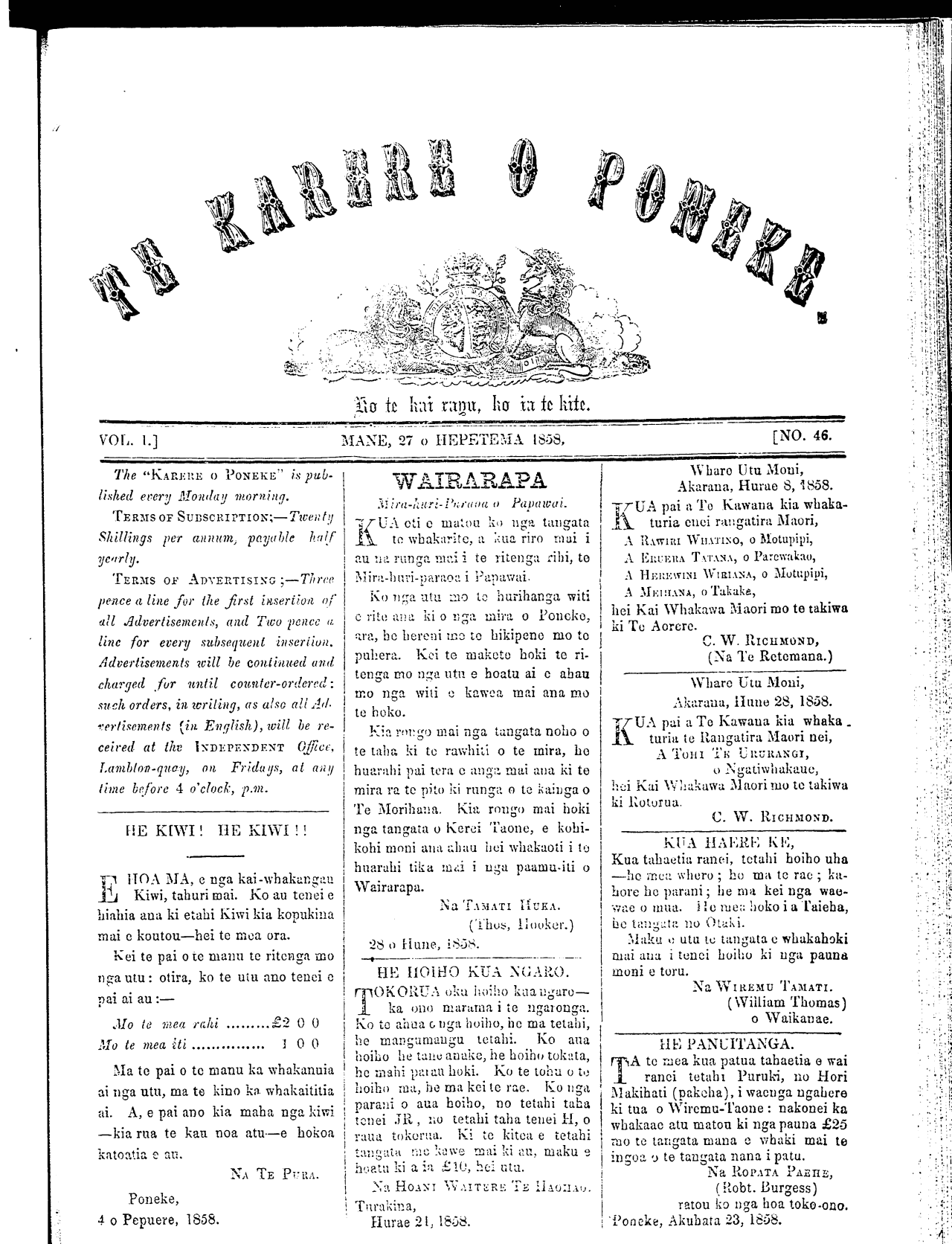 TE KARERE O PONEKE Ko te kai rapu, ko ia te kite. [VOL I, MANE, 27 o HEPETEMA 1858, NO. 46] The "KARERE O PONEKE" is pub- lished every Thursday morning. TERMS OF SUBSCRIPTION;- Twenty Shillings per annum, payable half- yearly. TERMS OF ADVERTISING;- Three pence a line for the first insertion of all advertisements, and Two pence a line for every subsequent insertion. Advertisments wil be continued and charged for until counter-ordered: such orders in writing, as also all Ad- vertisements (in English) will be re- ceived at the INDEPENDENT Office, Lambton-quay, on Tuesdays, at any time before 4 o'clock, p.m. HE KIWI! HE KIWI! EHOA MA, e nga kaiwhakangau Kiwi, tahuri mai. Ko au tenei hiahia ana ki etahi Kiwi kia hopukia mai e koutou—hei te mea ora. Kei te pai o te manu te ritenga mo nga utu: otira, ko te utu ano tenei pai ai au:— Mo te mea rahi ......... £200 Mo te mea iti ............ 100 Ma te pai o te manu ka whakanuia ai nga utu, ma te kino ka whakaititia ai. A, e pai ano kia maha nga kiwi —kia rua te kau noa atu—e hokoa katoatia e au. NA TE PURA. Poneke, 4 o Pepuere, 1858. WAIRARAPA Mira-huri-paraoa o Papawai. Kua oti e matou ko nga tangata te whakarite, a kua riro mai i au na runga mai i te ritenga rihi, te Mira-huri-paraoa i Papawai. Ko nga utu mo te hurihanga witi e rite ana ki o nga mira o Poneke, ara, he hereni me te hikipene mo te puhera. Kei te makete hoki te ri- tenga mo nga utu e hoatu ai e ahaua mo nga utu witi o kawea mai aua mo te hoko. Kia rongo mai nga tangata noho o te taha ki te rawhiti o te mira, he huarahi pai tera o anga: mai ana ki to mira ra te pito ki runga o te kainga o Te Merihana. Kia rongo mai hoki nga tangata o Kerei Taone, e kohi- kohi moni ana ahau hei whakaoti i te huarahi tika mai i nga paamu-iti o Wairarapa. Na TAMATI HUKA. (Thos, Hooker.) 28 o Hune, 1858 HE HOIHO KUA NGARO Tokorua oku hoiho kua ngaro- ka ono marama i te ngaronga. Ko te ahua e nga hoiho, he ma tetahi, he mangumangu tetahi. Ko aua hoiho he tane anake, he hoiho tokata, he mahi parau hoki. Ko te tohu o te hoiho, ma, he ma kei te rae. Ko nga parani o aua hoiho, no tetahi taha tenei JR, no tetahi tahi tenei H, o raua tokorua. Ki te kitea e tetahi tangata me kawe mai ki au, maku hoatu ki a ia 10 pounds, hei utu. NA HOANI WAITERE TE HAOHAO. Turakina, Hurae 21, 1858. Whare Utu Moni, Akarana, Hurae 8, 1858. KUA pai a Te Kawana kia whaka- turia enei rangatira Maori, A RAWIRI WHATINO, o Motupipi, A ERUERA TATANA, o Parewakao, A HEREWINI WIRIANA, o Motupipi, A MEIHANA o Takaka, hei Kai Whakawa Maori mo te takiwa ki Te Aorere. C.W.RICHMOND (Na Te Retemana.) Whare Utu Moni, Akarana, Hune 28, 1858. Kua pai a Te Kawana kia whaka- turia te Rangatira Maori nei, A TOHI TE URURANGI, o Ngatiwhakaue, hei Kai Whakawa Maori mo te takiwa ki Rotorua. C.W.RICHMOND KUA HAERE KE, Kua tahaetia ranei, tetahi hoiho uha —he mea whero; he ma te rae; ka- hore he parani; he ma kei nga. wae- wae o mua. He mea hoko i a Taieha, he tangata no Otaki. Maku e utu te tangata e whakahoki mai ana i tenei hoiho ki nga pauna moni e toru. Na WIREMU TAMATI. (William Thomas) o Waikanae. HE PANUITANGA. TA te mea kua patua tahaetia e wai ranei tetahi Puruki, no Hori Makihati (pakeha), i waenga ngahere ki tua o Wiremu-Taone: nakonei ka whakaae atu matou ki nga pauna £25 mo te tangata mana e whaki mai te ingoa o te tangata nana i patu Na ROPATA PARAHE, (Robert Burgess) ratou ko nga hoa toko-ono. Poneke, Akuhata 23, 1858.