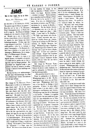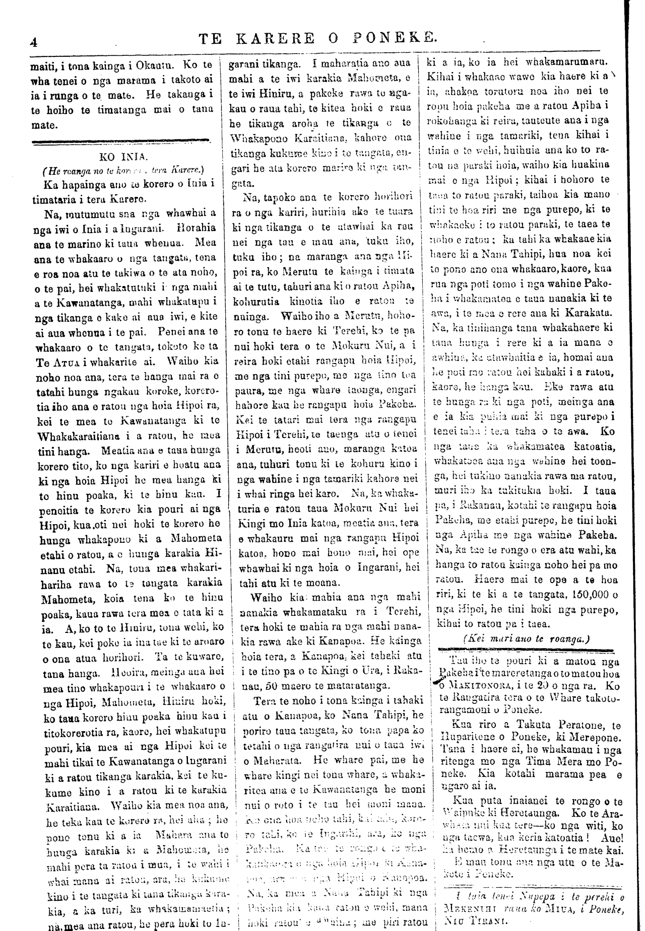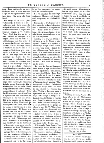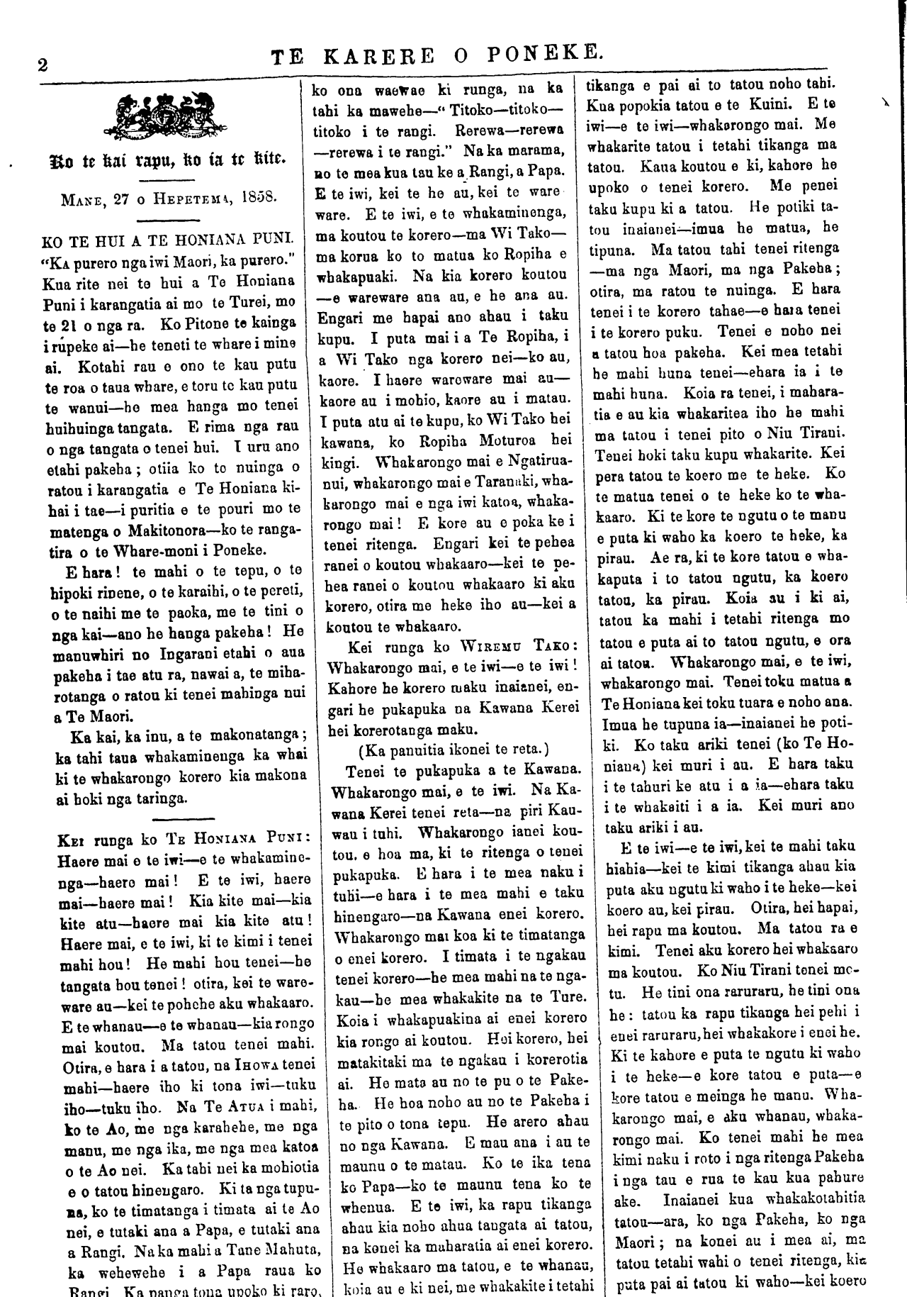 2 TE KARERE O PONEKE. Ko te kai rapu, ko ia te kite. MANE, 27 o HEPETEMA, 1858. KO TE HUI A TE HONIANA PUNI. "KA purero nga iwi Maori, ka purero." Kua rite nei to hui a To Honiana Puni i karangatia ai mo te Turei, mo te 21 o nga ra. Ko Pitone te kainga i rupeke ai—he teneti te whare i mine ai. Kotahi rau e ono te kau putu te roa o taua whare, e toru te kau putu te wanui—ho mea hanga mo tenei huihuinga tangata. E rima nga rau o nga tangata o tenei hui. I uru ano etahi pakeha; otiia ko to nuinga o ratou i karangatia e Te Honiana ki- hai i tae—i puritia e te pouri mo te matenga o Makitonora—ko te ranga- tira o te Whare-moni i Poneke. E hara! te mahi o te tepu, o te hipoki rinene, o te karaihi, o te pereti, o te naihi me te paoka, me te tini o nga kai—ano he hanga pakeha! He manuwhiri no Ingarani etahi o aua pakeha i tae atu ra, nawai a, te miha- rotanga o ratou ki tenei mahinga nui a Te Maori. Ka kai, ka inu, a te makonatanga; ka tahi taua whakaminenga ka whai ki te whakarongo korero kia makona ai hoki nga taringa. KEI runga ko TE HONIANA PUNI: Haere mai e te iwi—e te whakamine- nga—haere mai! E te iwi, haere mai—haere mai! Kia kite mai—kia kite atu—haere mai kia kite atu! Haere mai, e te iwi, ki te kimi i tenei mahi hou! He mahi hou tenei—he tangata hou tenei! otira, kei te ware- ware au—kei te pohehe aku whakaaro. E te whanau—e te whanau—kia rongo mai koutou. Ma tatou tenei mahi. Otira, e hara i a tatou, na IHOWA tenei mahi—haere iho ki tona iwi—tuku iho—tuku iho. Na Te ATUA i mahi, ko te Ao, me nga karahehe, ma nga manu, me nga ika, me nga mea katoa o te Ao nei. Ka tahi nei ka mohiotia e o tatou hinengaro. Ki ta nga tupu- na, ko te timatanga i timata ai te Ao nei, e tutaki ana a Papa, e tutaki ana a Rangi. Naka mahi a Tane Mahuta, ka wehewehe i a Papa raua ko Rangi Ka panga tona upoko ki raro, ko ona waewae ki runga, na ka tahi ka mawehe—" Titoko—titoko— titoko i te rangi. Rerewa—rerewa —rerewa i te rangi." Na ka marama, no te mea kua tau ke a Rangi, a Papa. E te iwi, kei te he au, kei te ware ware. E te iwi, e te whakaminenga, ma koutou te korero—ma Wi Tako— ma korua ko to matua ko Ropihae e whakapuaki. Na kia korero koutou —e wareware ana au, e he ana au. Engari me hapai ano ahau i taku kupu. I puta mai i a Te Ropiha, i a Wi Tako nga korero nei—ko au, kaore. I haere wareware mai au— kaore au i mohio, kaore au i matau. I puta atu ai te kupu, ko Wi Tako hei kawana, ko Ropiha Moturoa hei kingi. Whakarongo mai e Ngatirua- nui, whakarongo mai e Taranaki, wha- karongo mai e nga iwi katoa, whaka- rongo mai! E kore au e poka ke i tenei ritenga. Engari kei te pehea ranei o koutou whakaaro—kei te pe- hea ranei o koutou whakaaro ki aku korero, otira me heke iho au—kei a koutou te whakaaro. Kei runga ko WIREMU TAKO: Whakarongo mai, e te iwi—e te iwi! Kahore he korero maku inaianei, en- gari he pukapuka na Kawana Kerei hei korerotanga maku. (Ka panuitia ikonei te reta.) Tenei te pukapuka a te Kawana. Whakarongo mai, e te iwi. Na Ka- wana Kerei tenei reta—na piri Kau- wau i tuhi. Whakarongo ianei kou- tou. e hoa ma, ki te ritenga o tenei pukapuka. E hara i te mea naku i tahi—e hara i te mea mahi e taku hinengaro—na Kawana enei korero. Whakarongo mai koa ki te timatanga o enei korero. I timata i te ngakau tenei korero—he mea mahi na te nga- kau—he mea whakakite na te Ture. Koia i whakapuakina ai enei korero kia rongo ai koutou. Hoi korero, hei matakitaki ma te ngakau i korerotia ai. He mata au no te pu o te Pake- ha. He hoa noho au no te Pakeha i te pito o tona tepu. He arero ahau no nga Kawana. E mau aua i au te maunu o te matau. Ko te ika tena ko Papa—ko te maunu tena ko te whenua. E te iwi, ka rapu tikanga ahau kia noho ahua tangata ai tatou, na konei ka maharatia ai enei korero. He whakaaro ma tatou, e te whanau, koia au e ki nei, me whakakite i tetahi tikanga e pai ai to tatou noho tahi. Kua popokia tatou e te Kuini. E te iwi—e te iwi—whakarongo mai. Me whakarite tatou i tetahi tikanga ma tatou. Kaua koutou e ki, kahore he upoko o tenei korero. Me penei taku kupu ki a tatou. He potiki ta- tou inaianei—imua he matua, he tipuna. Ma tatou tahi tenei ritenga —ma nga Maori, ma nga Pakeha; otira, ma ratou te nuinga. E hara tenei i te korero tahae—e hara tenei i te korero puku. Tenei e noho nei a tatou hoa pakeha. Kei mea tetahi he mahi huna tenei—ehara ia i te mahi huna. Koia ra tenei, i mahara- tia e au kia whakaritea iho ha mahi. ma tatou i tenei pito o Niu Tirani. Tenei hoki taku kupu whakarite. Kei pera tatou to koero me te heke. Ko to matua tenei o te heke ko te wha- kaaro. Ki te kore te ngutu o te manu e puta ki waho ka koero te heke, ka pirau. Ae ra, ki te kore tatou e wha- kaputa i to tatou ngutu, ka koero tatou, ka pirau. Koia au i ki ai, tatou ka mahi i tetahi ritenga mo tatou e puta ai to tatou ngutu, e ora ai tatou. Whakarongo mai, e te iwi, whakarongo mai. Tenei toku matua a Te Honiana kei toku tuara e noho ana. I mua he tupuna ia—inaianei he poti- ki. Ko taku ariki tenei (ko Te Ho- niana) kei muri i au. E hara taku i te tahuri ke atu i a ia—ehara taku i te whakaiti i a ia. Kei muri ano taku ariki i au. E te iwi—e te iwi, kei te mahi taku hiahia—kei te kimi tikanga ahau kia puta aku ngutu ki waho i te heke—kei koero au, kei pirau. Otira, hei hapai, hei rapu ma koutou. Ma tatou ra e kimi. Tenei aku korero hei whakaaro ma koutou. Ko Niu Tirani tenei mo- tu. He tini ona raruraru, he tini ona he: tatou ka rapu tikanga hei pehi i enei raruraru, hei whakakore i enei he. Ki te kahore e puta te ngutu ki waho i te heke—e kore tatou e puta—e kore tatou e meinga he manu. Wha- karongo mai, e aku whanau, whaka- rongo mai. Ko tenei mahi he mea kimi naku i roto i nga ritenga Pakeha i nga tau e rua te kau kua pahure ake. Inaianei kua whakakotahitia tatou—ara, ko nga Pakeha, ko nga Maori; na konei au i mea ai, ma tatou tetahi wahi o tenei ritenga, kia puta pai ai tatou ki waho—kei koero