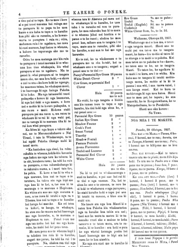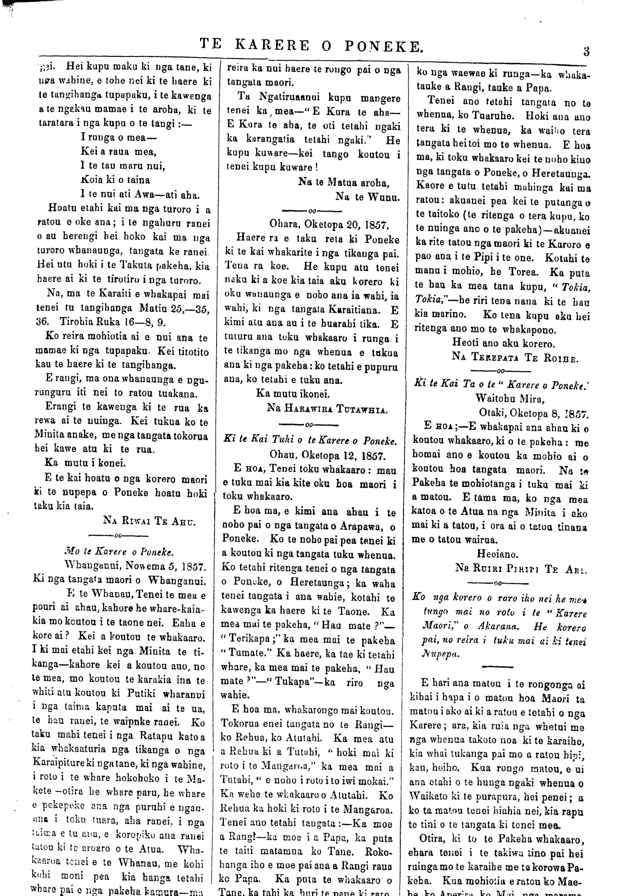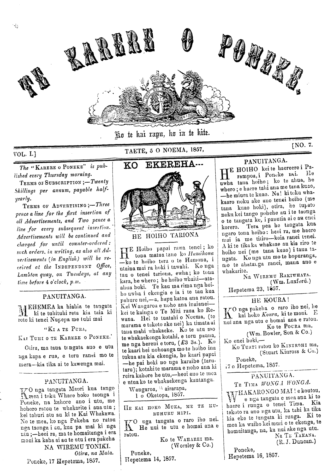 TE KARERE O PONEKE. Ko te kai rapu, ko ia te kite Vol 1.] TAETE, 5 O NOEMA, 1857, [NO.7. The "KARERE o PONEKE" is pub- lished every Thursday morning. TERMS OF SUBSCRIPTION; Twenty Shillings per annum, payable half- yearly. TERMS OF ADVERTISING; Three pence a line for the first insertion of all Advertisements, and Two pence a line for every subsequent insertion. Advertisements will be continued and charged for until counter-orderd: such orders, in writing, as also all Ad- vertisements ( in English ) will be re- ceived at the INDEPENDENT office, Lambton quay, on Tuesdays, at any time before 4 o'clock, p.m. PANUITANGA. MEHEMEA ka hiahia te tangata ki te tuhituhi reta kia taia ki roto ki tenei Nupepa me tuhi mai "KI A TE PURA, KAI TUHI O TE KARERE O PONEKE.' Otira, ma taua tangata ano e utu nga kapa e rua, e toru ranei mo te mera—kia tika ai te kawenga mai. PANUITANGA. Ko nga tangata Maori kua tango mea i toku Whare hoko taonga i Poneke, na kahore ano i utu, me hohoro ratou te whakarite i aua utu; kei tahuri atu au ki te Kai Whakawa. No te mea, ko nga Pakeha no ratou nga taonga i au, kua pa mai ki nga utu;—heoi ra, ma te homaitanga i era moni ka kaha ai au te utu i era pakeha NA WIREMU TONIKI. Otira, na Mata. Poneke, 17 Hepetema, 1857. KO EKEREHA HE HOIHO TARIONA HE Hoiho papai rawa tenei; ko tona matua tane ko Hamihona —ko te hoiho tera o te Hamona, i utaina mai ra hoki i tawahi. Ko nga tau o tenei tariona, ewha; ko tona kara, he whero; he hoiho whaiti—ata- ahua hoki. Te kau ma rima nga hoi- ho uwha i ekengia e ia i te tau kua pahure nei,—a, hapu katoa ana ratou. Kei Wangaroa e noho ana inaianei— kei te kainga o Te Miti raua ko Re- wana. Hei te tuatahi o Noema, (to marama e takoto ake nei) ka timata ai tana mahi whakaeke. Ko te utu mo te whakaekenga kotahi, e toru pauna, me nga hereni e toru, (Ł3 3s.). Ko te kaari hei nohoanga mo te hoiho ina tukua atu kia ekengia, he kaari papai —he pai hoki no nga karaihe (taru- taru); kotahi te marama e noho ana ki reira kahore he utu,—heoi ano te mea e utua ko te whakaekenga kautanga. Wangaroa, Wairarapa, 1 o Oketopa, 1857. HE KAI HOKO MUKA, ME TE HU- RUHURU HIPI. KO nga tangata o raro iho nei. He nui te utu e homai ana e ratou. Ko te WAHAREI ma. (Worsley & Co.) Poneke, Hepetema 14, 1857. PANUITANGA. HE HOIHO kei te haereere i Pa- ramapoa, i Poneke nei. He uwha taua hoiho; ko te ahua, he whero; e haere tahi ana me tana kuao, —he miura te kuao. Na! ki toku wha- kaaro noku ake ano tenei hoiho (me tana kuao hoki), otira, he tupato noku kei tango pohehe au i te taonga o te tangata ke, i panutia ai e au enei korero. Tera pea he tangata kua ngaro tona hoiho: heoi ra, me haere mai ia me titiro—koia ranei tenei. A ki te tika ka whakaae au kia riro te hoiho nei (me tana kuao) i taua ta- ngata. Ko nga utu mo te hopuranga, mo te ahatanga ranei, mana ano e whakarite. Na WIREMU RAKIWHATA. (Wm. Luxford.) Hepetema 23, 1857. HE KOURA! KO nga pakeha o raro iho nei, he kai hoko Koura, ki te moni. E nui ana nga utu e homai ana e ratou. Ko te POURA ma, (Wm. Bowler, Son & Co.) Ko enei hoki,— Ko TUATI ratou ko KINIROHI ma, (Stuart Kinross & Co.) Poneke, 17 o Hepetema, 1857. PANUITANGA. TE TIMA WONG WONGA. WHAKARONGO MAI! e koutou, e nga tangata e mea aua ki te haere i runga o tenei Tima. Kia takoto ra ano nga utu, ka tahi ka tika kia eke te tangata ki runga. Ki te mea ka waiho kei muri o te ekenga, te homaitanga, na, ka nui ake nga utu. Na TE TAKANA. (R. J. Duncan.) Poneke, Hepetema 16, 1857.