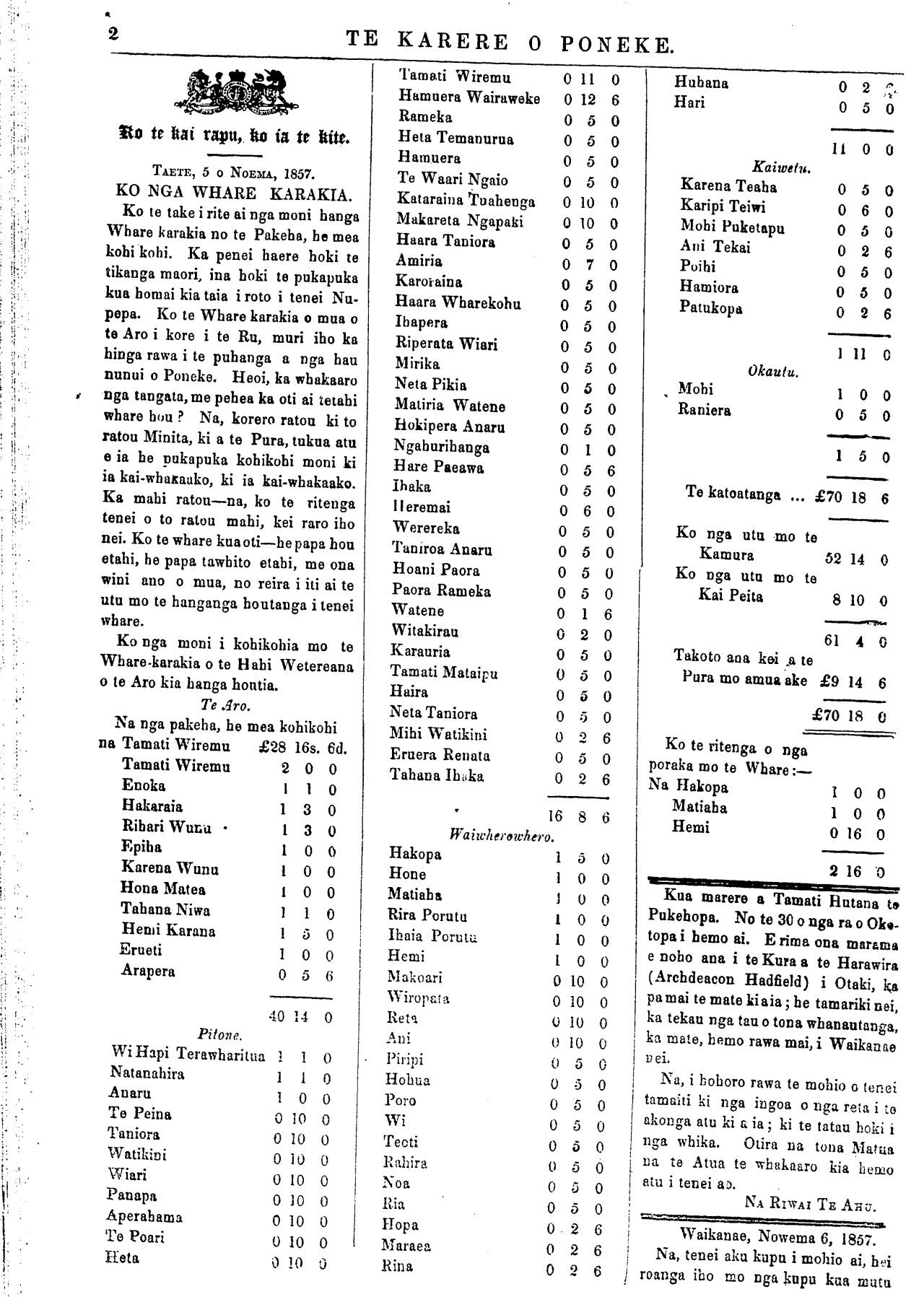 TE KARERE O PONEKE. Ko te kai rapu, ko ta te kite. TAETE, 5 o NOEMA, 1857. KO NGA WHARE KARAKIA. Ko te take i rite ai nga moni hanga Whare karakia no te Pakeha, he mea kohikohi. Ka penei haere hoki te tikanga maori ina hoki te pukapuka kua homai kia taia i roto i tenei Nu- pepa. Ko te Whare karakia o mua o te Aro i kore i te Ru, muri iho ka hinga rawa i te puhanga a nga hau nunui o Poneke. Heoi, ka whakaaro nga tangata, me pehea ka oti ai tetahi whare hou? Na, korero ratou ki to ratou Minita, ki a te Pura, tukua atu e ia he pukapuka kohikohi moni ki ia kaiwhakaako, ki ia kaiwhakaako. Ka mahi ratou—na, ko te ritenga tenei o to ratou mahi, kei raro iho nei. Ko te whare kua oti—hepapa hou etahi, he papa tawhito etahi, me ona wini ano o mua, no reira i iti ai te utu mo te hanganga houtanga i tenei whare. Ko nga moni i kohikohia mo te Whare-karakia o te Hahi Wetereana o te Aro kia hanga houtia. Te Aro. Na nga pakeha, he mea kohikohi na Tamati Wiremu £28 168. 6d Tamati Wiremu 200 Enoka 1 1 O Hakaraia 1 3 0 Rihari Wunu 130 Epiha I O O Karena Wunu I O O Hona Matea I O O Tahana Niwa I 1 0 Hemi Karana I 5 0 Erueti I O O Arapera 0 5 6 40 14 0 Pitone. Wi Hapi Terawharitua 1 1 0 Natanahira I I O Auaru I O O Te Peina O IO O Taniora O IO O Watikini O 10 O Wiari O 10 O Panapa O te O Aperehama O 10 O Te Poari O 10 O Heta O! O O Tamati Wiremu 011 O Hamuera Wairaweke O 12 6 Rameka 050 Heta Temanurua 050 Hamuera 050 Te Waari Ngaio 050 Kataraina Tuahenga 0100 Makareta Ngapaki O te O Haara Taniora 050 Amiria 070 Karoiaina a 050 Haara Wharekohu 050 Ihapera 050 Riperata Wiari 050 Mirika 050 Neta Pikia 050 Matiria Watene 050 Hohipera Anaru 050 Ngahurihanga 010 Hare Paeawa 056 Ihaka 050 Heremai 060 Werereka 050 Taniroa Anaru 050 Hoani Paora 050 Paora Rameka 050 Watene O 1 6 Witakirau 020 Karauria 050 Tamati Mataipu 050 Haira 050 Neta Taniora 0 5 0 Mihi Watikini 026 Eruera Renata 050 Tahana Ihaka 026 16 8 6 Waiwherowhero. Hakopa 150 Hone 1 O O Matiaha 1 O O Rira Porutu 1 O O Ihaia Porutu 1 O O Hemi I O O Makoari O 10 O Wiropata O IO O Reta O IO O Ani O 10 O Piripi 050 Hohua 050 Poro 050 Wi 050 Teoti 050 Rahira 050 Noa 050 Ria 050 Hopa 026 Maraea 026 Rina 026 Huhana O 2 6 Hari 050 11 O O Kaiwetu. Karena Teaha 050 Karipi Teiwi 060 Mohi Puketapu 050 Ani Tekai 026 Puihi 050 Hamiora 0 5 0 Patukopa 026 1 11 O Okautu . Mohi 1 O O Raniera 050 1 5 O Te katoatanga ... £70 18 6 Ko nga utu mo te Kamura 52 14 O Ko nga utu mo te Kaipeita 8 10 O 61 4 O Takoto ana kei a te Pura mo amua ake £9 14 6 £70 18 0 Ko te ritenga o nga poraka mo te Whare:— Na Hakopa I o O Matiaha 100 Hemi O 16 O 2 16 O Kua marere a Tamati Hutana te Pukehopa. No te 30 o nga ra o Oke- topa i hemo ai. E rima ona marama e noho ana i te Kura a te Harawira (Archdeacon Hadfield ) i Otaki, ka pa mai te mate ki a ia; he tamariki nei, ka tekau nga tau o tona whanautanga, ka mate, hemo rawa mai, Waikanae nei. Na, i hohoro rawa te mohio o tenei tamaiti ki nga ingoa o nga reta i to akonga atu ki a ia; ki te tatau hoki i nga whika. Otira ua tona Matua ua te Atua te whakaaro kia hemo atu i tenei ao. NA RIWAI TE AHU. Waikanae, Nowema 6, 1857. Na, tenei aku kupu i mohio ai, hei roanga iho mo nga kupu kua mutu