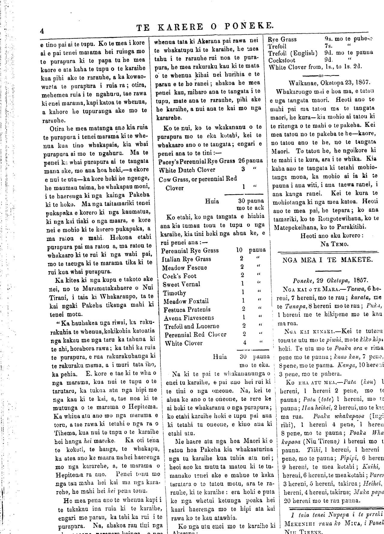 4 TE KARERE O PONEKE. e tino pai ai te tupu. Ko te mea i kore ai e pai tenei marama hei ruinga mo te purapura ki te papa tu he mea kaore e aia kaha te tupu o te karaihe kua pihi ake te rarauhe, a ka kowao- waata te purapura i mia ra; otira,, mehemea ruia i te ngahuru, tae rawa ki enei marama, kapi katoa te whenua, a kahore he tupuranga ake mo te rarauhe. Otira he mea matanga ano kia ruia te purapura i tenei marama ki te whe- nua kua tino whakapaia, kia whai purapura ai mo te ngahuru. Ma te penei ka whai purapura ai te tangata mana ake, mo ana hoa hoki,—a ekore e nui te utu—ka kore hoki he ngenge, he maumau taima, he whakapau moni, i te haerenga ki nga kainga Pakeha ki te hoko. Ma nga taitamariki tenei pukapuka e korero ki nga kaumatua, ki nga kai tiaki o nga maara, e kore nei e mohio ki te korero pukapuka, a ma ratou e mahi. Hokona etahi purapura pai ma ratou a, ma ratou te whakaaro ki te rui ki nga wahi pai, mo te taenga ki te marama tika ki te rui kua whai purapura. Ka kitea ki nga kupu e takoto ake nei, no te Maramatakahaere o Nui Tirani, i taia ki Whakaraupo, ta te kai ngaki Pakeha tikanga mahi ki tenei motu. " Ka hauhakea nga riwai, ka raku- rakunga te whenua, kohikohia katoatia nga kakau me nga taru ka tahuna ki te ahi, horahora rawa; ka tahi ka mia te purapura, e rua rakurakuhanga ki te rakuraku mama, a i muri tata iho, ka pehia. E. kore e tae ki te wha o nga marama, kua nui te tupu o te tarutaru, ka tukua atu nga hipi me nga kau ki te kai, a, tae noa ki te mutunga o te marama o Hepitema. Ka whiua atu ano mo nga marama e toru, a tae rawa ki tetahi o nga ra o Tihema, kua nui te tupu o te karaihe hoi hanga hei maroke. Ka oti tena te koko; i, te hanga, te whakapu, ka atea ano ke maara nahei haerenga mo nga kararehe, a, to marama o Hepitema ra ano. Penei tonu mo nga tau maha hei kai ma nga kara- rehe, he mahi hei hei pena tonu. He mea pena ano te whenua kapi i te takakau ina ruia ki to karaihe, engari me parau, ka tahi ka rui i te purapura. Na, ahakoa rau tini nga whenua tata ki Akarana pai rawa nei te whakatupu ki te karaihe, he mea tahu i te rarauhe rui noa te pura- pura, he mea rakuraku kau ki te mata o te whenua kihai nei hurihia e te parau e te ho ranei; ahakoa he mea penei kau, miharo ana te tangata i te tupu, mate ana te rarauhe, pihi ake he karaihe, a nui aua te kai mo nga kararehe. Ko te nui, ko te whakananu o te purapura mo te eka kotahi, kei te whakaaro ano o te tangata; engari e penei ana to te tini:— Pacey's Perennial Rye Grass 26 pauna White Dutch Clover 3 " Cow Grass, or perennial Red. Clover 1 " Huia 30 pauna mo te eka Ko etahi, ko nga tangata e hiahia aua kia tumau tonu te tupu o nga karaihe, kia tini hoki nga ahua ke, e rui penei ana: Perennial Rye Grass 10 pauna Italian Rye Grass 2 " Meadow Fescue 2 " Coek's Foot 2 Sweet Vernal 1 " Timothy 1 Meadow Foxtail 1 " Festuca Pratenis 2 " Avenu Flavescens 1 " Trefoil and Lucerne 2 " Perennial Red Clover 2 " White Clover 4 Huia 30 pauna mo te eka. Na ki te pai te whakananunga o enei tu karaihe, e piu ano hei rui ki te tini o nga oneone. Na, kei te ahua ke ano o te oneone, te rere ke ai hoki te whakaranu o nga purapura; ko etahi karaihe huki e tupu pai ana ki tetahi tu oneone, e kino ana ki etahi atu. Me haere atu nga hoa Maori ki o ratou hoa Pakeha kia whakaaturina nga tu karaihe kua tuhia atu nei; heoi ano ka mutu ta matou ki te tu- manako tenei ake e mahue te kaka taratara o to tatou motu, ara te ra- rauhe, ki te karaihe: era hoki e puta ke nga whetui ketunga poaka hei kaari haerenga mo te hipi ata kai rawa ko te kau atawhia. Ko nga utu enei mo te karaihe ki Akarana. Rye Grass 9s. mo te puhera Trefoil 7s. Trefoil (English) 9 d. mo te pauna Cocksloot 9d, " White Clover from , 1s, to 1s. 2d. Waikanae, Oketopa 23, 1807. Whakarongo mai e hoa ma, e tatou e nga tangata maori. Heoti ano te mahi pai ma tatou ma te tangata maori, he kura—kia mohio ai tatou ki te ritenga o te mahi o te pakeha. Kei mea tatou no te pakeha te he—kaore, no tatou ano te he, no te tangata Maori To tatou he, he ngoikore hi te mahi i te kura, ara i te whika. Kia kaha ano te tangata ki tetahi mohio- tanga mona, ka mohio ai ia ki to pauna i ana witi, i ana taewa ranei, i ana kanga ranei. Kei te kura te mohiotanga ki nga mea katoa. Heoti ano te mea pai, he tepara; ko ana tamariki, ko te Rongotewihana, ko te Matepekeihana, ko to Parakitihi. Heoti ano aku korero: Na TEMO. NGA MEA I TE MAKETE. Poneke, 29 Oketopa, 1857. NGA KAI o TE MARA.—Taewa, 6 he- reni, 7 hereni, mo te rau; karata, me te Tanapa, 8 hereni mo te rau; Puka, 1 hereni mo te hikipene mu te kau ma rua. NGA KAI KINAKI.—Kei te tuturu tonu te utu mo te piwhi, mote kiko hipi hoki. Te utu mo te Poaka ora e rima pene mo te pauna; kuao kati; 7 pene, 8 pene, mo te pauna. Kanga, 10 hereni 3 pene, mo te puhera. Ko ERA ATU MEA,—Pata (hou) I hereni, 1 hereni 2 pene, mo te pauna; Pata (tote) 1 hereni, mo te pauna; Hua heihei, 2 hereni, mo te kai ma rua. Poaka whakapaoa (Ingi- rihi), 1 hereni 4 pene, I hereni 8 pene, mo te pauna; Poaka Wha kapaoa (Niu Tirene) 1 hereni mo te pauna. Tuhi, 1 hereni, 1 hereni pene, mo te pauna; Pipipi, 6 hereni 9 hereni, te mea kotahi; Kuihi, hereni,, 6 hereni, te mea kotahi; Parera 3 hereni, 5 hereni, takirua; Heihei, hereni, 4 hereni, takirua; Muka papu 20 hereni mo te rau pauna. I taia tenei Nupepa i te perehi MEKENIHI raua ko MIUA, i Poneke NIU TIRENE-