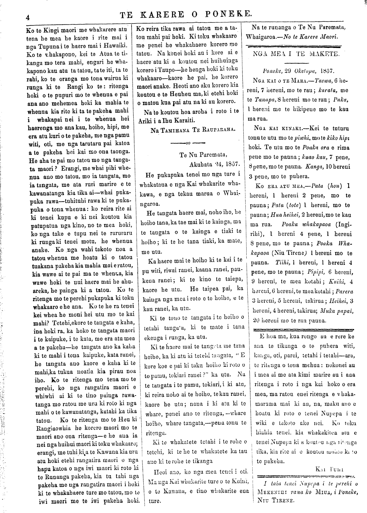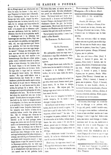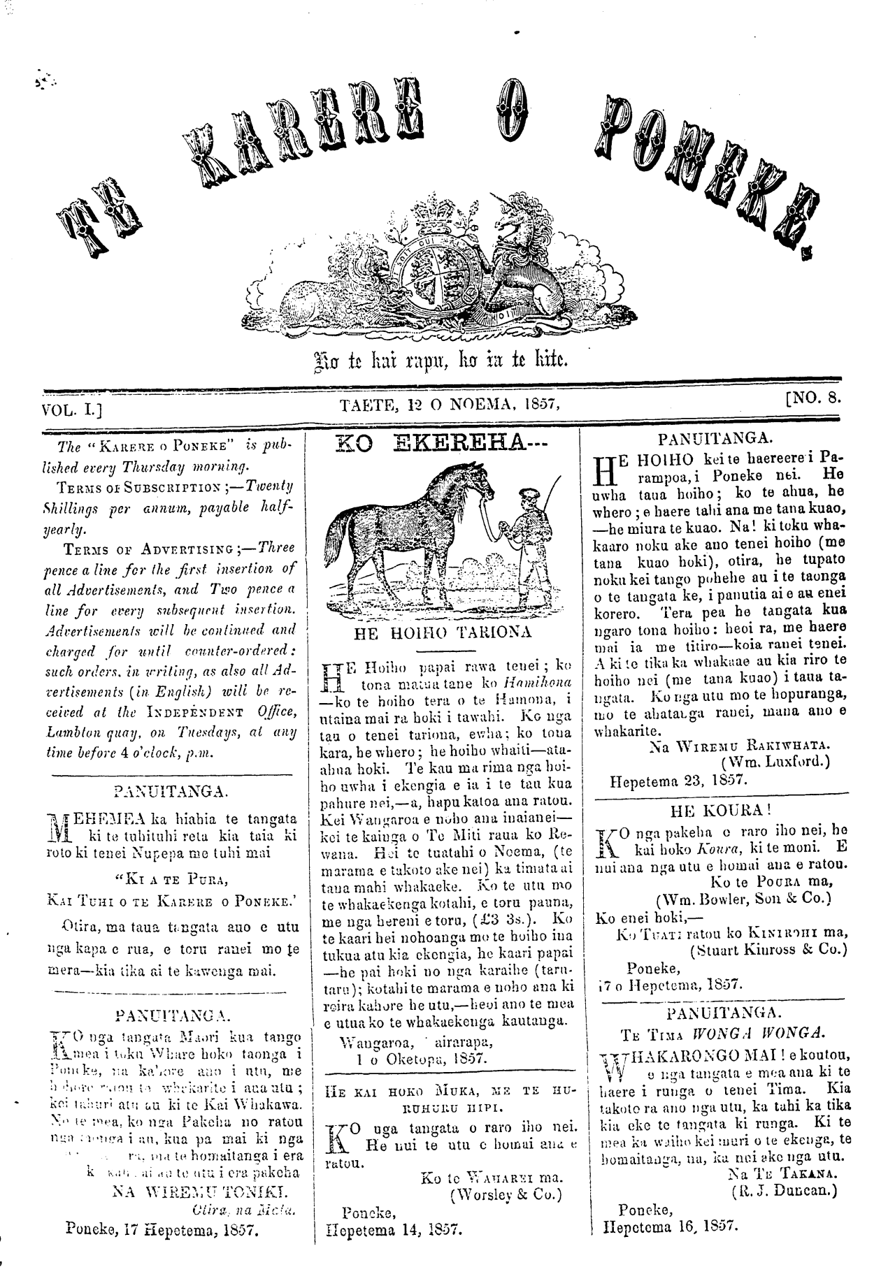 TE KARERE O PONEKE. Ko te kai rapu, ko ia te kite Vol 1.] TAETE, 12 O NOEMA, 1857, [NO. 8. The "KARERE o PONEKE" is pub- lished every Thursday morning. TERMS OF SUBSCRIPTION; Twenty Shillings per annum, payable half- yearly. TERMS OF ADVERTISING; Three pence a line for the first insertion of all Advertisements, and Two pence a line for every subsequent insertion. Advertisements will be continued and charged for until counter-orderd: such orders, in writing, as also all Ad- vertisements ( in English ) will be re- ceived at the INDEPENDENT office, Lambton quay, on Tuesdays, at any time before 4 o'clock, p.m. PANUITANGA. MEHEMEA ka hiahia te tangata ki te tuhituhi reta kia taia ki roto ki tenei Nupepa me tuhi mai "KI A TE PURA, KAI TUHI O TE KARERE O PONEKE.' Otira, ma taua tangata ano e utu nga kapa e rua, e toru ranei mo te mera—kia tika ai te kawenga mai. PANUITANGA. Ko nga tangata Maori kua tango mea i toku Whare hoko taonga i Poneke, na kahore ano i utu, me hohoro ratou te whakarite i aua utu; kei tahuri atu au ki te Kai Whakawa. No te mea, ko nga Pakeha no ratou nga taonga i au, kua pa mai ki nga utu;—heoi ra, ma te homaitanga i era moni ka kaha ai au te utu i era pakeha NA WIREMU TONIKI. Otira, na Mata. Poneke, 17 Hepetema, 1857. KO EKEREHA HE HOIHO TARIONA HE Hoiho papai rawa tenei; ko tona matua tane ko Hamihona —ko te hoiho tera o te Hamona, i utaina mai ra hoki i tawahi. Ko nga tau o tenei tariona, ewha; ko tona kara, he whero; he hoiho whaiti—ata- ahua hoki. Te kau ma rima nga hoi- ho uwha i ekengia e ia i te tau kua pahure nei,—a, hapu katoa ana ratou. Kei Wangaroa e noho ana inaianei— kei te kainga o Te Miti raua ko Re- wana. Hei te tuatahi o Noema, (to marama e takoto ake nei) ka timata ai tana mahi whakaeke. Ko te utu mo te whakaekenga kotahi, e toru pauna, me nga hereni e toru, (Ł3 3s.). Ko te kaari hei nohoanga mo te hoiho ina tukua atu kia ekengia, he kaari papai —he pai hoki no nga karaihe (taru- taru); kotahi te marama e noho ana ki reira kahore he utu,—heoi ano te mea e utua ko te whakaekenga kautanga. Wangaroa, Wairarapa, 1 o Oketopa, 1857. HE KAI HOKO MUKA, ME TE HU- RUHURU HIPI. KO nga tangata o raro iho nei. He nui te utu e homai ana e ratou. Ko te WAHAREI ma. (Worsley & Co.) Poneke, Hepetema 14, 1857. PANUITANGA. HE HOIHO kei te haereere i Pa- ramapoa, i Poneke nei. He uwha taua hoiho; ko te ahua, he whero; e haere tahi ana me tana kuao, —he miura te kuao. Na! ki toku wha- kaaro noku ake ano tenei hoiho (me tana kuao hoki), otira, he tupato noku kei tango pohehe au i te taonga o te tangata ke, i panutia ai e au enei korero. Tera pea he tangata kua ngaro tona hoiho: heoi ra, me haere mai ia me titiro—koia ranei tenei. A ki te tika ka whakaae au kia riro te hoiho nei (me tana kuao) i taua ta- ngata. Ko nga utu mo te hopuranga, mo te ahatanga ranei, mana ano e whakarite. Na WIREMU RAKIWHATA. (Wm. Luxford.) Hepetema 23, 1857. HE KOURA! KO nga pakeha o raro iho nei, he kai hoko Koura, ki te moni. E nui ana nga utu e homai ana e ratou. Ko te POURA ma, (Wm. Bowler, Son & Co.) Ko enei hoki,— Ko TUATI ratou ko KINIROHI ma, (Stuart Kinross & Co.) Poneke, 17 o Hepetema, 1857. PANUITANGA. TE TIMA WONG WONGA. WHAKARONGO MAI! e koutou, e nga tangata e mea aua ki te haere i runga o tenei Tima. Kia takoto ra ano nga utu, ka tahi ka tika kia eke te tangata ki runga. Ki te mea ka waiho kei muri o te ekenga, te homaitanga, na, ka nui ake nga utu. Na TE TAKANA. (R. J. Duncan.) Poneke, Hepetema 16, 1857.