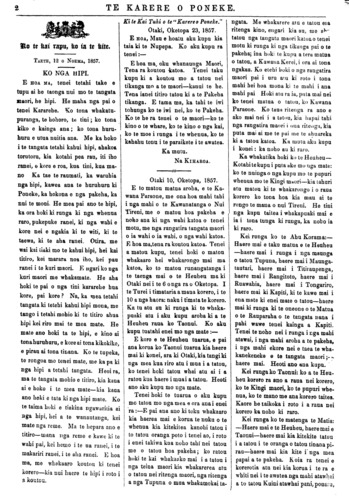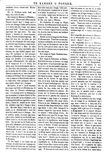 TE KARERE O PONEKE. Ko te kai rapu, ko ia te kite TAETE, 12 o NOEMA, 1857. KO NGA HIPI. E HOA MA, tenei tetahi take e tupu ai he taonga nui mo te tangata maori, he hipi. He maha nga pai o tenei Kararehe. Ko tona whakatu- puranga, te hohoro, te tini; ko tona kiko e kainga aua; ko tona huru huru e utua nuitia ana. Me ka hoko i te tangata tetahi kahui hipi, ahakoa torutoru, kia kotahi pea rau, iti iho ranei, e kore e roa, kua tini, kua ma- no Ka tae te raumati, ka waruhia nga hipi, kawea ana te huruhuru ki Poneke, ka hokona e nga pakeha, ka nui te moni. He mea pai ano te hipi, ka ora hoki ki runga ki nga whenua raro, pukepuke ranei, ki nga wahi e kore nei e ngakia ki te witi, ki to taewa, ki te aha ranei. Otira, me wai kai tiaki mo te kahui hipi, hei kai titiro, kei marara noa iho, kei pau ranei i te kuri maori. E ngari ko nga kuri maori me whakamate. He aha hoki te pai o nga tini kararehe hua kore, pai kore? Na, ka mea tetahi tangata ki tetehi kahui hipi moua, me tango i tetahi mohio ki te titiro ahua hipi kei riro mai te mea mate. He mate ano hoki ta te hipi, e kino ai tona huruhuru, e kore ai tona kikokiko, e pirau ai tona tinana. Ko te tupeka, te rongoa mo tenei mate, me ka pa ki nga hipi a tetahi tangata. Heoi ra, ma te tangata mohio e titiro, kia kaua ai e hoko i te mea mate—kia kaua ano hoki e tata ki nga hipi mate. Ko te taima huki e tiakina ngawaritia ai nga hipi, hei a te wanautanga, kei mate nga reme. Ma te hepara ano e titiro—mana nga reme e kawe ki te wahi pai, kei hemo i te ua ranei, i te makariri ranei, i te aha ranei. E hoa ma, me whakaaro koutou ki tenei korero—kia nui haere te hipi i roto i a koutou, Ki te Kai Tuhi o te "Karere o Poneke." Otaki, Oketopa 23, 1857. E HOA, Mau e hoatu aku kupu kia taia ki te Nupepa. Ko aku kupu ra tenei:— E hoa ma. oku whanaunga Maori, Tena ra koutou katoa. Tenei taku kupu ki a koutou mo a tatou nei tikanga mo a te maori—kanui te he. Tena ianei titiro tatou ki a te Pakeha tikanga. E tama ma, ka tahi te iwi tohunga ko te iwi nei, ko te Pakeha. Ko te he ra tenei o te maori—ko te kino o te whare, ko te kino o nga kai, ko te moe i runga i te whenua, ko te kahahu tonu i te paraikete i te awatea. Ka mutu. Na KIHAROA. Otaki IO, Oketopa, 1857. E to matou matua aroha, e te Ka- wana Paraone, me ona hoa mahi tahi i nga mahi o te Kawanatanga o Nui Tireni, me o matou hoa pakeha e noho ana ki nga wahi katoa o tenei motu, me nga rangatira tangata maori o ia wahi o ia wahi, o nga wahi katoa. E hoa ma, tena mau koutou katoa. Tenei a matou kupu, tenei hoki o matou whakaaro hei whakarongo mai ma katoa, ko to matou runangatanga i te taenga mai o te Heuheu ma ki Otaki nei i te 6 onga ra o Oketopa. I te Turei i timataria a maua korero, i te 10 a nga haora: naku i timata te korero. Ka tu atu au ki runga ki te whaka- puaki atu i aku kupu aroha ki a te Heuheu raua ko Taonui. Ko aku kupu tuatahi enei mo nga mate:— E koro e te Heuheu tuarua, e pai ana korua ko Taonui tuarua kia haere mai ki konei, ara ki Otaki, kia tangi ki nga mea kua riro atu i mua i a tatou, ko tenei hoki tatou whai atu ai i a ratou kua haere i mua i a tatou. Heoti ano aku kupu mo nga mate. Tenei hoki te tuarua o aku kupu mo tatou mo nga mea e ora ana i enei ra:—E pai ana ano ki toku whakaaro kia haerea mai e korua te nuku o te whenua kia kitekitea kanohi tatou i to tatou oranga poto i tenei ao, i roto i enei takiwa kua noho tahi nei tatou me o tatou hoa pakeha; ko ratou hoki te kai whakaako mai i a tatou i nga teina maori kia whakarerea atu o tatou nei ritenga maori nga ritenga a nga Tupuna o mua whakamokai ta- ngata. Me whakarere atu e tatou eia ritenga kino, engari kia au, me ahu tatou nga tangata maori katoa o tenei motu ki runga ki nga tikanga pai o te pakeha; ina hoki te kupu a tera matua o tatou, a Kawana Kerei, i ora ai tona ngakau. Ko etehi hoki o nga rangatira maori pai i uru atu ki roto i tona mahi hei hoa mona ki te mahi i ana mahi pai Hoki atu ra ia, puta mai nei ko tenei matua o tatou, ko Kawana Paraone. Ko taua ritenga ra ano e ako mai nei i a tatou, kia hapai tahi nga rangatira maori i ona ritenga, kia puta mai ai me te pai me te ahuareka ki a tatou katoa. Ka mutu aku kupu i konei: ka noho au ki raro. Ka whakatika hoki ko te Heuheu— Kotahi te kupu i puta ake mo nga mate: ko te nuinga o nga kupu mo te pupuri whenua mo te Kingi maori—kia tahuri atu matou ki te whakarongo i o raua korero ko tona hoa kia mau ai te rongo te maua o nui Tireni. He tini nga kupu taitea i whakapuaki mai e ia i tona tunga ki runga, ka noko ia ki raro. Kei runga ko te Ahu Korama:— Haere mai e taku matua e te Heuheu —haere mai i runga i nga maunga o tatou Tupuna, haere mai i Maunga- tautari, haere mai i Titiraupenga, haere mai i Rangitoto, haere mai i Ruawahia, haere mai i Tongariro, haere mai ki Kapiti, ki te kawe mai i ena mate ki enei mate o tatou—haere mai ki runga ki te oneone o te Matua o te Rauparaha o te tangata nana i pahi wawe tenei kainga a Kapiti. Tenei te noho nei i runga i nga mahi atawai, i nga mahi aroha a te pakeha, i nga mahi ekore nei e taea te wha- kanekeneke e te tangata maori;-- haere mai. Heoti ano ana kupu. Kei runga ko Taonui: ko a te Heu- heu korero ra ano a raua nei korero, ko te Kingi maori, ko te pupuri whe- nua, ko te mano me ana korero taitea. Kaore he taikoka i roto i a raua nei korero ka noho ki raro. Kei runga ko te matenga te Matia: —Haere mai e te Heuheu, haere mai e Taonui—haere mai kia kitekite tatou i a tatou i te oranga o tatou tinana pi- rau—haere mai kia kite i nga mea papai a to pakeha. Koia ra tenei e korerotia atu nei kia korua i te ra e whiti nei i te awatea nga mahi atawhai a to tatou Kuini atawhai pani, pouaru,