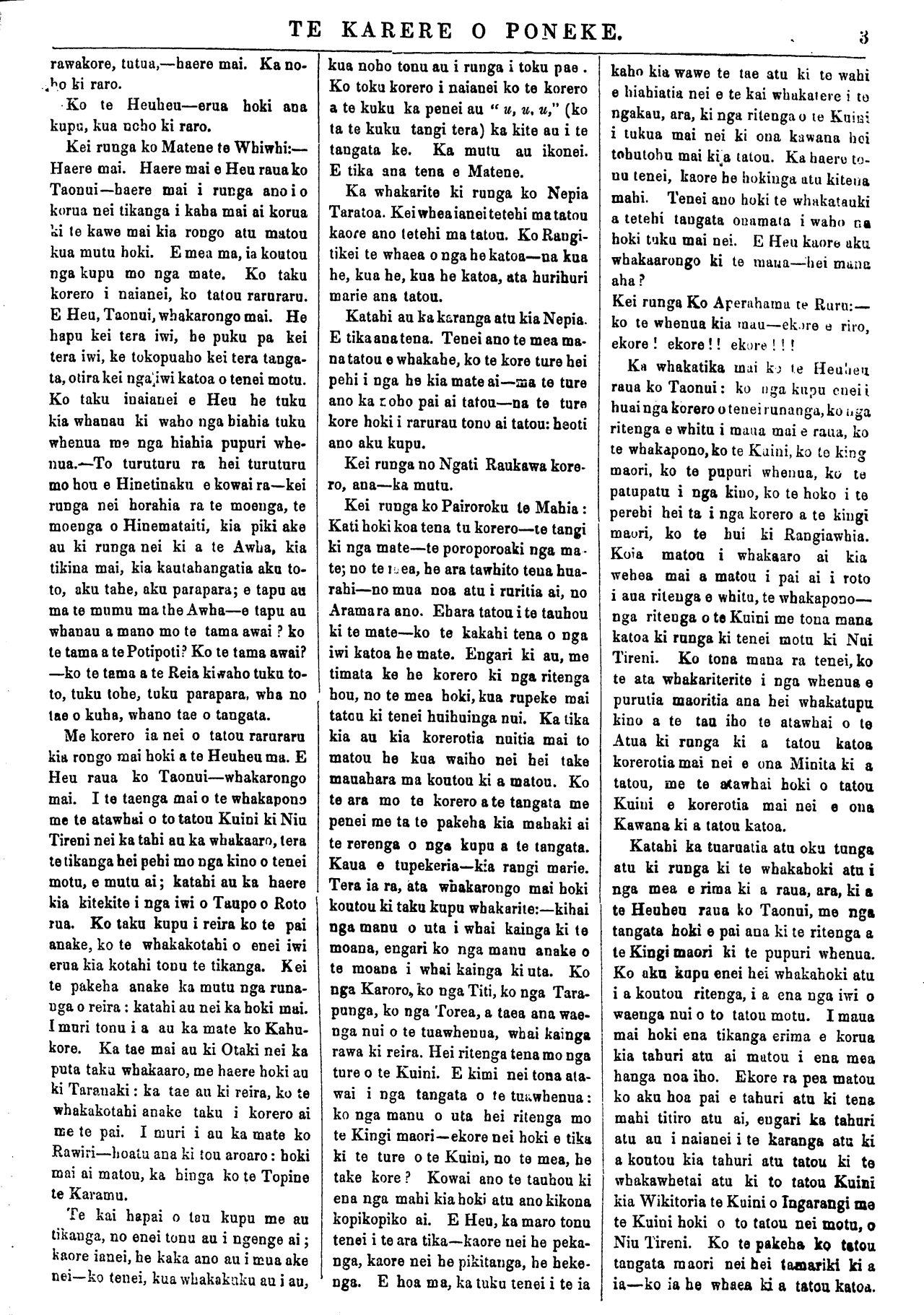 TE KARERE O PONEKE. rawakore, tutua,—haere mai. Ka no- ho ki raro. Ko te Heuheu—erua hoki ana kupu, kua noho ki raro. Kei runga ko Matene te Whiwhi:— Haere mai. Haere mai e Heu raua ko Taonui—haere mai i runga ano i o korua nei tikanga i kaha mai ai korua ki te kawe mai kia rongo atu matou kua mutu hoki. E mea ma, ia koutou nga kupu mo nga mate. Ko taku korero i naianei, ko tatou raruraru. E Heu, Taonui, whakarongo mai. He hapu kei tera iwi, he puku pa kei tera iwi, ke tokopuaho kei tera tanga- ta, otira kei nga iwi katoa o tenei motu. Ko taku inaianei e Heu he tuku kia whanau ki waho nga hiahia tuku whenua me nga hiahia pupuri whe- nua.—To tuturu ra hei tuturu mo hou e Hinetinaku e kowai ra—kei runga nei horahia ra te moenga, te moenga o Hinemataiti, kia piki ake au ki runga nei ki a te Awha, kia tikina mai, kia kautahangatia aku to- to, aku tahe, aku parapara; e tapu au ma te mumu ma te Awha—e tapu au whanau a mano mo te tama awai? ko te tama a te Potipoti? Ko te tama awai? —ko te tama a te Reia kiwaho tuku to- to, tuku tohe, tuku parapara, wha no tae o kuha, whano tae o tangata. Me korero ia nei o tatou raruraru kia rongo mai hoki a te Heuheu ma. E Heu raua ko Taonui—whakarongo mai. I te taenga mai o te whakapono me te atawhai o to tatou Kuini ki Niu Tireni nei ka tahi au ka whakaaro, tera te tikanga hei pehi mo nga kino o tenei motu, e mutu ai; katahi au ka haere kia kitekite i nga iwi o Taupo o Roto rua. Ko taku kupu i reira ko te pai anake, ko te whakakotahi o enei iwi erua kia kotahi tonu te tikanga. Kei te pakeha anake ka mutu nga runa- nga o reira: katahi au nei ka hoki mai. I muri tonu ia au ka mate ko Kahu- kore. Ka tae mai au ki Otaki nei ka puta taku whakaaro, me haere hoki au ki Taranaki: ka tae au ki reira, ko te whakakotahi anake taku i korero ai me te pai. I muri i au ka mate ko Rawiri—hoatu ana ki tou aroaro: hoki mai ai matou, ka hinga ko te Topine te Karamu. Te kai hapai o tau kupu me au tikanga, no enei tonu au i ngenge ai; kaore ianei, he kaka ano au i mua ake nei—ko tenei, kua whakakuku au i au, kua noho tonu au i runga i toku pae Ko toku korero i naianei ko te korero a te kuku ka penei au " u, u, u," (ko ta te kuku tangi tera) ka kite au i te tangata ke. Ka mutu au i konei. E tika ana tena e Matene. Ka whakarite ki runga ko Nepia Taratoa. Kei whea ianei tetehi matatou kaore ano tetehi ma tatou. Ko Rangi- tikei te whaea o nga he katoa—na kua he, kua he, kua he katoa, ata hurihuri mane ana tatou. Katahi au ka karanga atu kia Nepia. E tika ana tena. Tenei ano te mea ma- na tatou e whakahe, ko te kore ture hei pehi i nga he kia mate ai—ma te ture ano ka noho pai ai tatou—na te ture kore hoki i rarurau tono ai tatou: heoti ano aku kupu. Kei runga no Ngati Raukawa kore- ro, ana—ka mutu. Kei runga ko Pairoroku te Mahia: Kati hoki koa tena tu korero—te tangi ki nga mate—te poroporoaki nga ma- te; no te mea, he ara tawhito tena hua- rahi—no mua noa atu i ruritia ai, no Arama ra ano. Ehara tatou i te tauhou ki te mate—ko te kakahi tena o nga iwi katoa he mate. Engari ki au, me timata ke he korero ki nga ritenga hou, no te mea hoki, kua rupeke mai tatou ki tenei huihuinga nui. Ka tika kia au kia korerotia nuitia mai to matou he kua waiho nei hei take mauahara ma koutou ki a matou. Ko te ara mo te korero a te tangata me penei me ta te pakeha kia mahaki ai te rerenga o nga kupu a te tangata. Kaua e tupekeria—kia rangi mane. Tera ia ra, ata whakarongo mai hoki koutou ki taka kupu whakarite:—kihai nga manu o uta i whai kainga ki te moana, engari ko nga manu anake o te moana i whai kainga ki uta. Ko nga Karoro, ko nga Titi, ko nga Tara- punga, ko nga Torea, a taea ana wae- nga nui o te tuawhenua, whai kainga rawa ki reira. Hei ritenga tena mo nga ture o te Kuini. E kimi nei tona ata- wai i nga tangata o te tuawhenua: ko nga manu o uta hei ritenga mo te Kingi maori—ekore nei hoki e tika ki te ture o te Kuini, no te mea, he take kore? Kowai ano te tauhou ki ena nga mahi kia hoki atu ano kikona kopikopiko ai. E Heu, ka maro tonu tenei i te ara tika—kaore nei he peka- nga, kaore nei he pikitanga, he heke- nga. E hoa ma, ka tuku tenei i te ia kaho kia wawe te tae atu ki to wahi e hiahiatia nei e te kai whakatere i to ngakau, ara, ki nga ritenga o te Kuini i tukua mai nei ki ona kawana hei tohutohu mai ki a tatou. Ka haere to- nu tenei, kaore he hokinga atu kitena mahi. Tenei ano hoki te whakatauki a tetehi tangata onamata i waho na hoki tuku mai nei. E Heu kaore aku whakaarongo ki te maua—hei mana aha? Kei runga Ko Aperahama te Ruru:— ko te whenua kia mau—ekore e riro, ekore! ekore!! ekore!!! Ka whakatika mai ko te Heuheu raua ko Taonui; ko nga kupu enei i huai nga korero o tenei runanga, ko nga ritenga e whitu i mana mai e raua, ko te whakapono, ko te Kuini, ko te king maori, ko te pupuri whenua, ko ta patupatu i nga kino, ko te hoko i te perehi hei ta i nga korero a te kingi mauri, ko te hui ki Rangiawhia. Koia matou i whakaaro ai kia wehea mai a matou i pai ai i roto i aua ritenga e whitu, te whakapono— nga ritenga o te Kuini me toua mana katoa ki ranga ki tenei motu ki Nui Tireni. Ko tona maua ra tenei, ko te ata whakariterite i nga whenua e pumua maoritia ana hei whakatupu kino a te tau iho te atawhai o te Atua ki ranga ki a tatou katoa korerotia mai nei e ona Minita ki a tatou, me te atawhai hoki o tatou Kuini e korerotia mai nei e ona Kawana ki a tatou katoa. Katahi ka tuaruatia atu oku tunga atu ki runga ki te whakahoki atu i nga mea e rima ki a raua, ara, ki a te Heuheu raua ko Taonui, me nga tangata hoki e pai ana ki te ritenga a te Kingi maori ki te pupuri whenua. Ko aku kapa enei hei whakahoki atu i a koutou ritenga, i a ena nga iwi o waenga nui o to tatou motu. I maua mai hoki ena tikanga e rima e korua kia tahuri atu ai matou i ena mea hanga noa iho. Ekore ra pea matou ko aku hoa pai e tahuri atu ki tena mahi titiro atu ai, engari ka tahuri atu au i naianei i te karanga atu ki a koutou kia tahuri atu tatou ki te whaka