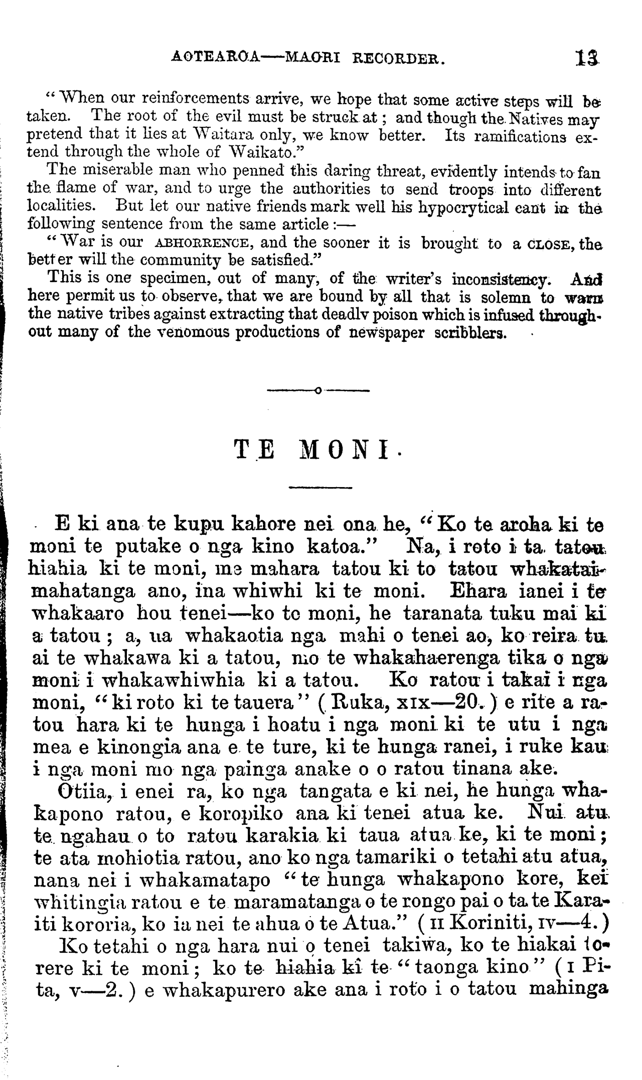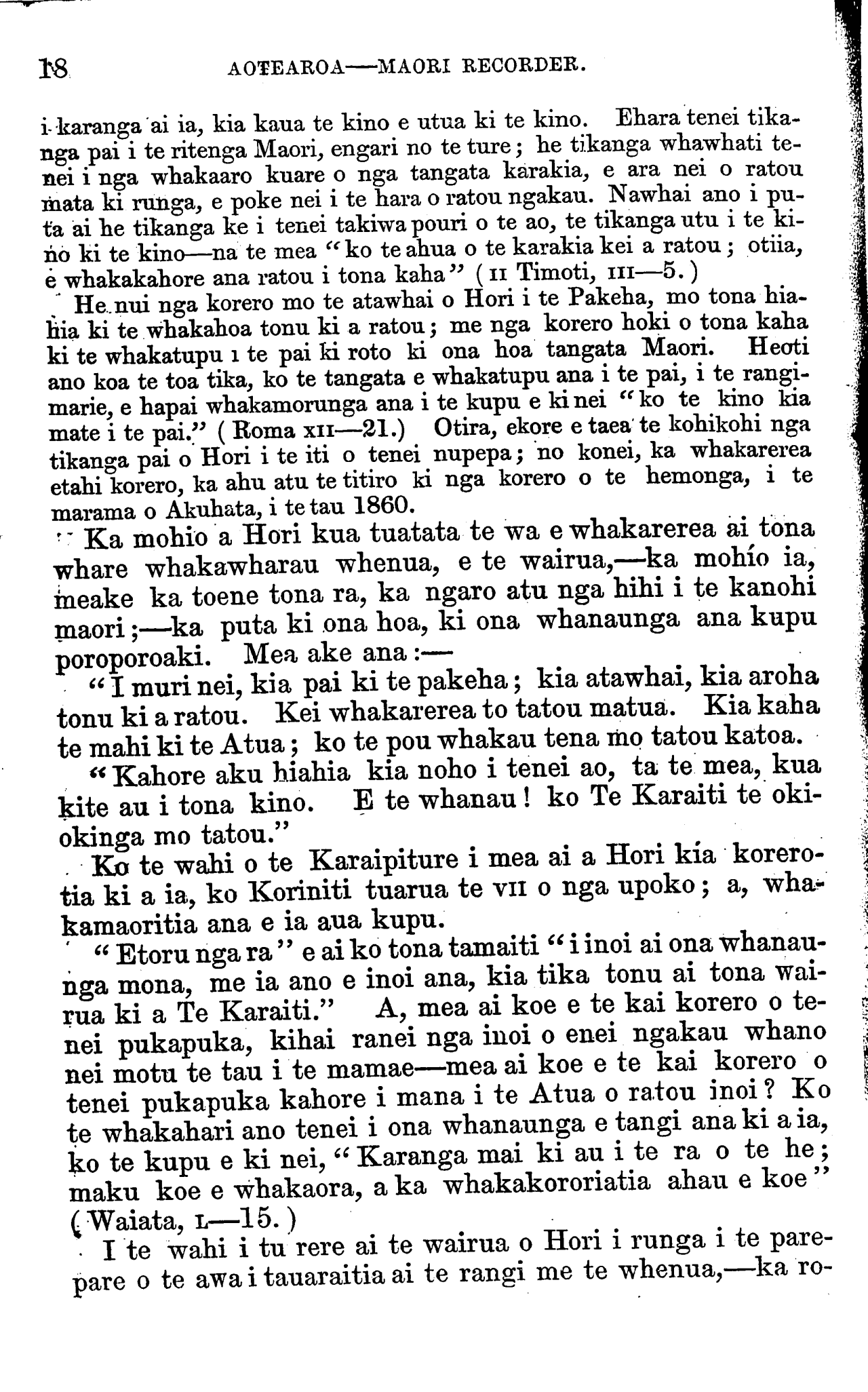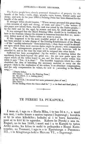 KO AOTEAROA OR THE MAORI RECORDER. HANUERE JANUARY E matau haere te hinengaro ki -te whakamahia tonutia ; otira, ka ngoikore haere, hinamoe, ki te waiho kia mangere ana. E mea ana au, e taea te moho te whakaako. The human mind will improve itself if it be kept in action, but grows dull and torpid en left to slumber. I believe stupidity may be cultivated.—Lord Collingwood. AKARANA HE MEA TA I TE PEREHI O NGA IWI MAORI. 1861