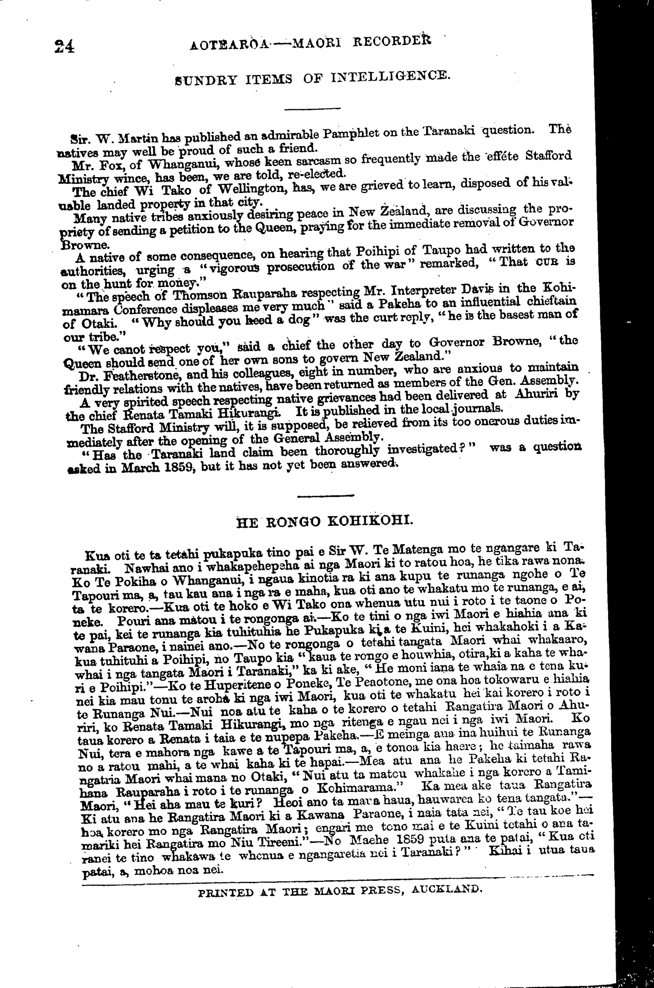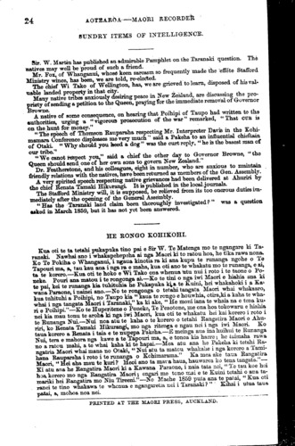 mariki hei Rangatira mo Niu Tireni. "—No Maehe 1859 puta ana te patai, " Kua oti