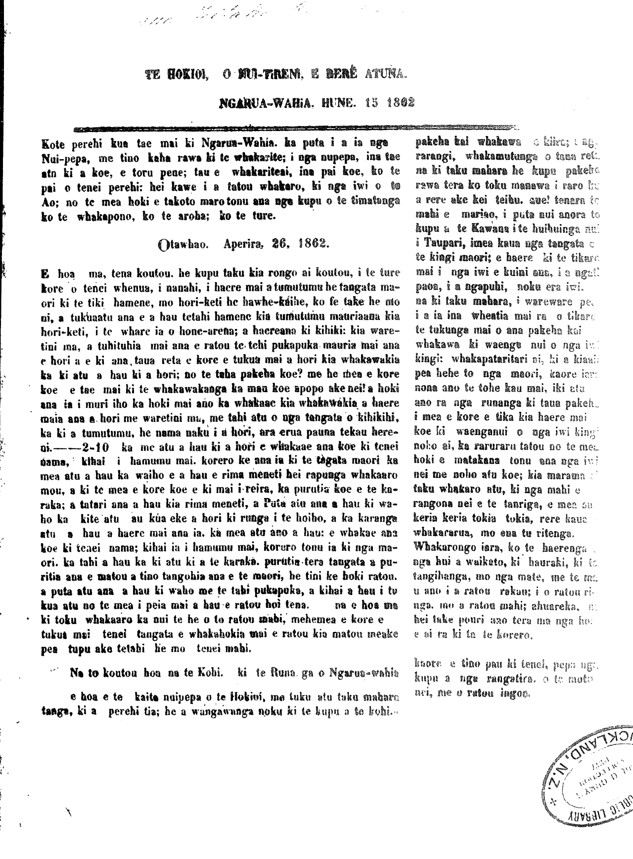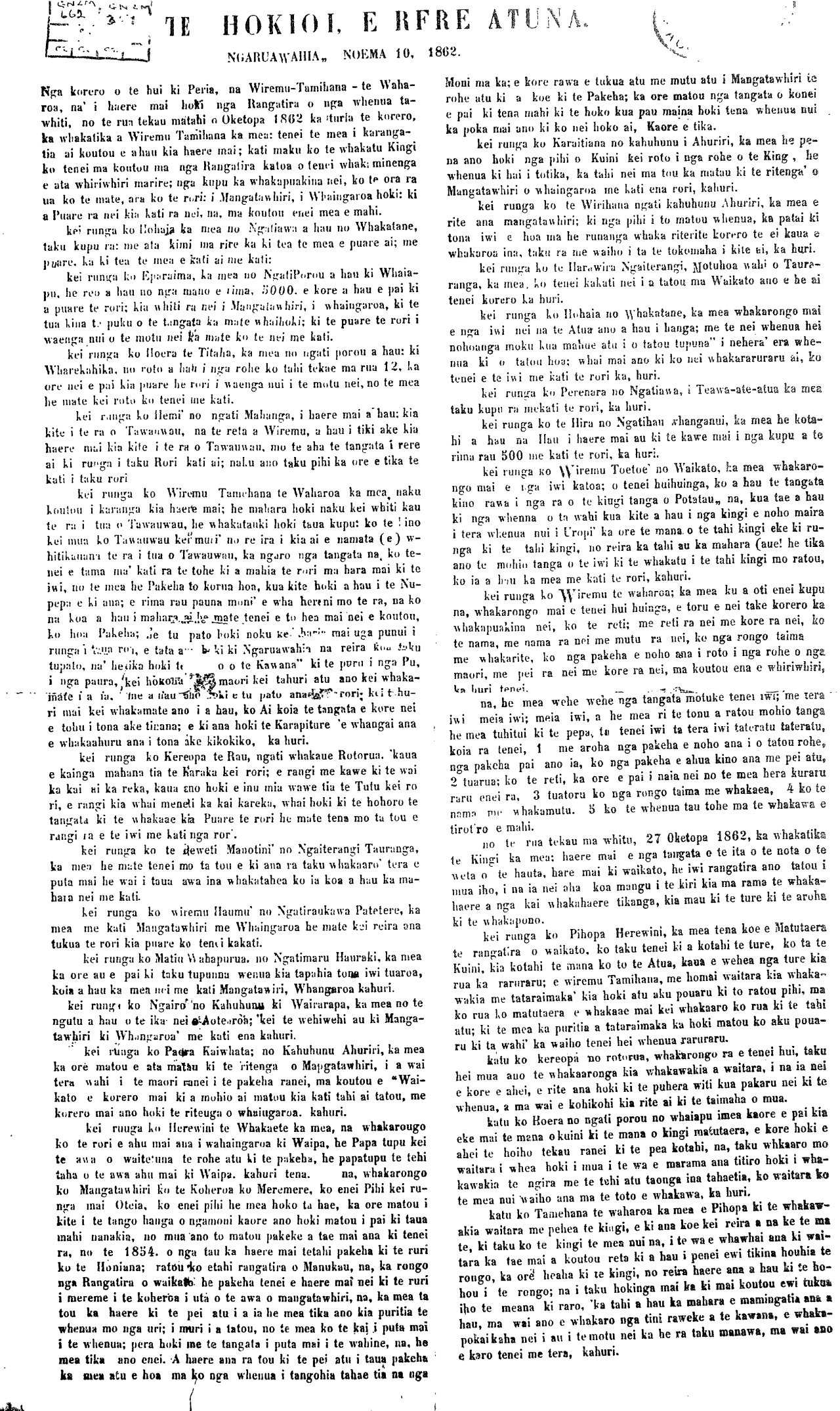 Waikanae, Oketopa 7, 1862. E hoa ma e aku hoa 1 waikato tena ra koutou; i raro i to ata-