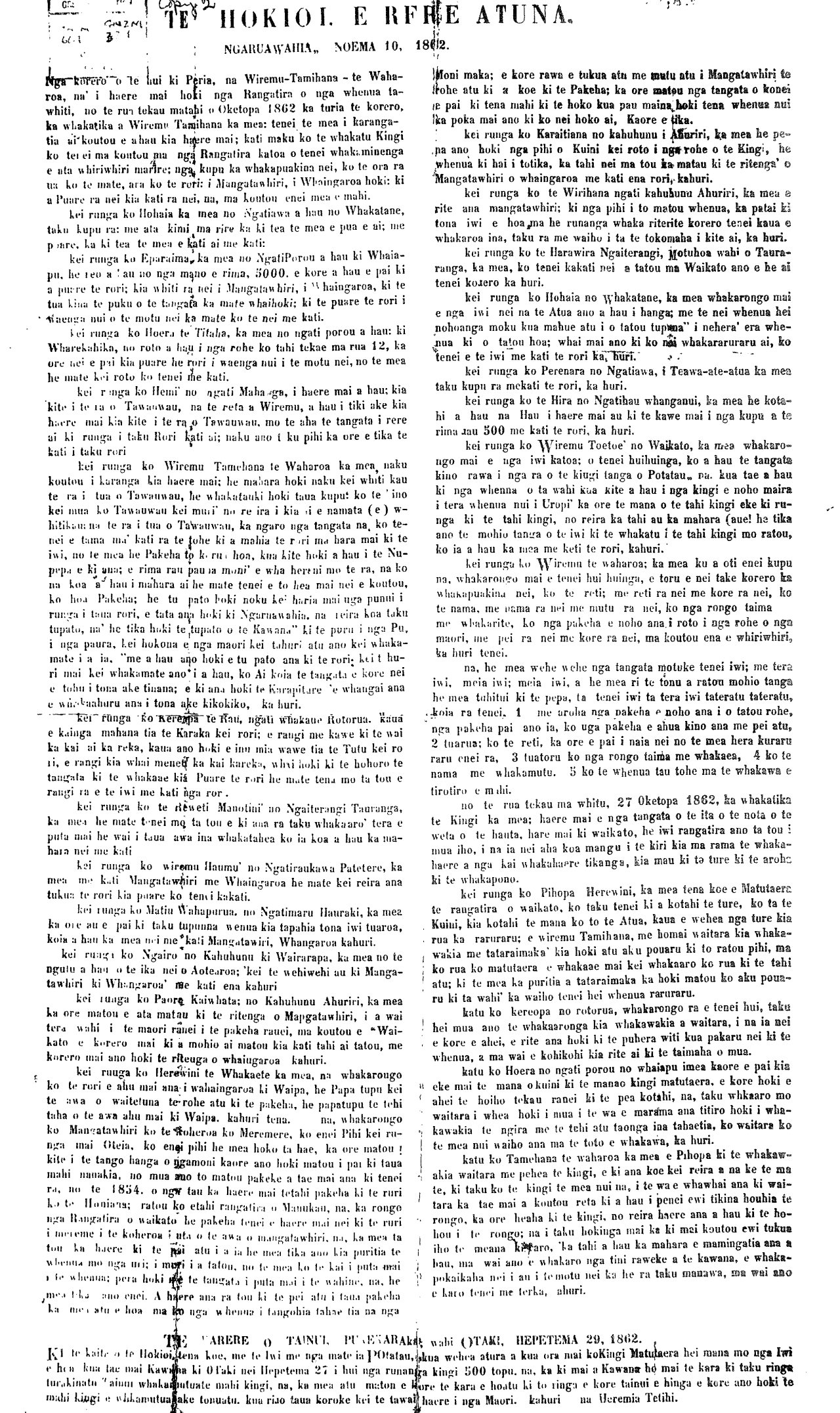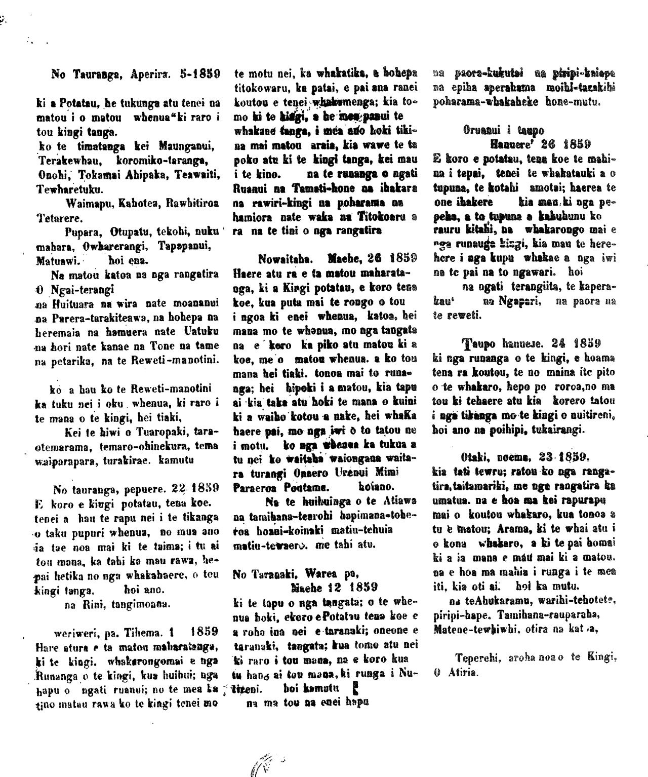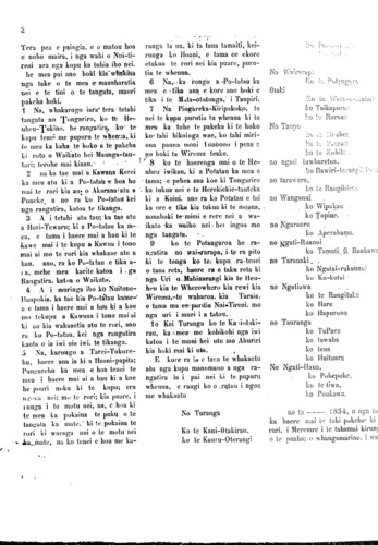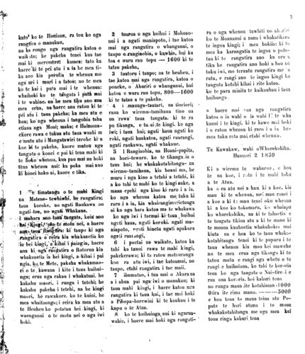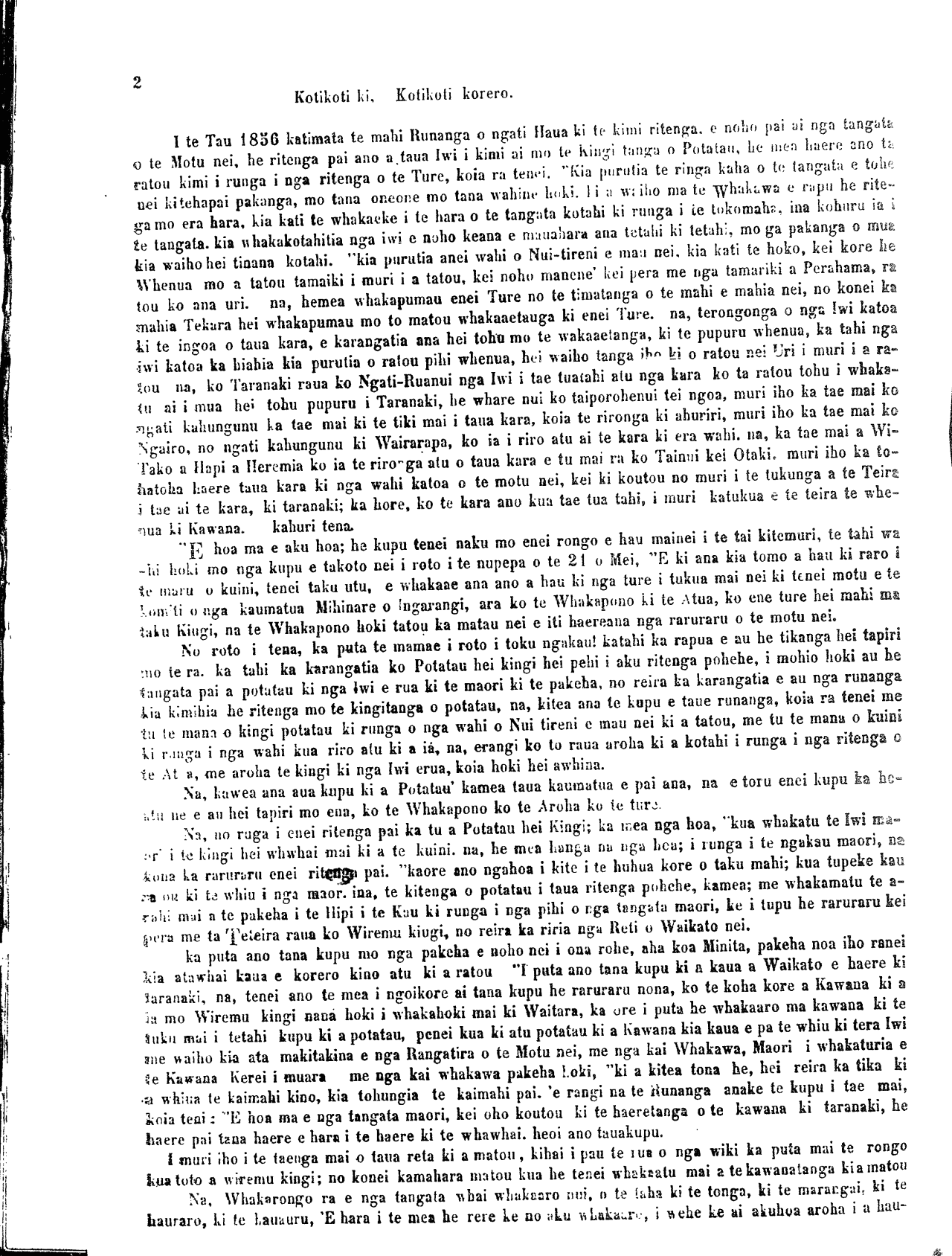 Tera pea e paingia, e o matou hoa e noho maira, i nga wahi o Nui-ti- reni ara nga kupu ka tuhia iho nei. he mea pai ano hoki Kia whakina nga take o te mea e mauaharatia nei e te tini o te tangata, maori pakeha hoki. 1 Na, whakarongo iara' tera tetahi tangata no Tongariro, ko te He- uheu-Tukino. he rangatira, ko te kupu tenei me pupuru te whenua, ki te mea ka kaha te hoko a te pakeha ki roto o Waikato hei Maunga-tau- tari; terohe mai kiaau. 2 na ka tae mai a Kawana Kerei ka mea atu ki a Po-tatau e hoa ho mai te rori kia au o Akarana atu a Poneke, a no ra ko Po-tatau kei nga rangatira, katoa te tikanga. 3 A i tetahi atu tau; ka tae atu a Hori-Tewaru; ki a Po-tatau ka m- ea, e tama i haere mai a hau ki te kawe mai i te kupu a Kawna i tono mai ai mo te rori kia whakaae atu a hau. ano, ra ko Po-tatau e tika a- , mehe mea karite katoa i nga Rangatira, katoa o Waikato: 4 A i muringa iho ko Nuitohe- Haupokia. ka tae kia Po-tatau kame- a e tama i haere mai a hau ki a koe mo tekupu a Kawana i tono mai ai ki aa kia wakaaetia atu te rori, ano ra ko Po-tatau. kei nga rangatira katoa o ia iwi oia iwi. te tikanga. 5 Na, karongo a Tarei-Tukore- hu, haere ana ia ki a Hoani-papita; Pungarehu ka mea e hoa tenei te mea i haere mai ai a hau ki a koe he pouri noku ki te kupu; era nei; mo te rori; kia puare, i runga i te motu nei, na, e hoa ki te mea La pokaina te puku o te tangata ka mute. " ki te pokaina te rori ki waenga nui o te motu nei ka mate, na ko tenei e hoa me ka- No Turanga Ko te Kani-0takirau. ko te Kauru-Oterangi