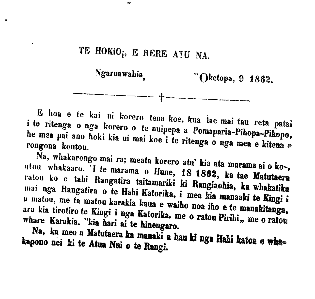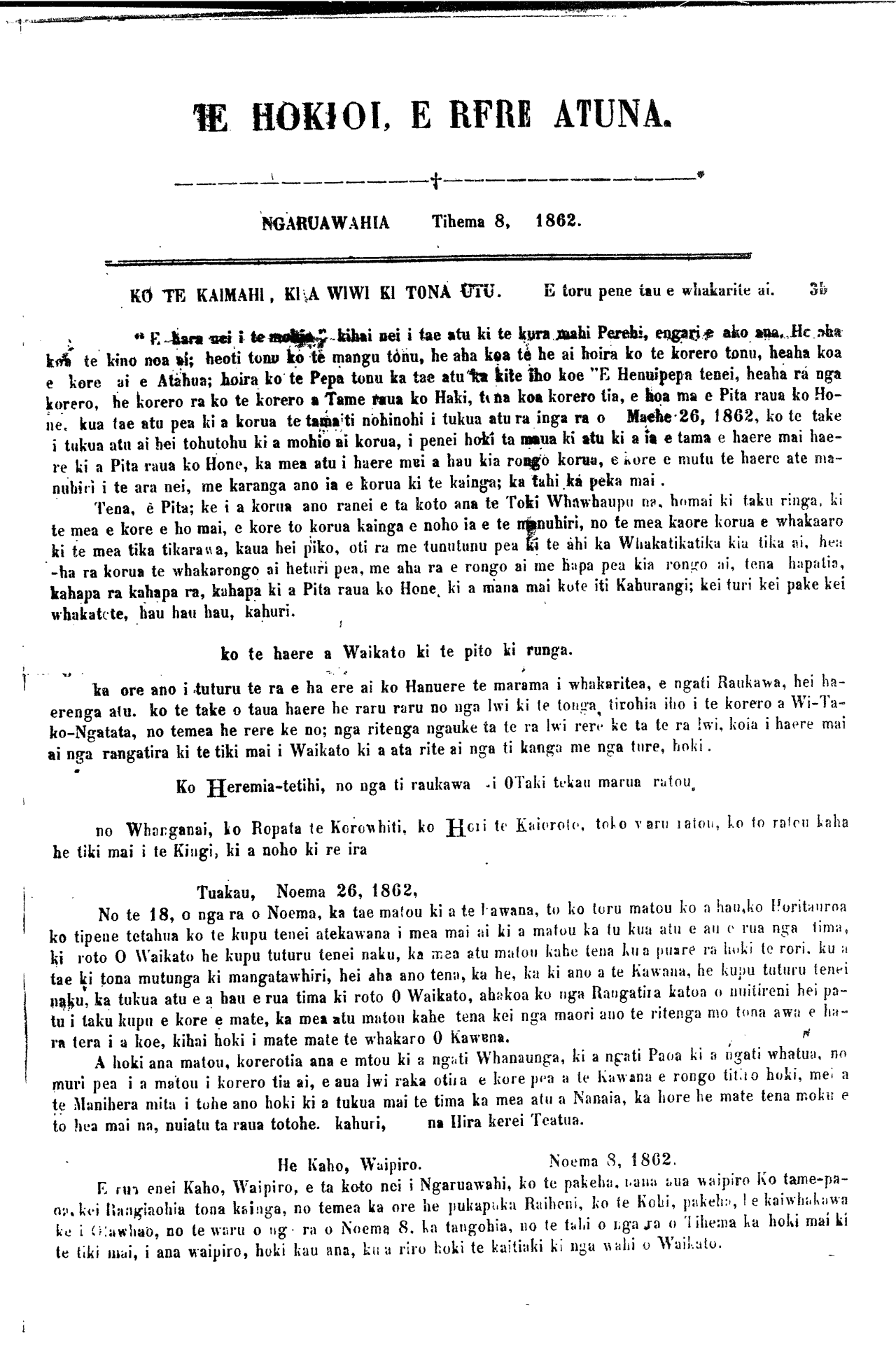 "E koro kaore ano i warewarenoa i a hau to reta i tuhituhia maira i nga ra o Hune 9, 1862 he