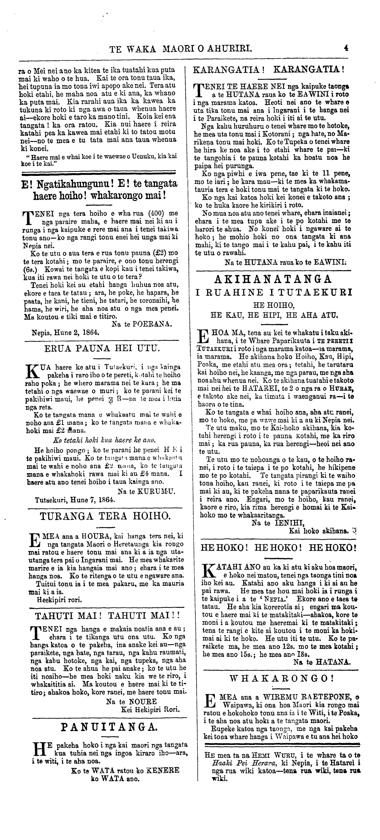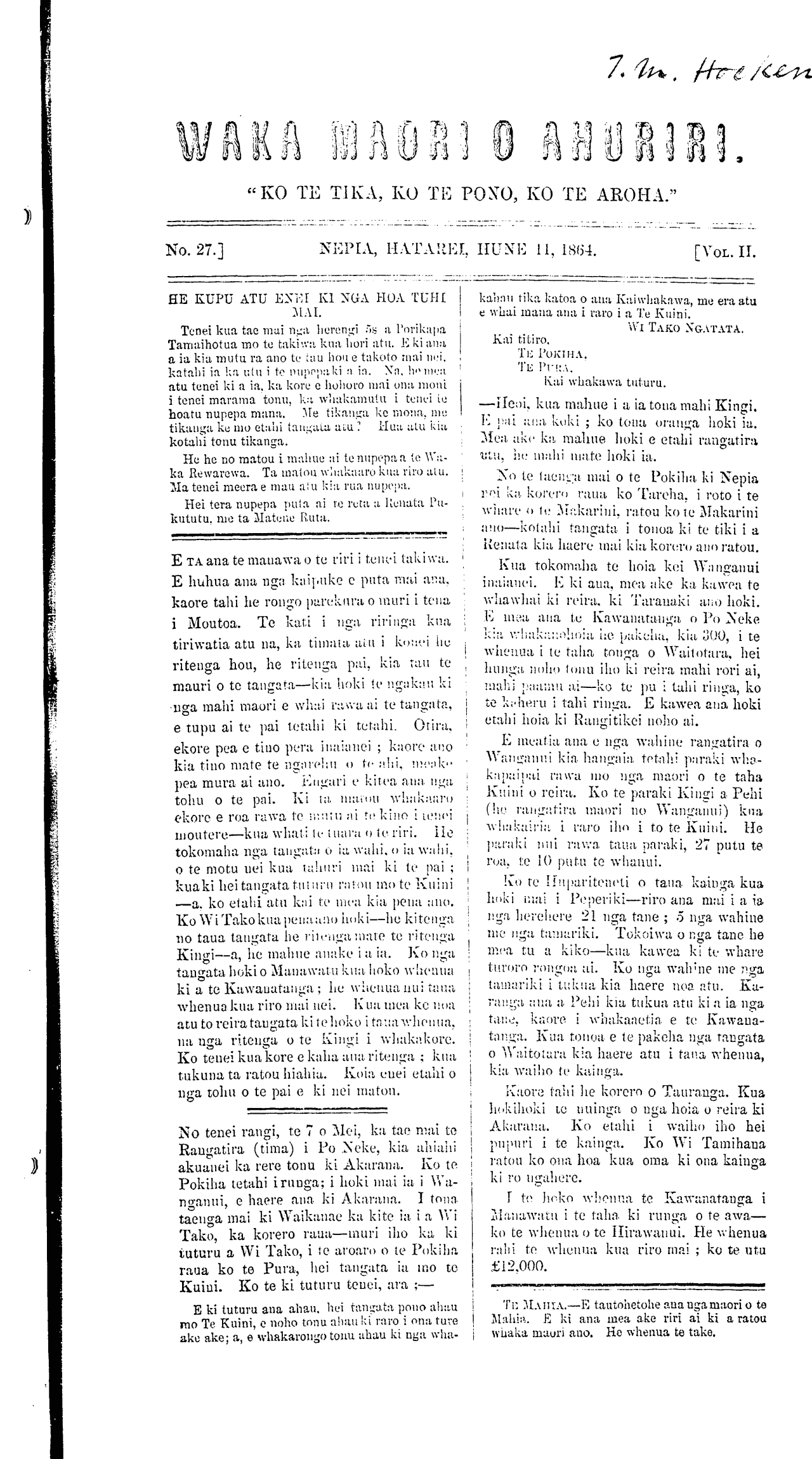 Te Waka Maori o Ahuriri 1863-1871: Volume 2, Number 27. 11 June 1864 |