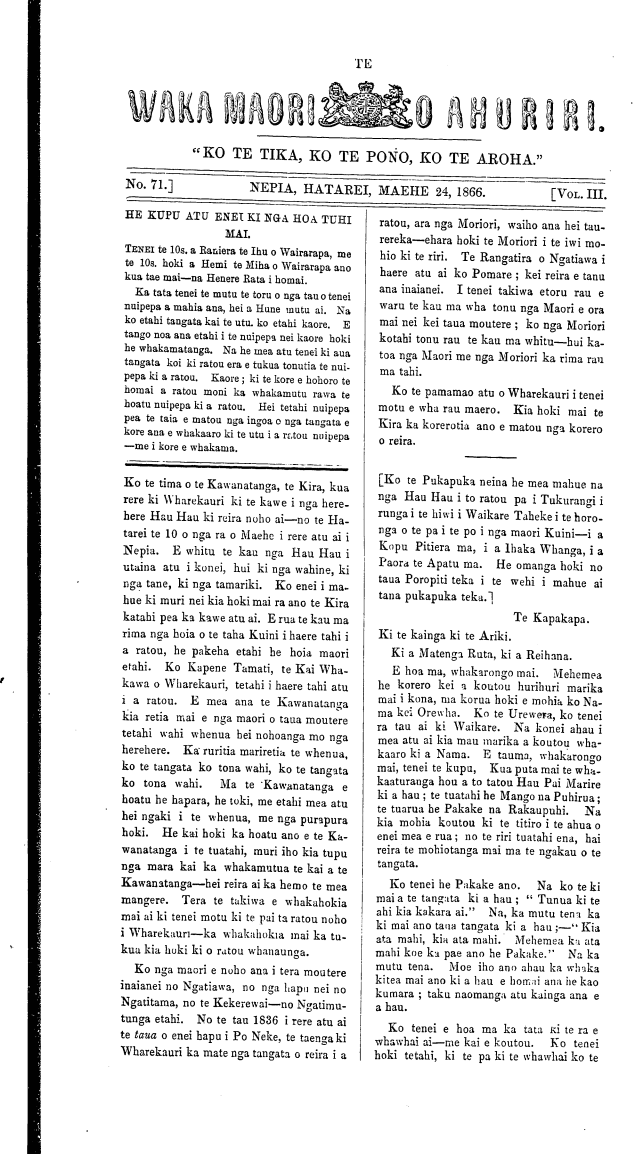 Te Waka Maori o Ahuriri 1863-1871: Volume 3, Number 71. 24 March 1866 |