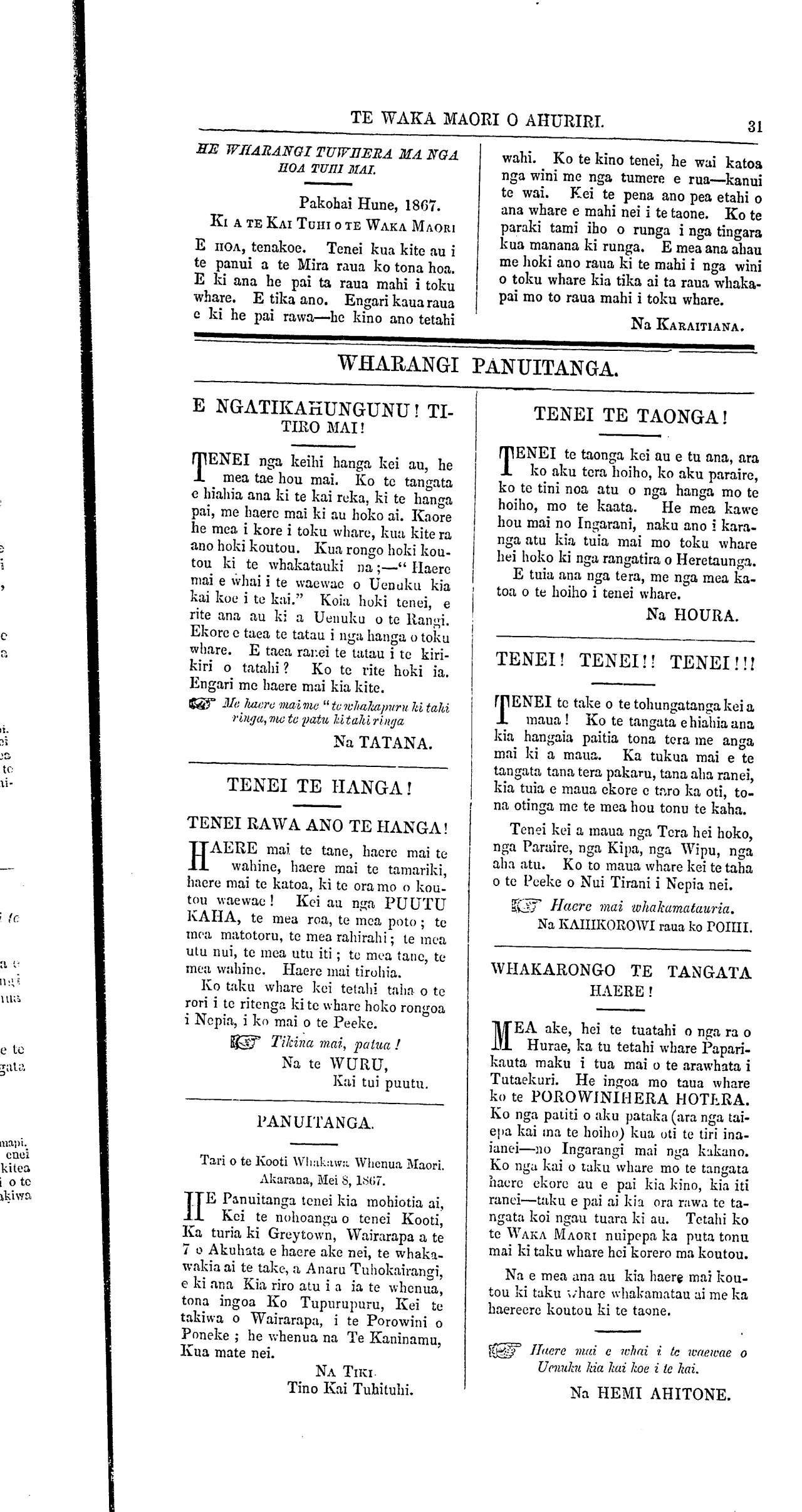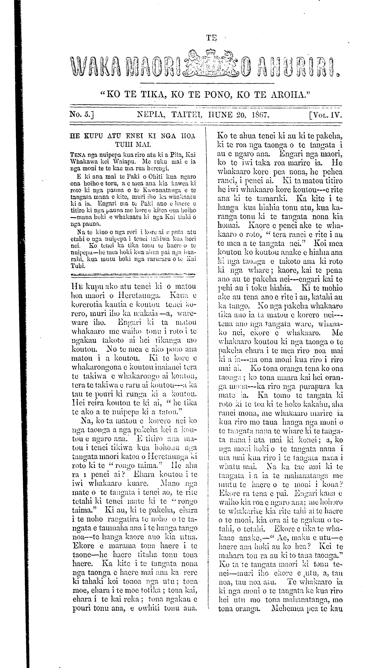 Te Waka Maori o Ahuriri 1863-1871: Volume 4, Number 5. 20 June 1867 |