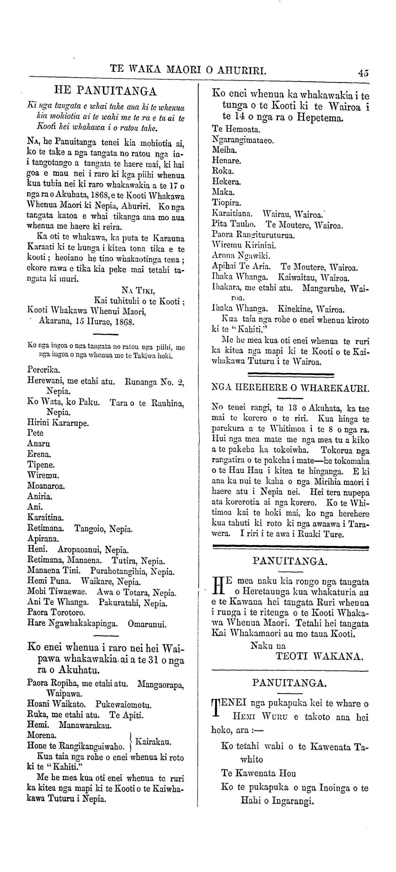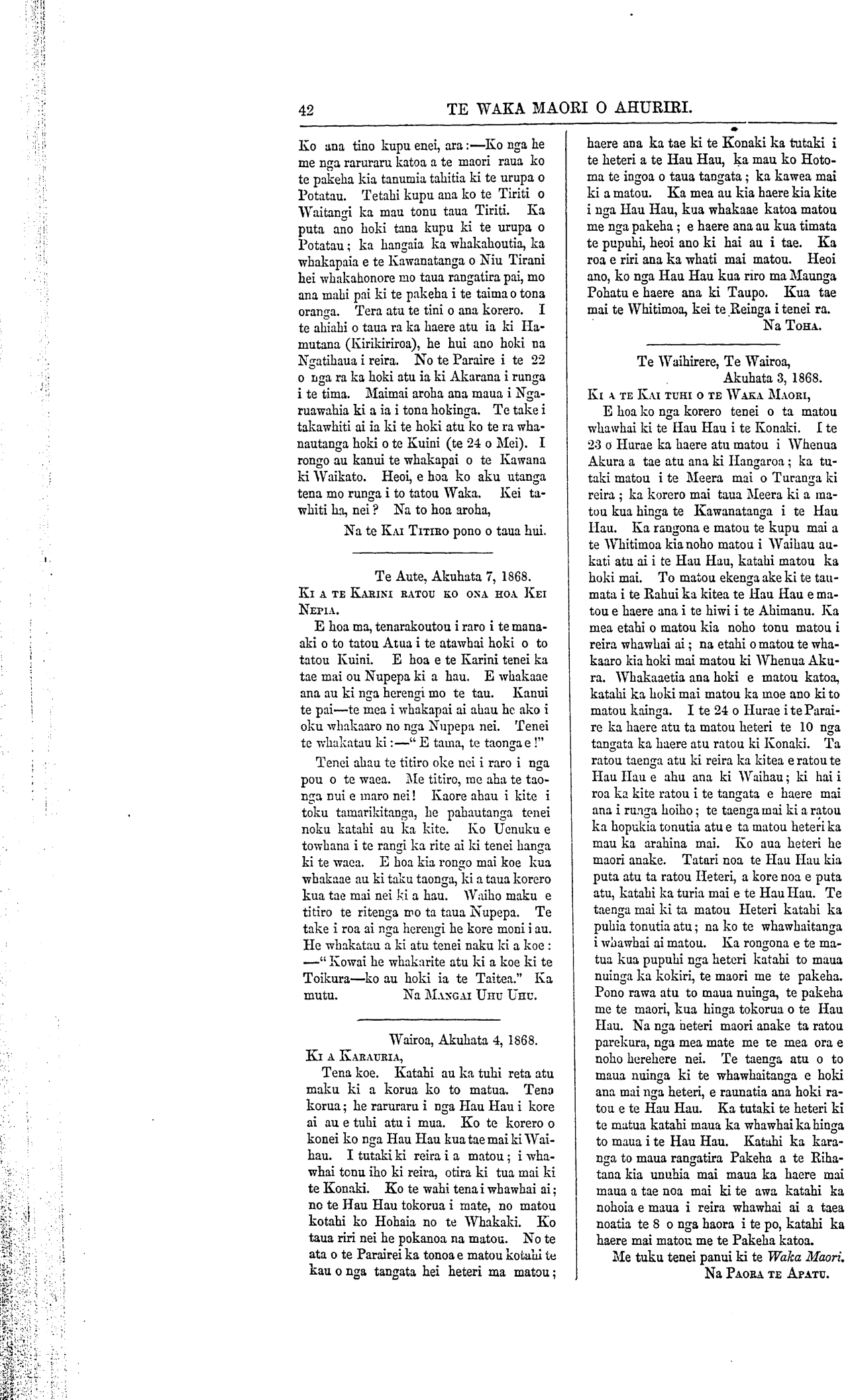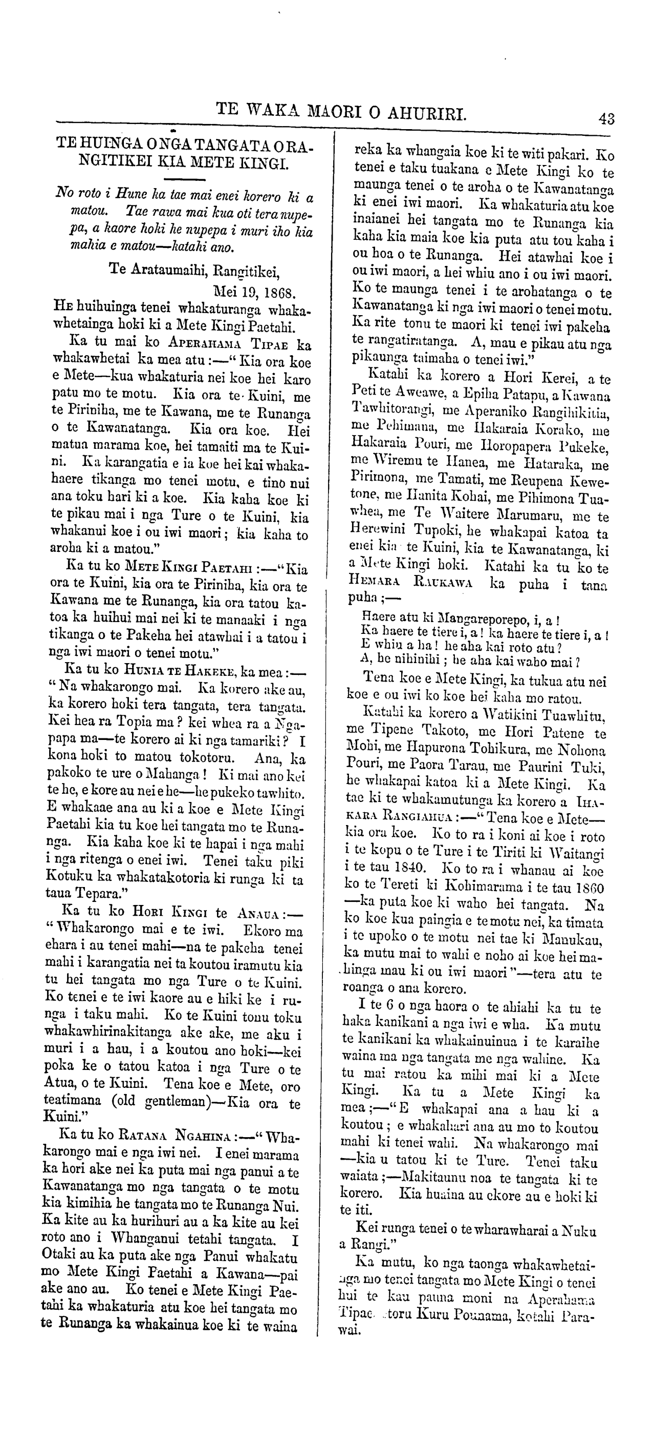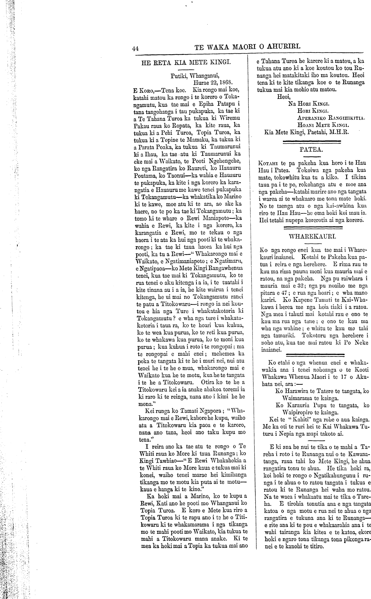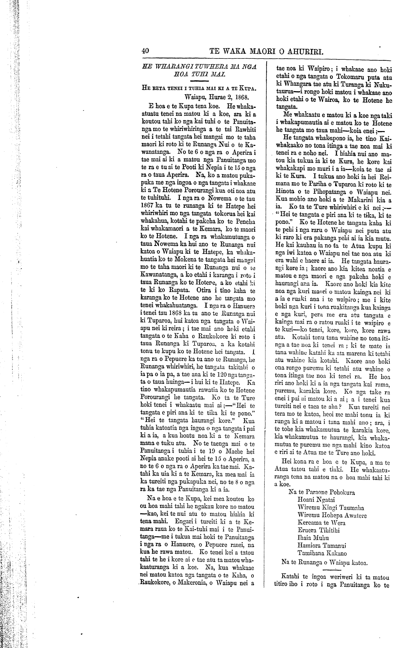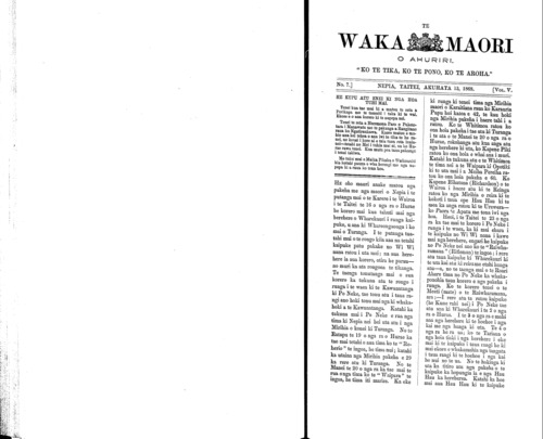 Te Waka Maori o Ahuriri 1863-1871: Volume 5, Number 7. 13 August 1868 |