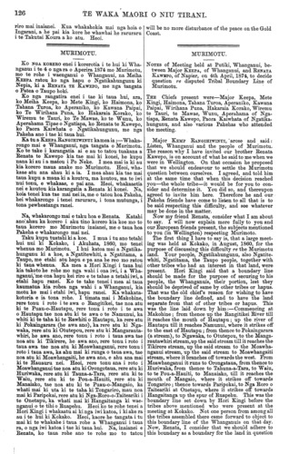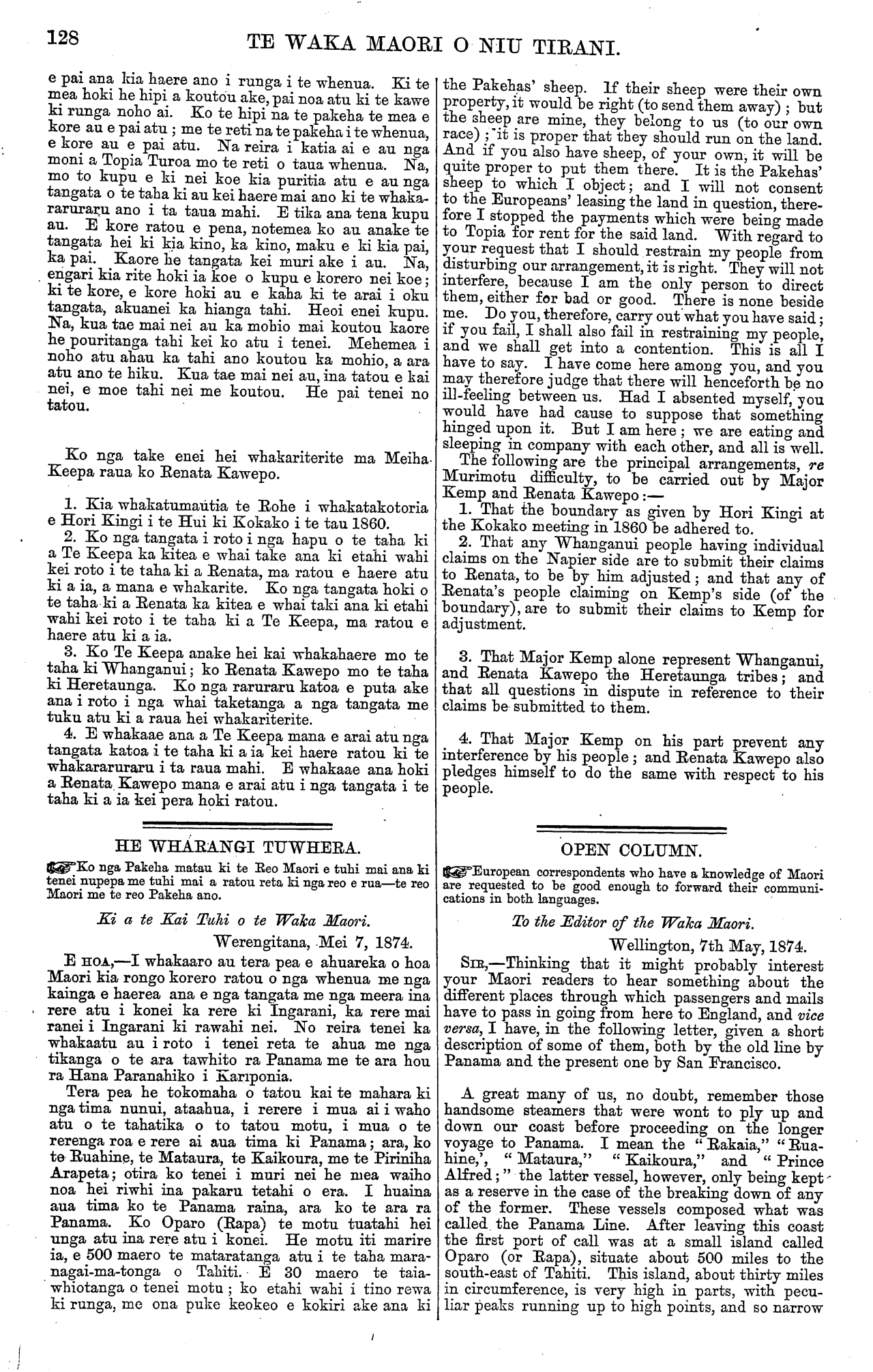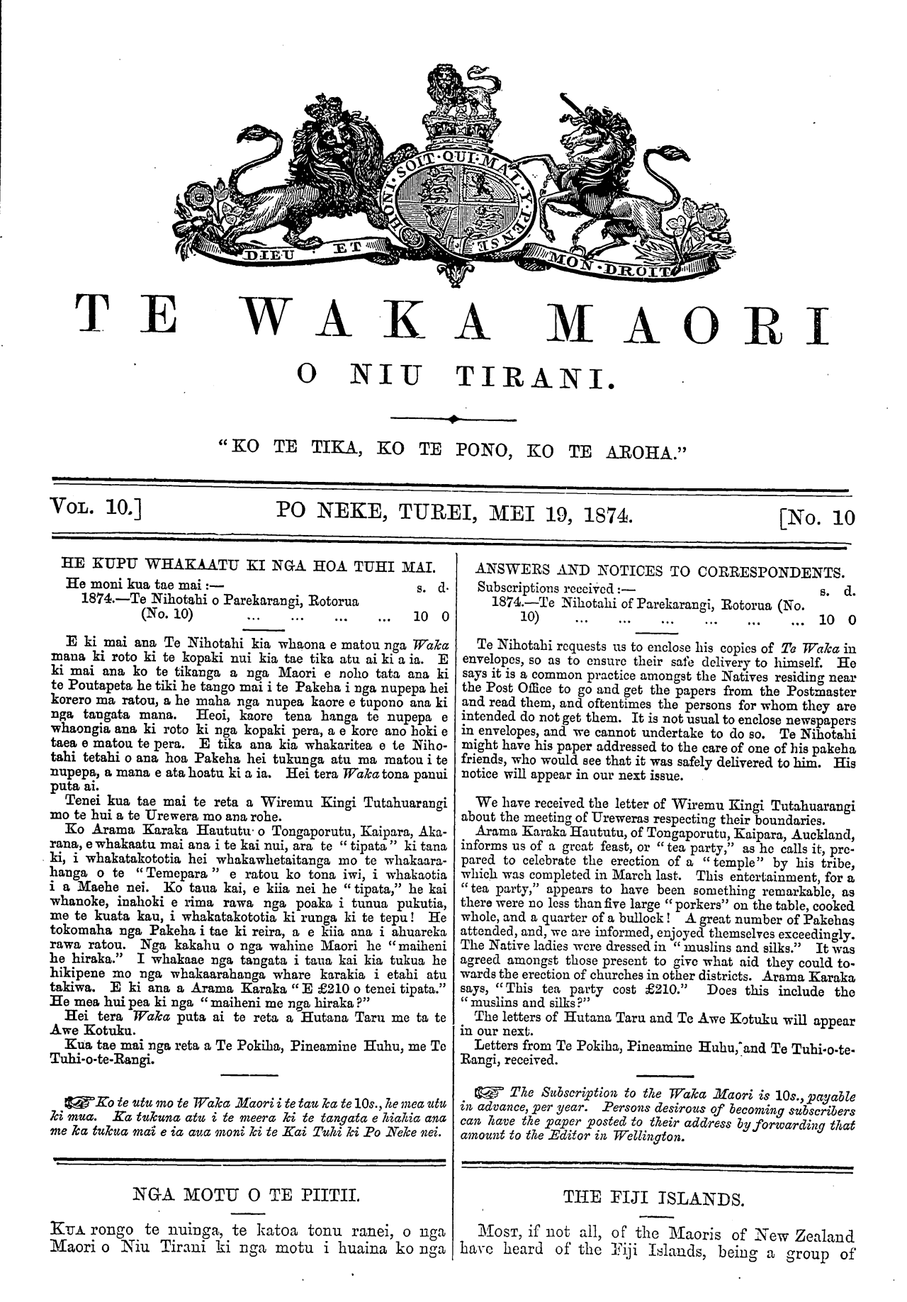 TE WA E; A MAORI O NIU TIRANI. "KO TE TIKA, KO TE PONO, KO TE AROHA." VOL. IO,] PO NEKE, TUREI, MEI 19, 1874. [No. 10 HE KUPU WHAKAATU KI NGA HOA TUHI MAI. He moni kua tae mai:— s. d. 1874.—Te Nihotahi o Parekarangi, Rotorua (No. 10) ... ... ... ... 10 O E ki mai ana Te Nihotahi kia whaona e matou nga Waka maua ki roto ki te kopaki nui kia tae tika atu ai ki a ia. E ki mai ana ko te tikanga a nga Maori e noho tata ana ki te Poutapeta he tiki he tango mai i te Pakeha i nga nupepa hei korero ma ratou, a he maha nga nupea kaore e tupono ana ki nga tangata mana. Heoi, kaore tena hanga te nupepa e whaongia ana ki roto ki nga kopaki pera, a e kore ano hoki e taea e matou te pera. E tika ana kia whakaritea e te Niho- tahi tetahi o ana hoa Pakeha hei tukunga atu ma matou i te nupepa, a mana e ata hoatu ki a ia. Hei tera Waka tona panui puta ai. Tenei kua tae mai te reta a Wiremu Kingi Tutahuarangi mo te hui a te Urewera mo ana rohe. Ko Arama Karaka Haututu o Tongaporutu, Kaipara, Aka- rana, e whakaatu mai ana i te kai nui, ara te " tipata " ki tana ki, i whakatakotoria hei whakawhetaitanga mo te whakaara- hanga o te " Temepara " e ratou ko tona iwi, i whakaotia i a Maehe nei. Ko taua kai, e kiia nei he " tipata," he kai whanoke, inahoki e rima rawa nga poaka i tunua pukutia, me te kuata kau, i whakatakotoria ki runga ki te tepu! He tokomaha nga Pakeha i tae ki reira, a e kiia ana i ahuareka rawa ratou. Nga kakahu o nga wahine Maori he " maiheni he hiraka." I whakaae nga tangata i taua kai kia tukua he hikipene mo nga whakaarahanga whare karakia i etahi atu takiwa. E ki ana a Arama Karaka " E £210 o tenei tipata." He mea hui pea ki nga " maiheni me nga hiraka?" Hei tera Waka puta ai te reta a Hutana Taru me ta te Awe Kotuku. Kua tae mai nga reta a Te Pokiha, Pineamine Huhu, me Te Tuhi-o-te-Rangi. Ko te utu mo te Waka Maori i te tau ka te 10s., he mea utu ki mua. Ka tukuna atu i te meera ki te tangata e hiahia ana me ka tukua mai e ia aua moni ki te Kai Tuhi ki Po Neke nei. NGA MOTU O TE PUTU. KUA rongo te nuinga, te katoa tonu ranei, o nga Maori o Niu Tirani ki nga motu i huaina ko nga ANSWERS AND NOTICES TO CORRESPONDENTS. Subscriptions received:— s. d. 1874.—Te Nihotahi of Parekarangi, Rotorua (No. 10) ... ... ... ... ... ... 10 O Te Nihotahi requests us to enclose his copies of To Waka in envelopes, so as to ensure their safe delivery to himself. He says it is a common practice amongst the Natives residing near the Post Office to go and get the papers from the Postmaster and read them, and oftentimes the persons for whom they aro intended do not get them. It is not usual to enclose newspapers in envelopes, and we cannot undertake to do so. Te Nihotahi might have his paper addressed to the care of one of his pakeha friends, who would see that it was safely delivered to him. His notice will appear in our next issue. We have received the letter of Wiremu Kingi Tutahuarangi about the meeting of Ureweras respecting their boundaries. Arama Karaka Haututu, of Tongaporutu, Kaipara, Auckland, informs us of a great feast, or " tea party," as he calls it, pre- pared to celebrate the erection of a "temple" by his tribe, which was completed in March last. This entertainment, for a " tea party," appears to have been something remarkable, as there were no less than five large "porkers" on the table, cooked whole, and a quarter of a bullock! A great number of Pakehas attended, and, we are informed, enjoyed themselves exceedingly. The Native ladies were dressed in " muslins and silks." It was agreed amongst those present to give what aid they could to- wards the erection of churches in other districts. Arama Karaka says, "This tea party cost £210." Does this include the "muslins and silks?" The letters of Hutana Taru and Te Awe Kotuku will appear in our next. Letters from Te Pokiha, Pineamine Huhu, and Te Tuhi-o-te- Rangi, received. The Subscription to the Waka Maori is 10s., payable in advance, per year. Persons desirous of becoming subscribers can have the paper posted to their address by forwarding that amount to the Editor in, Wellington. THE rUI ISLANDS. MOST, if not all, of the Maoris of New Zealand have heard of the Fiji lslands, being a group of